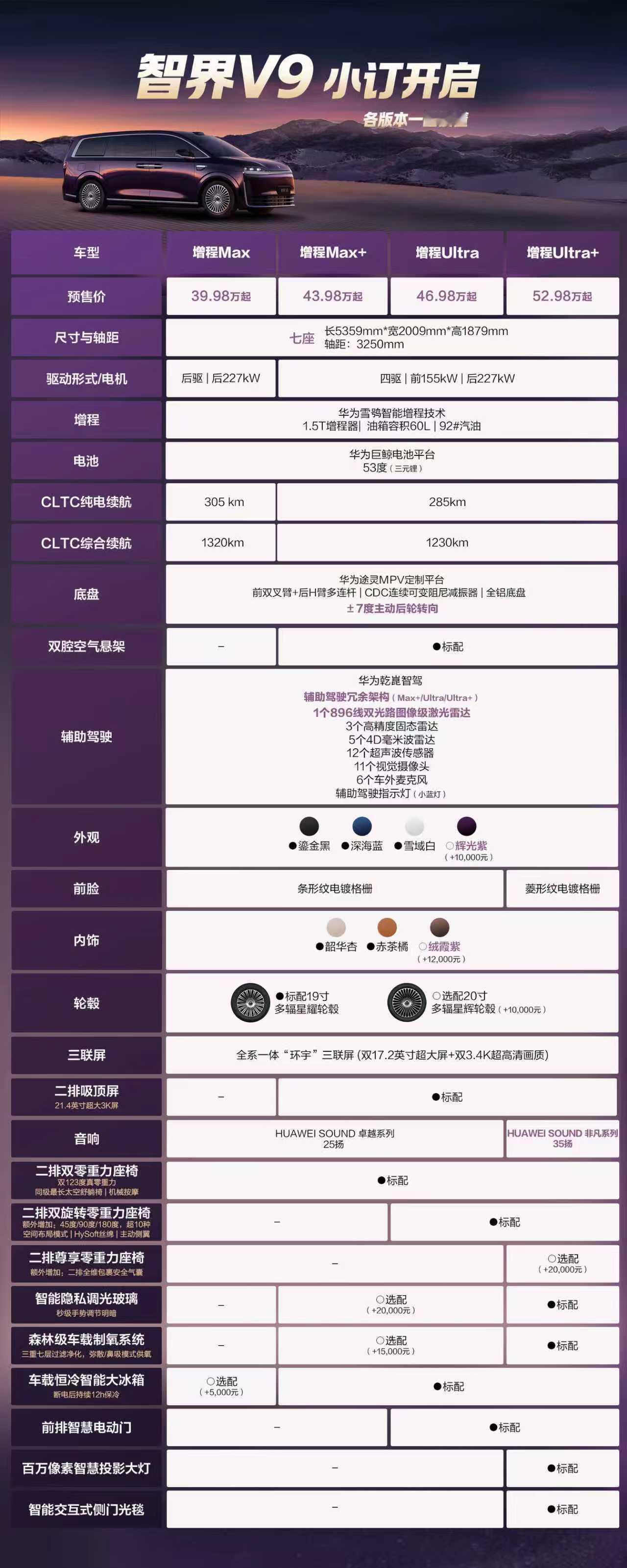 华为又放大招了!余承东官宣智界V9预售价39.98万元起,首款旗舰MPV诚意满满。智界V9预售价39.98万起,售价区间39.98~52.98万元,从入门到顶配全覆盖。