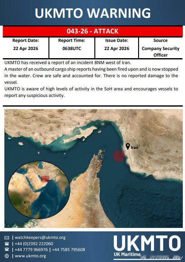 UKMTO 报告:伊朗方面接连向两艘船只开火。这两起事件相隔数小时内。
