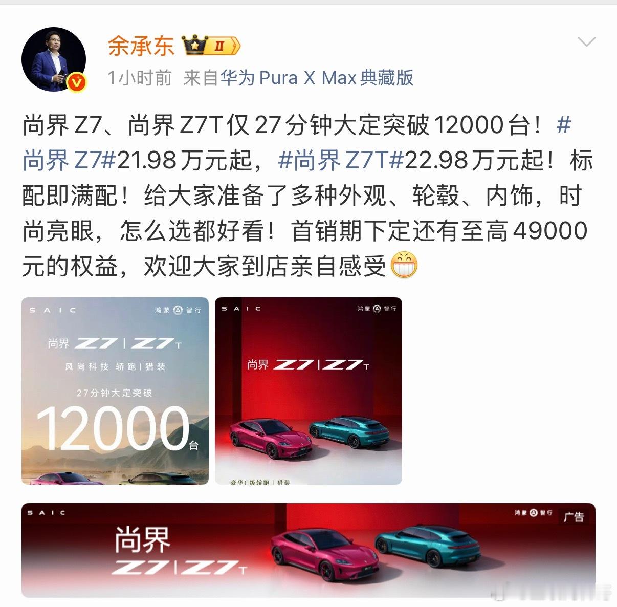 智界V9:预售1小时,订单突破12500台问界M9系列:预订1小时,订单突破11500台尚界Z7/Z7T:大定27分钟,订单突破12000台问界M6:大定15分钟,订单突破10000台