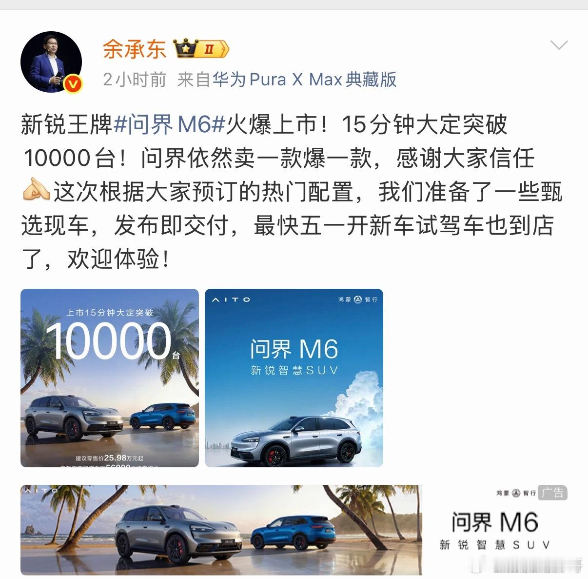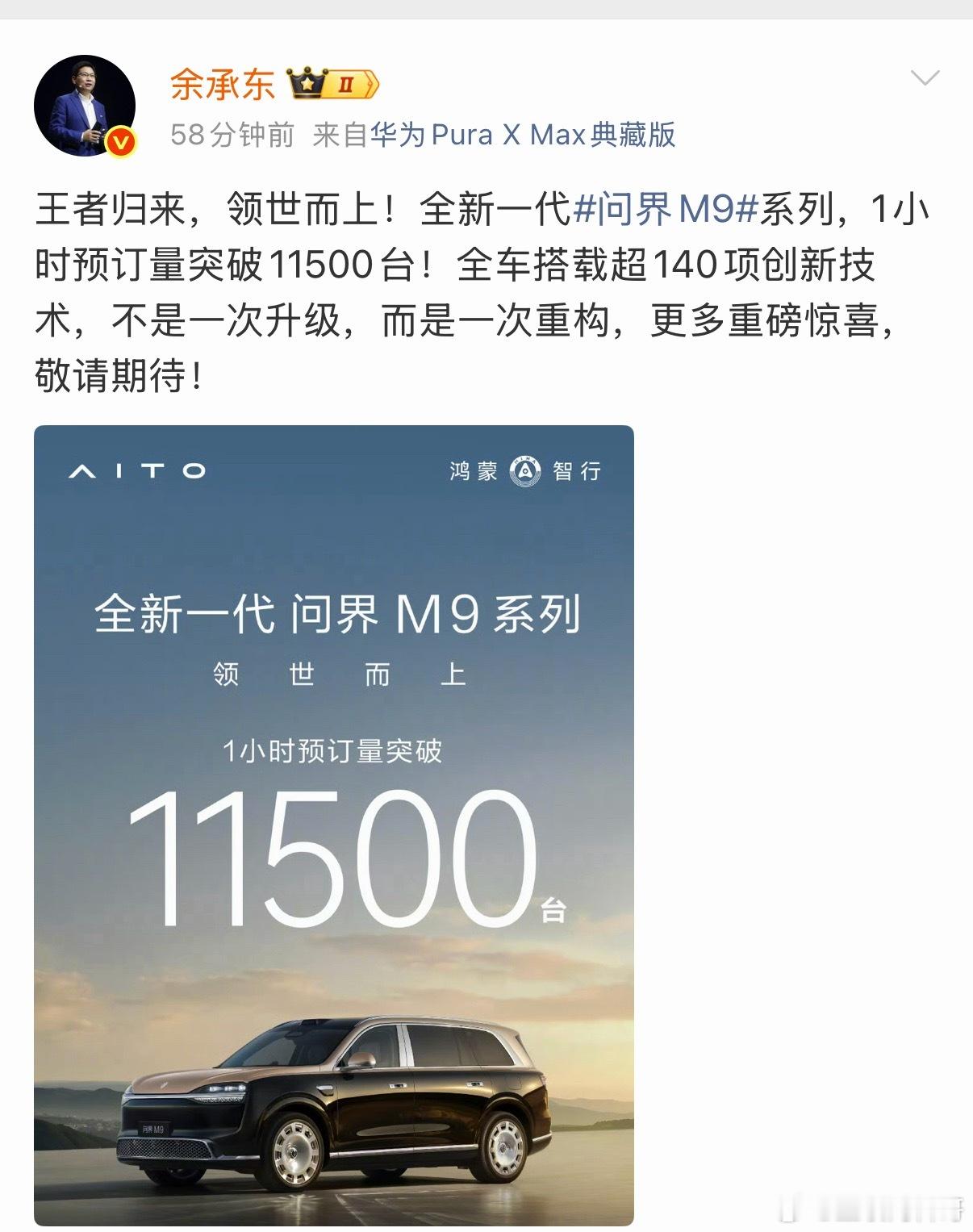 沸腾了!深夜余承东按捺不住,连发四大捷报!赢麻了!智界V9:预售1小时,订单突破