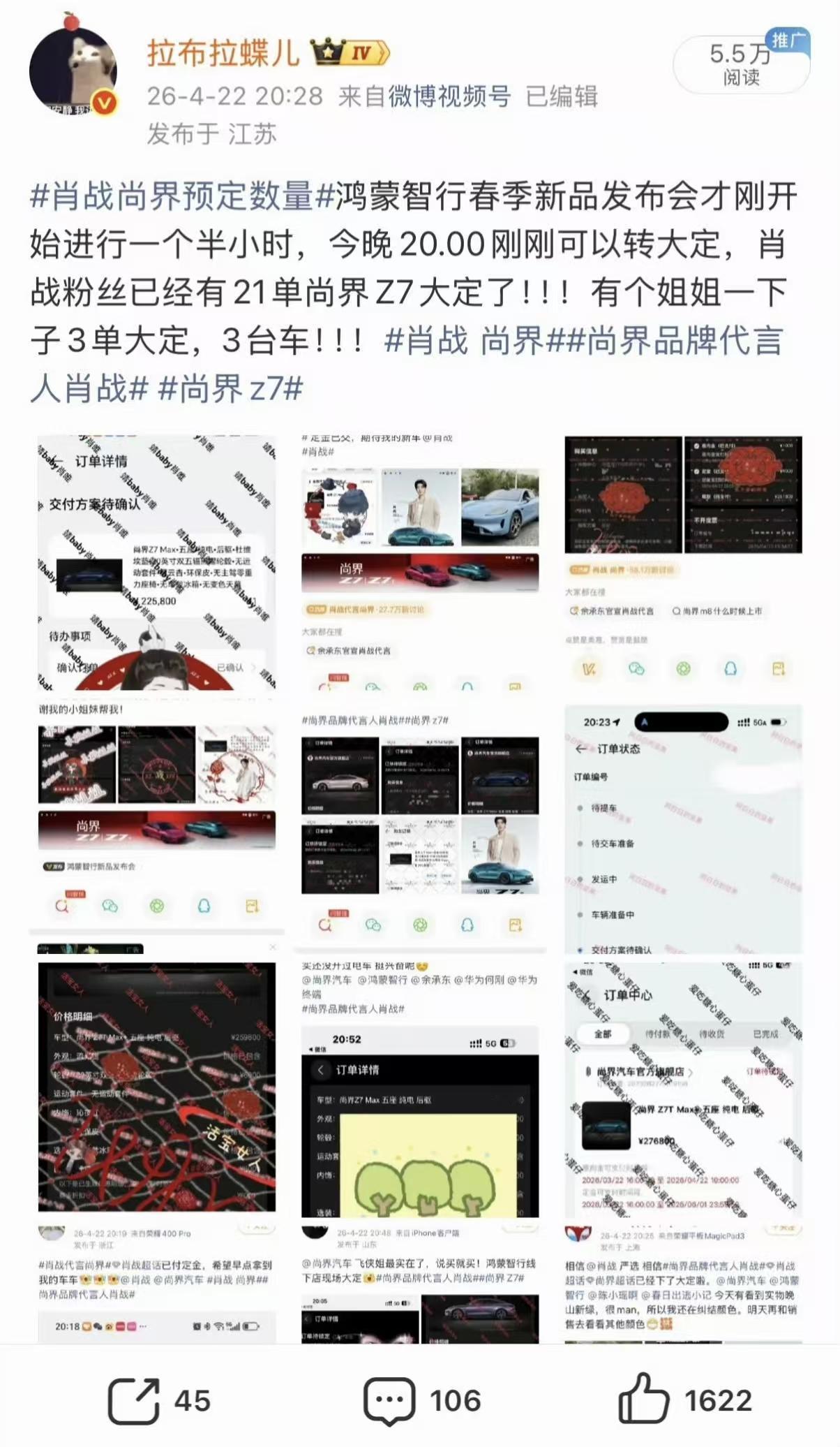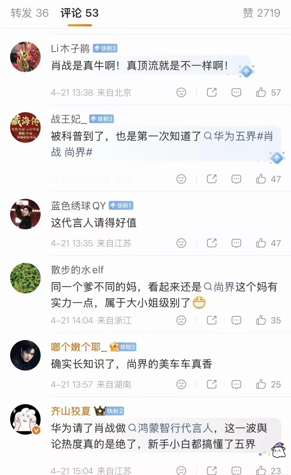 最重要的是,肖战代言尚界,不仅让尚界汽车出圈,连鸿蒙智行旗下的其它界品牌都扩大了声量,很多人表示,肖战代言尚界汽车之后,才知道华为鸿蒙智行有那么多好车。