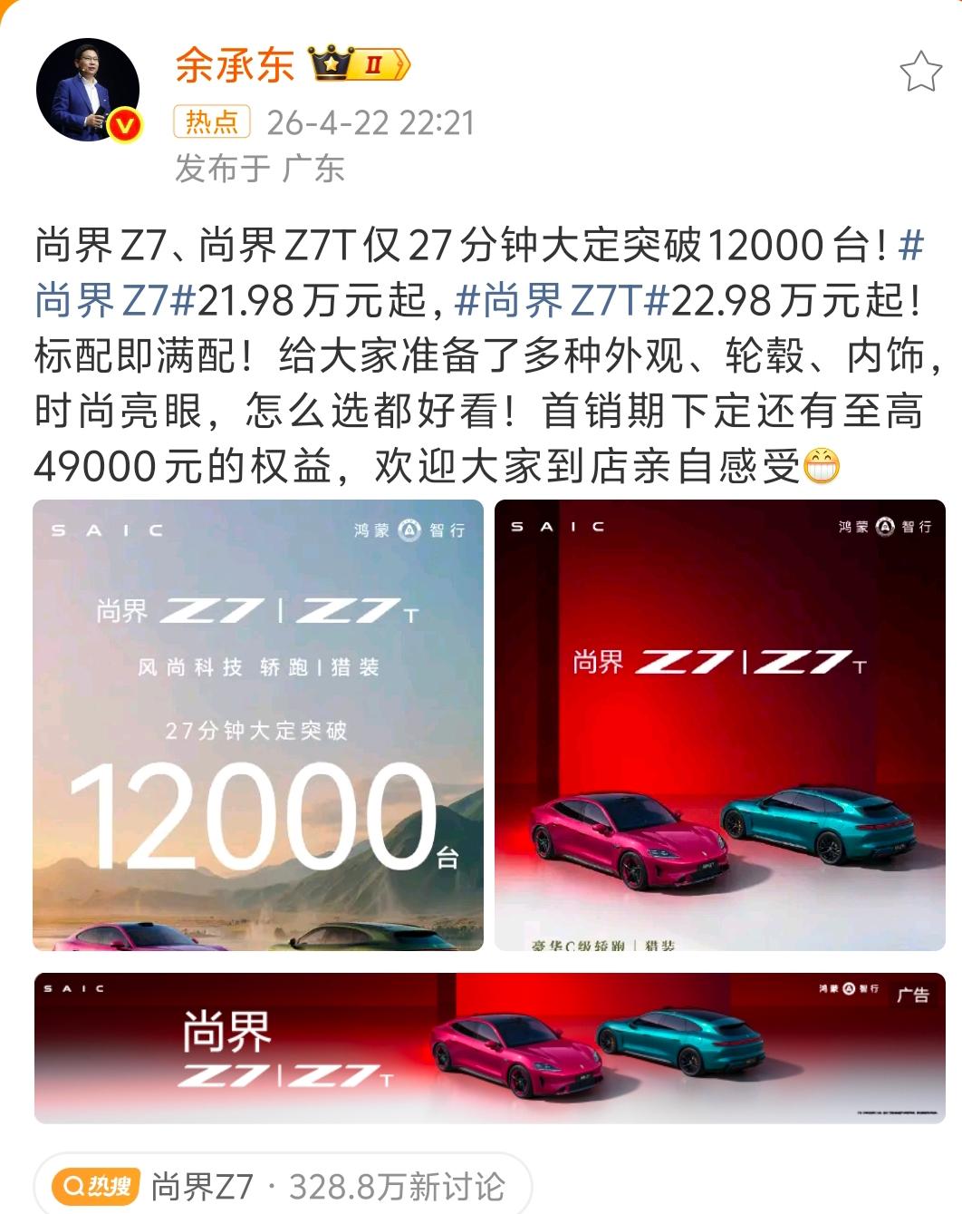 余承东官宣尚界Z7和Z7T27分钟大定数量突破12000台之后,他的评论区里便涌进了数十位肖战粉丝,都是来向余总凡尔赛自己下订尚界Z7和Z7T订单的。