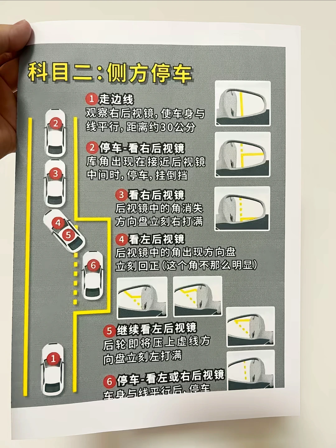 3 观察左后视镜左侧后视镜下沿与停止线重合,右打满