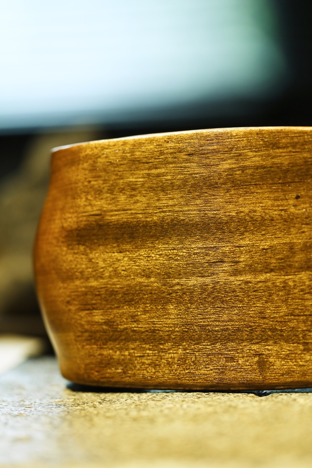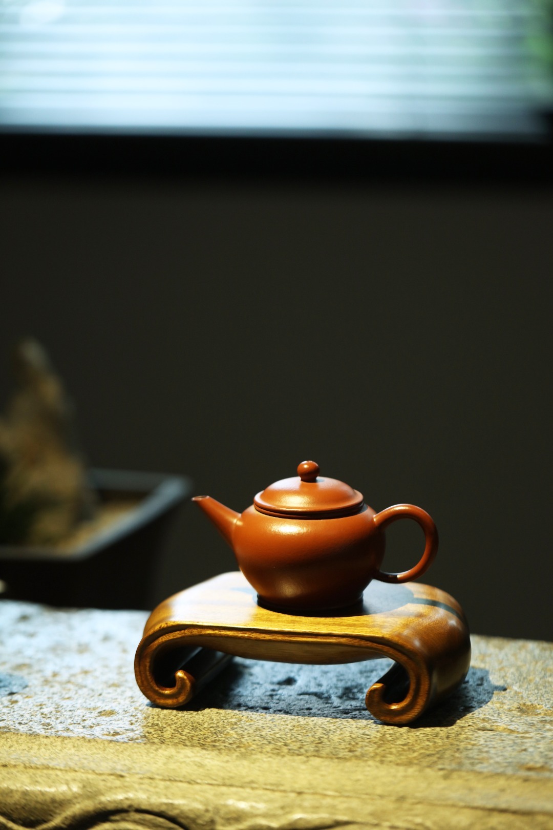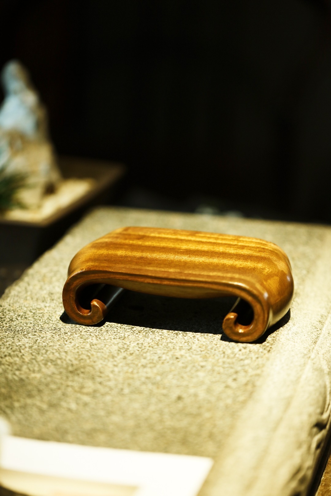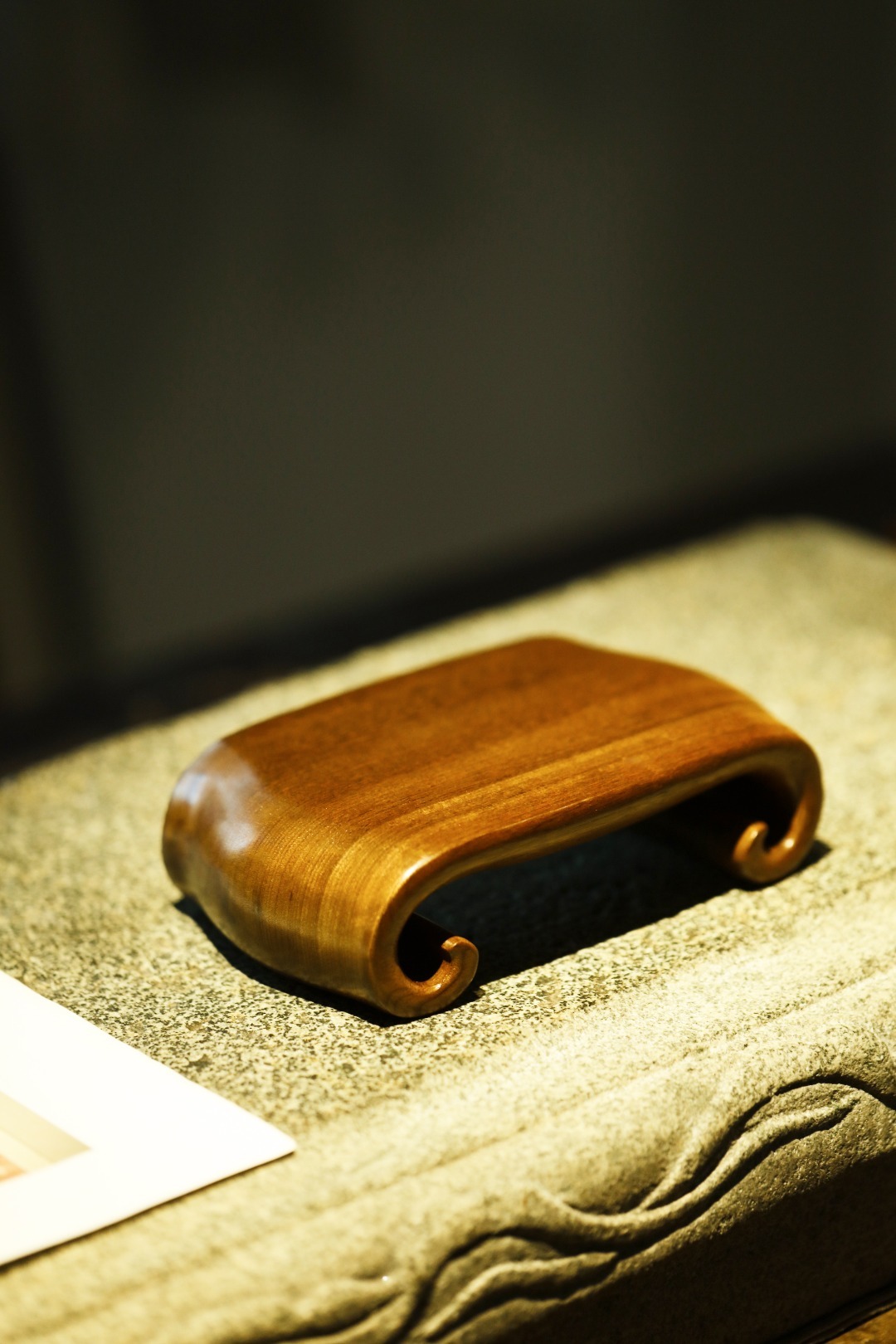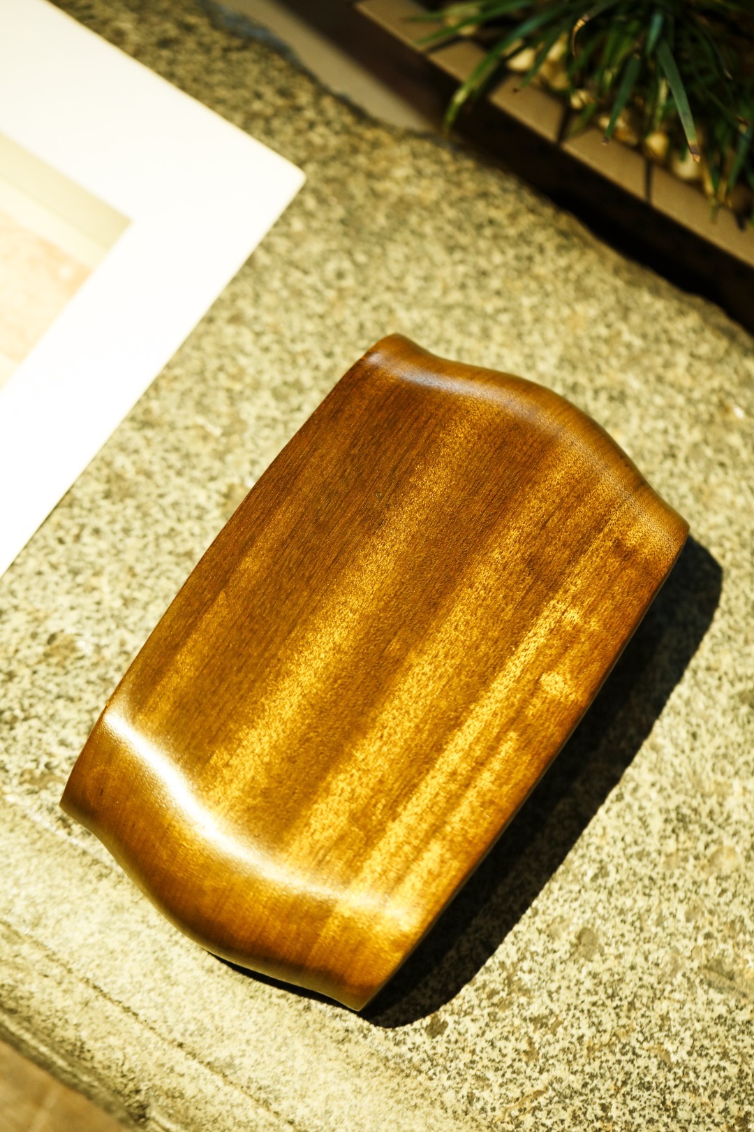 取材金丝楠阴沉木,一木制成卷书式,料质温润细腻,底座几面平坦,可作壶承,亦可承放雅玩、实用冶美。