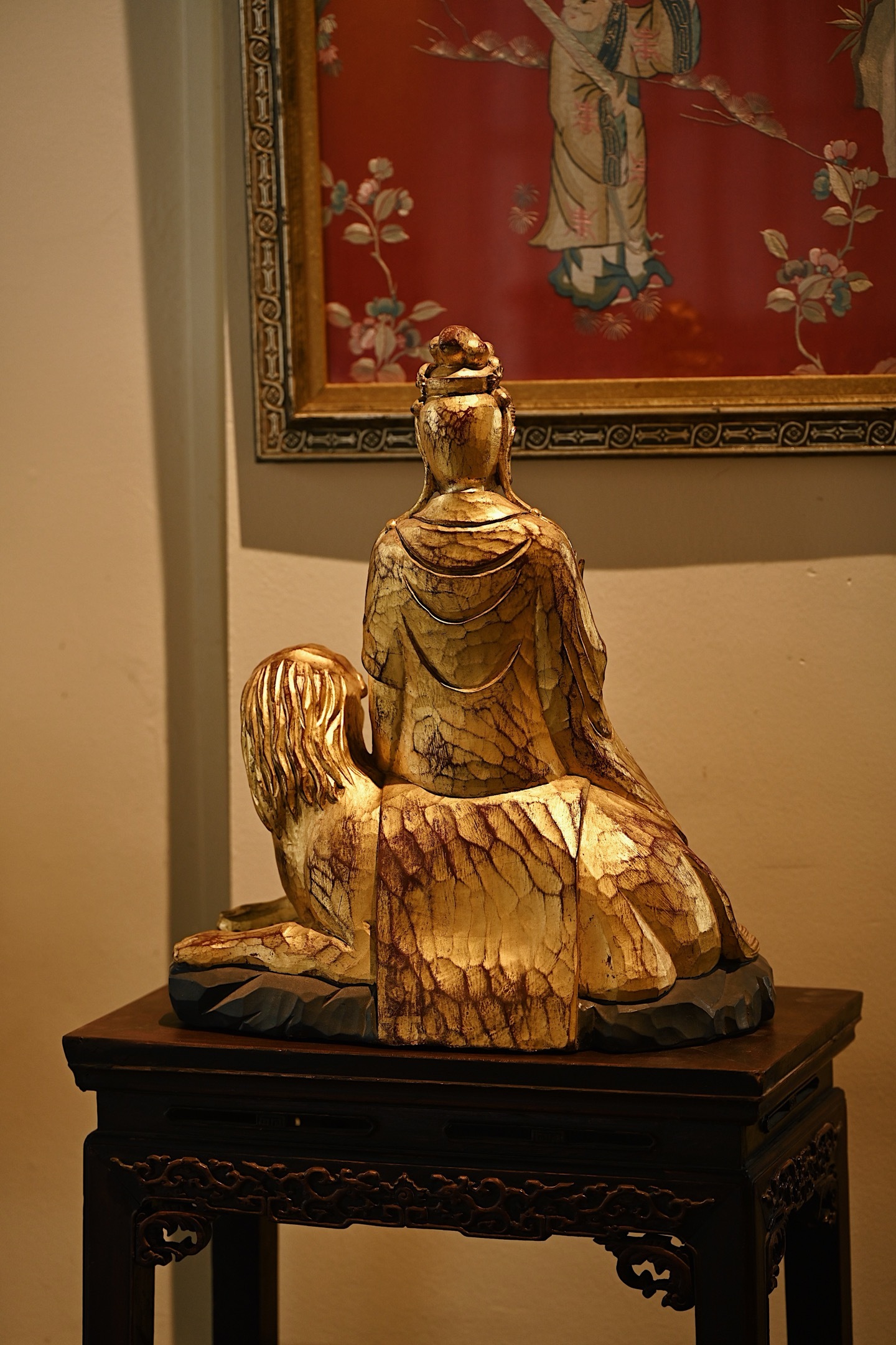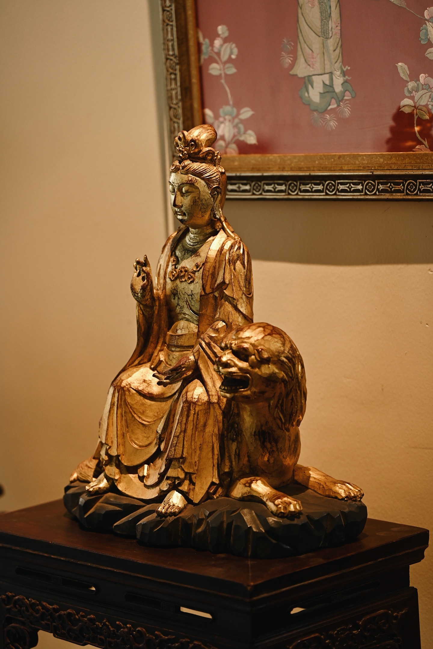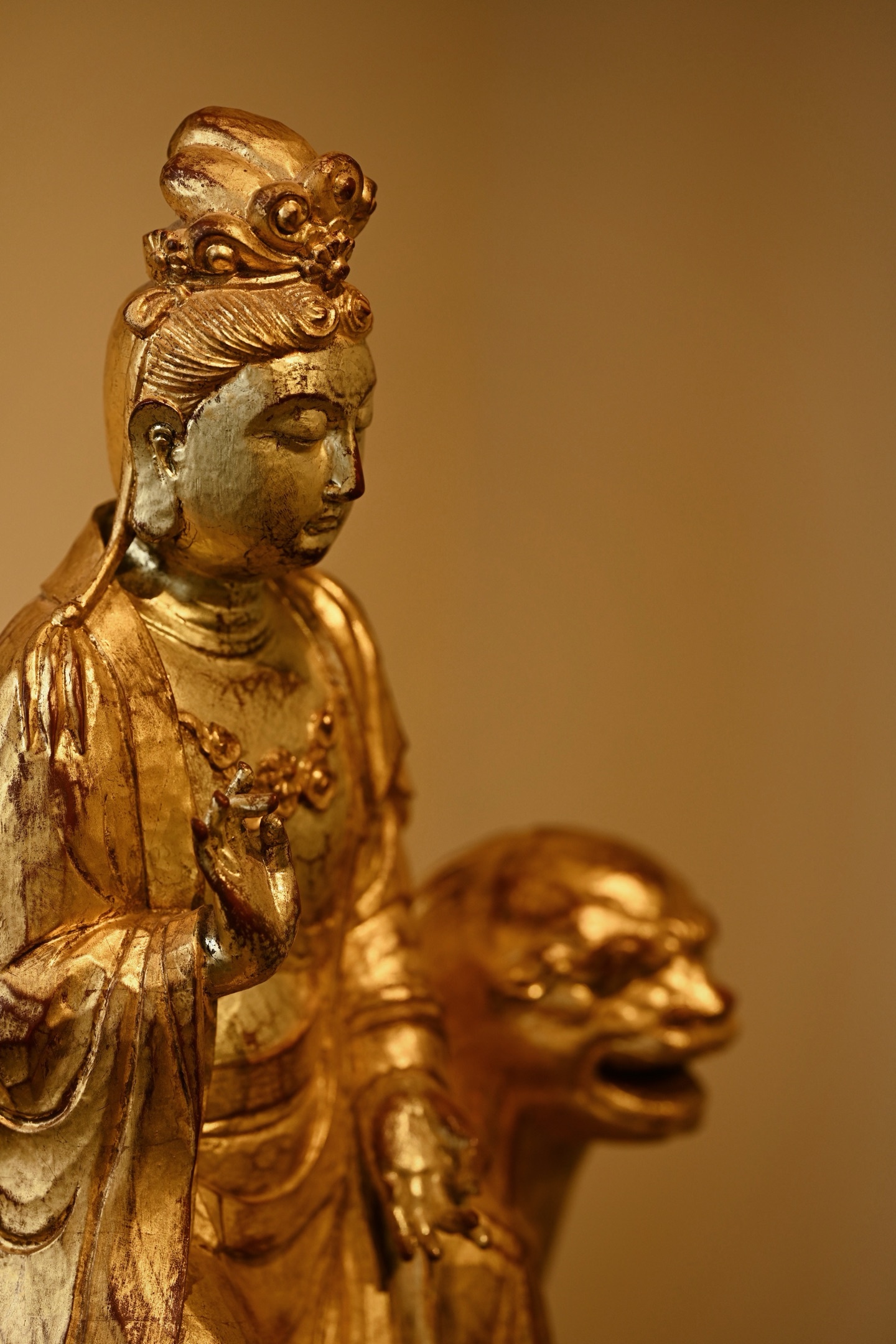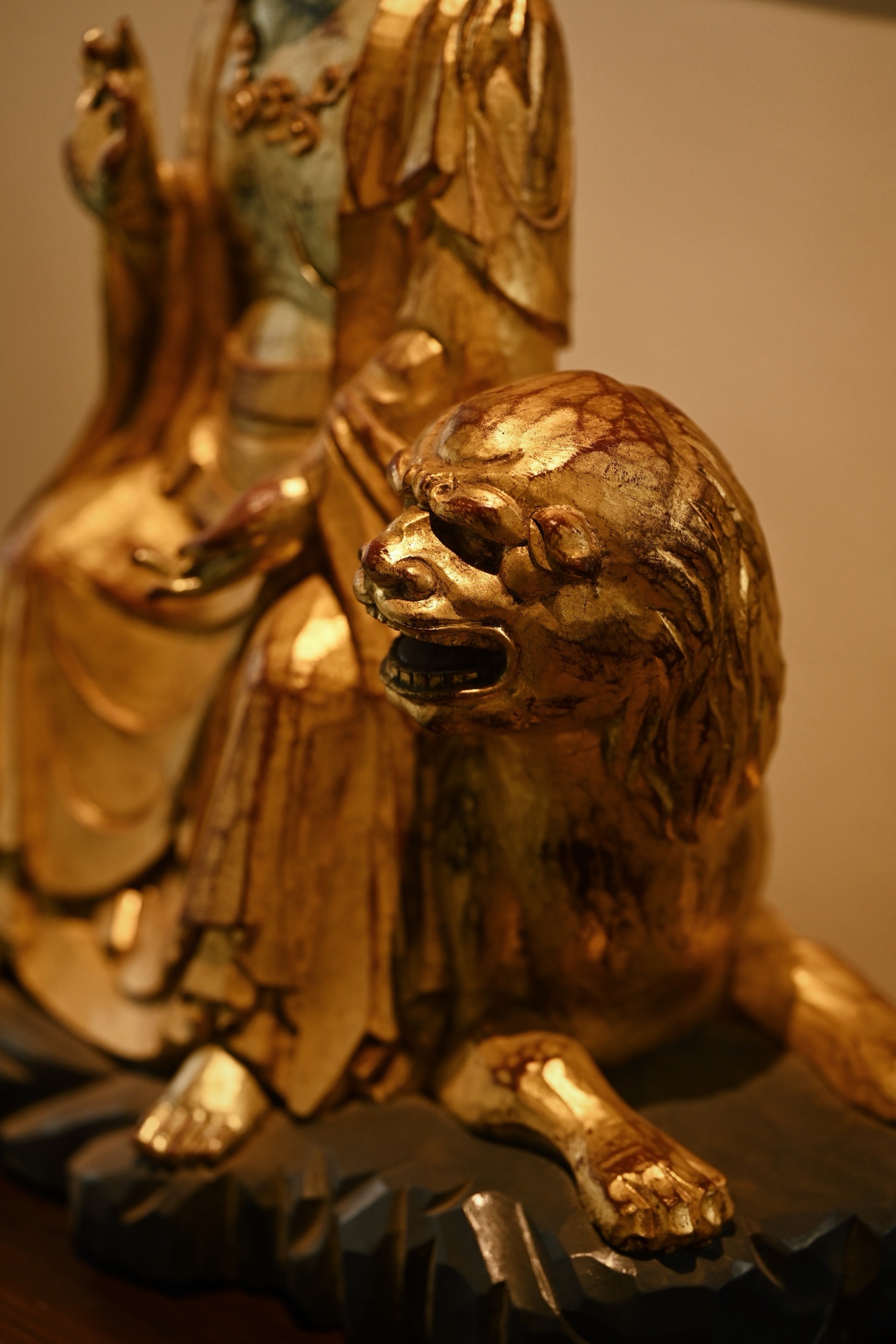 造像通体髹金,金泽温润内敛,造斑驳之感,文殊菩萨面容宁静慈悲,眉如弯月,双目微阖,神态安详。头戴宝冠,胸饰璎珞,身着天衣,线条婉转流畅,右手结印,左手轻搭膝上,姿态优雅,青狮伏卧于山石台座之上,鬃毛卷曲,神态威猛。可奉于案头,亦可陈置于雅室,静沐禅光。