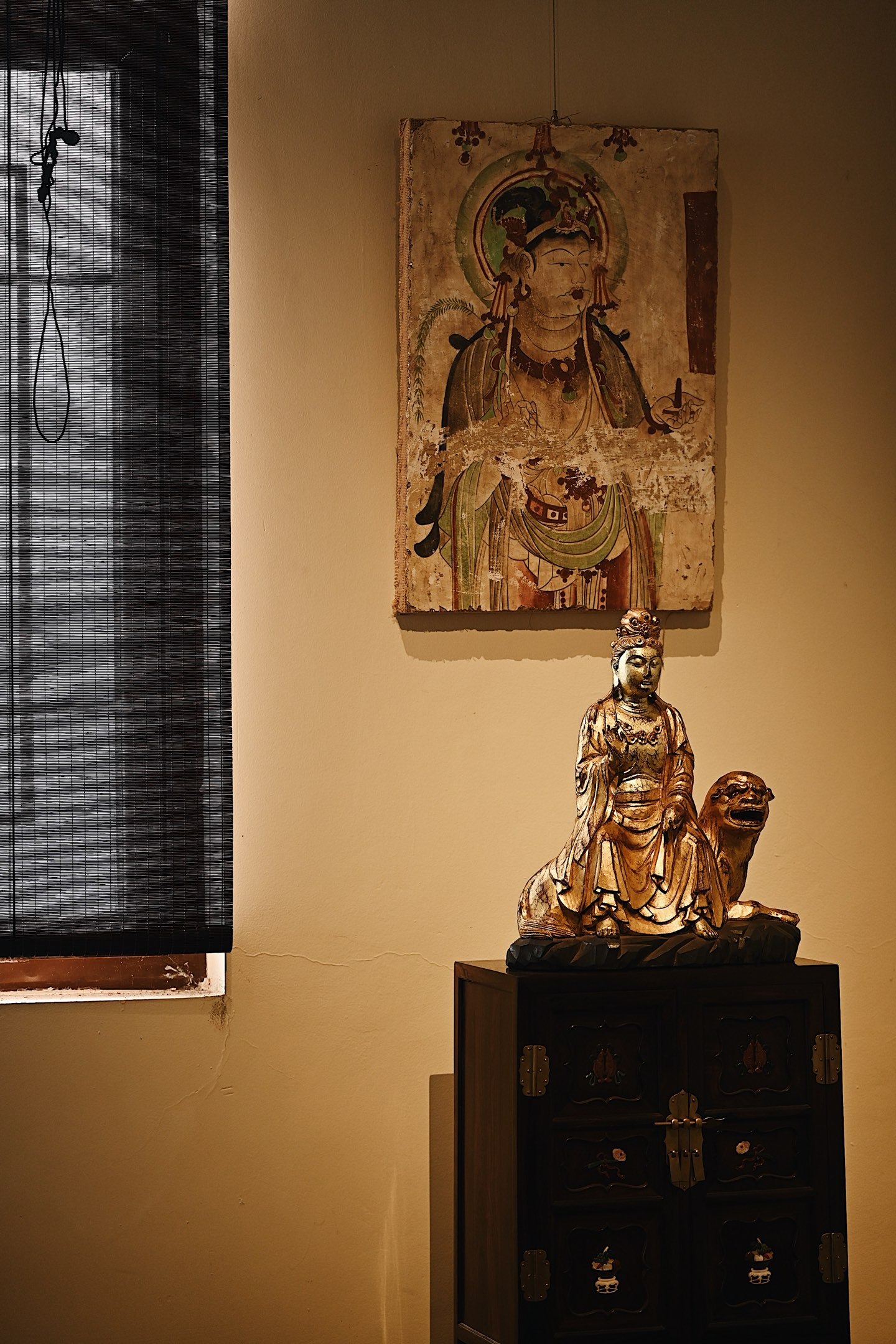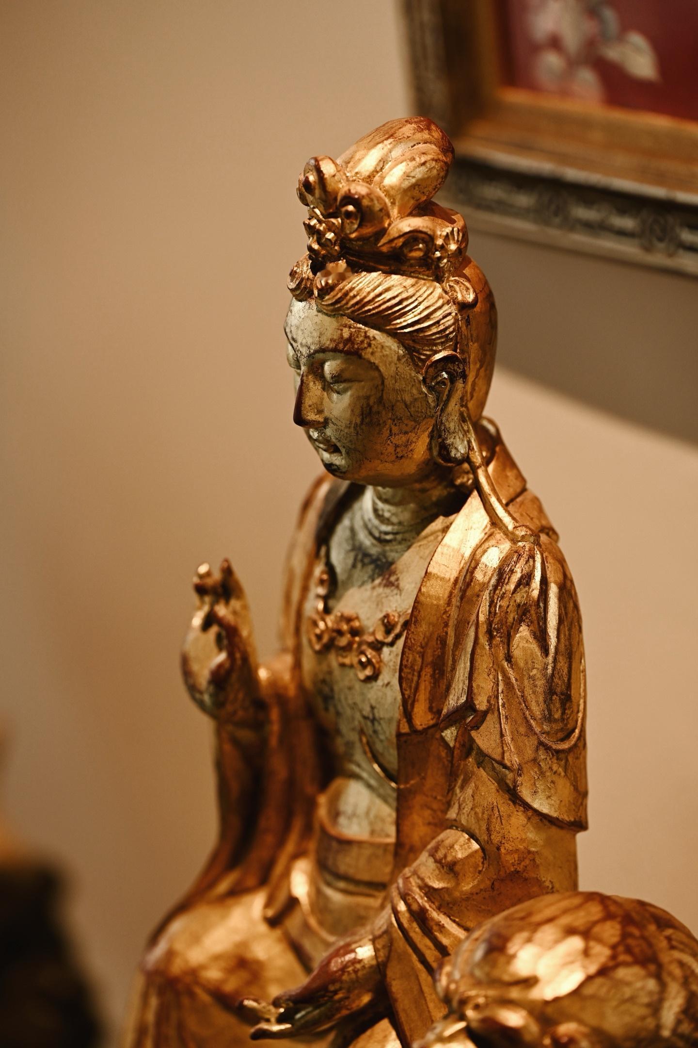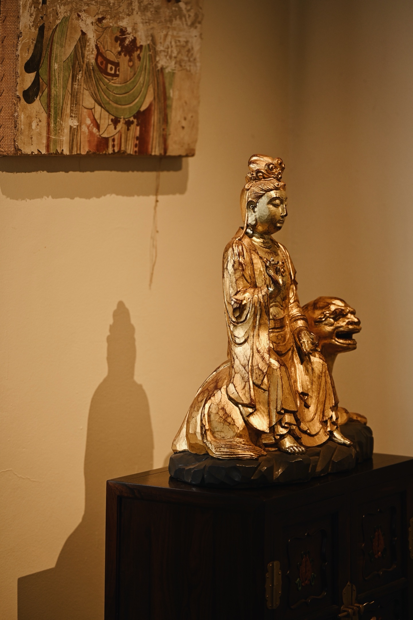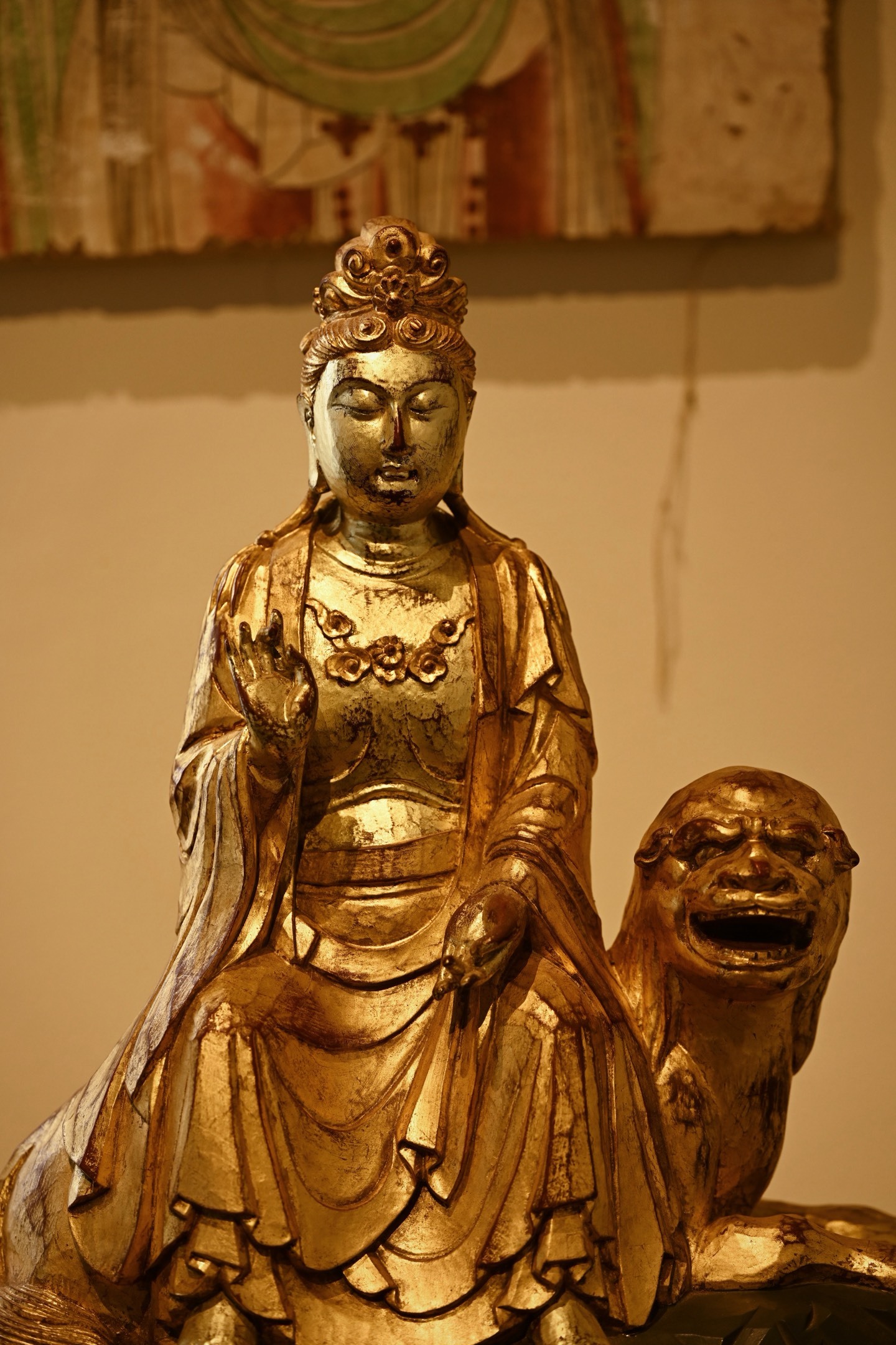 造像通体髹金,金泽温润内敛,造斑驳之感,文殊菩萨面容宁静慈悲,眉如弯月,双目微阖,神态安详。头戴宝冠,胸饰璎珞,身着天衣,线条婉转流畅,右手结印,左手轻搭膝上,姿态优雅,青狮伏卧于山石台座之上,鬃毛卷曲,神态威猛。可奉于案头,亦可陈置于雅室,静沐禅光。