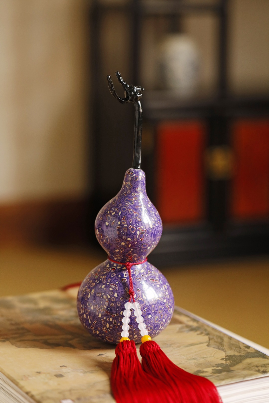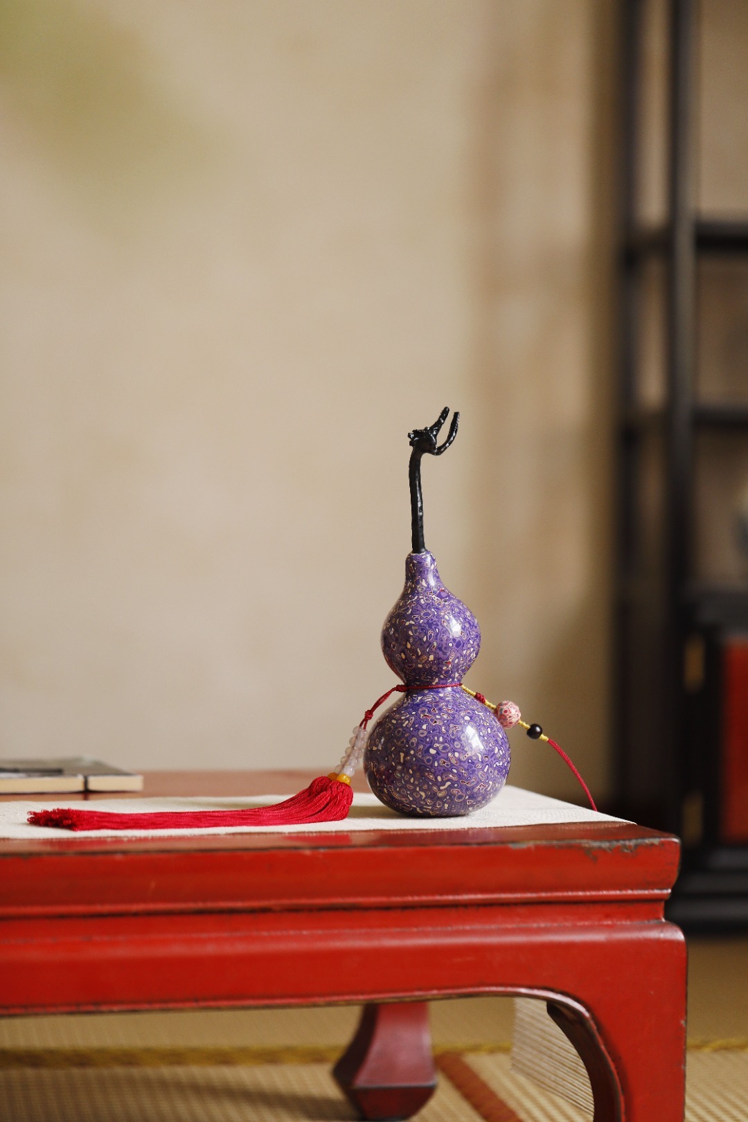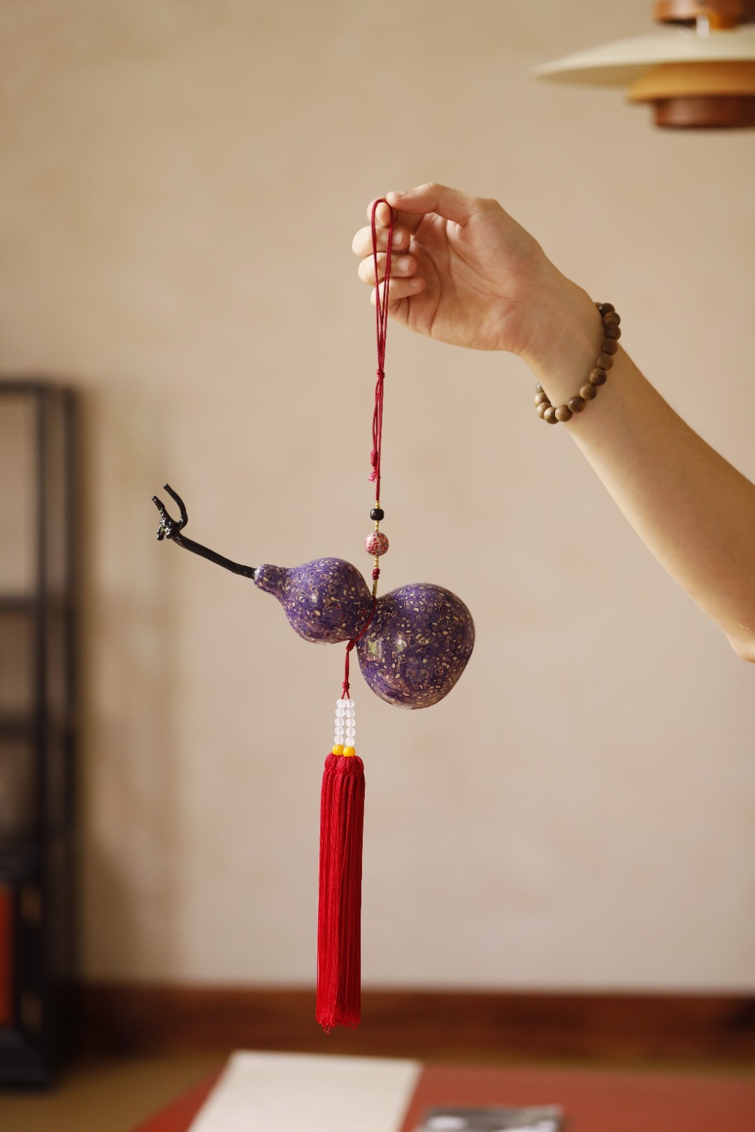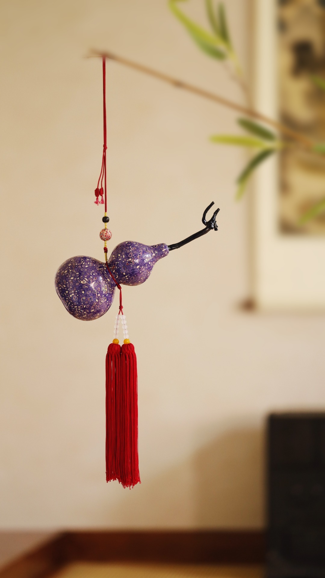家有葫芦一个,一生福禄平安!选取天然葫芦,手工髹漆,以紫漆为底,配以宫廷风黄色流苏,复古绚丽,色泽灿烂。