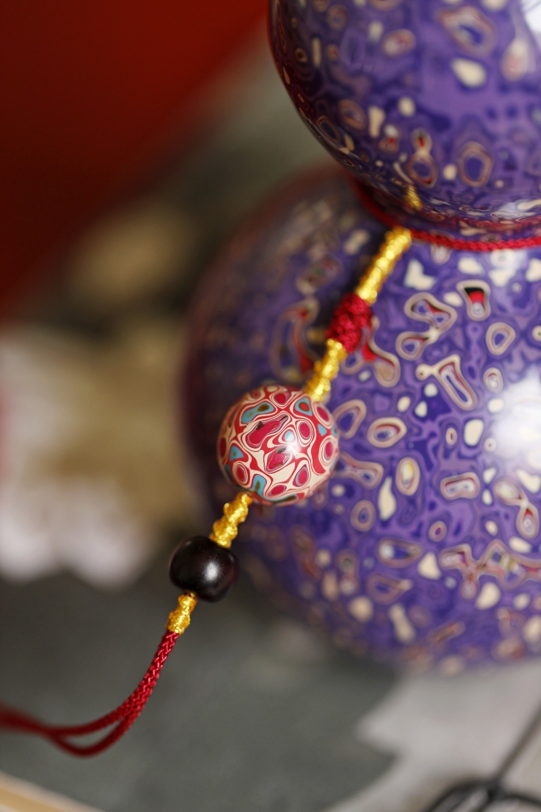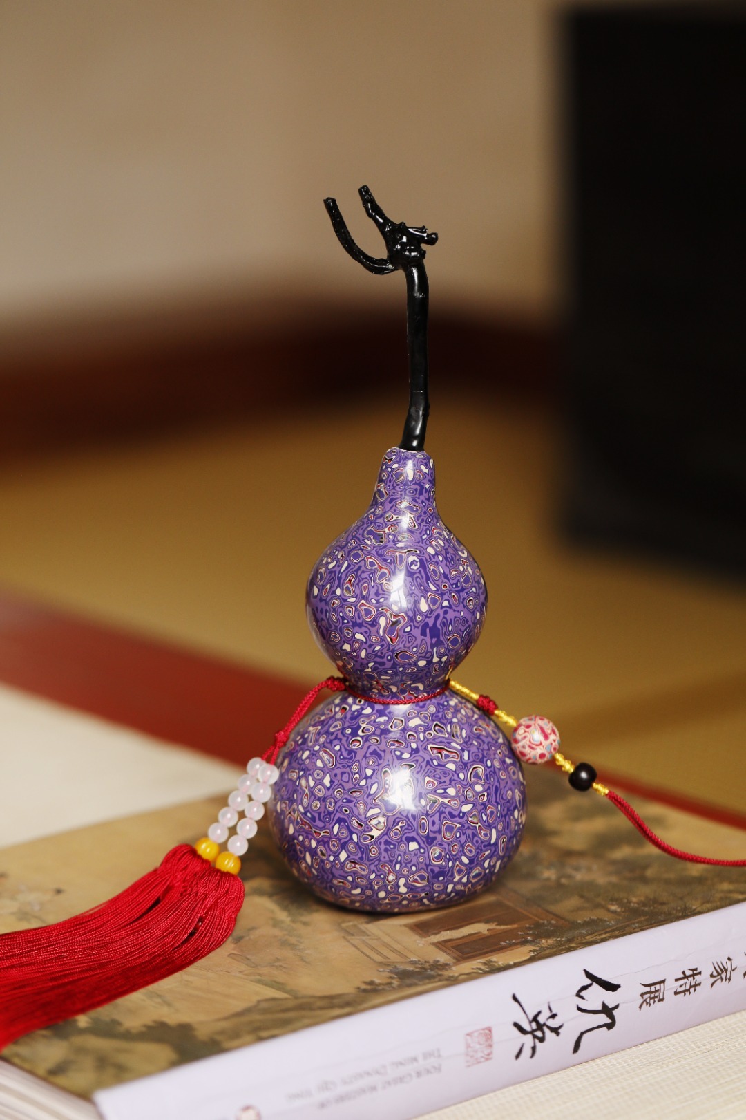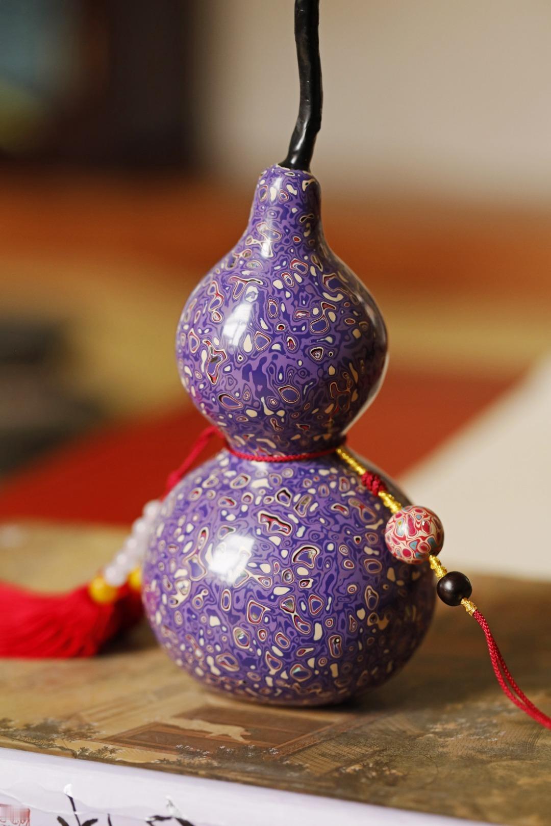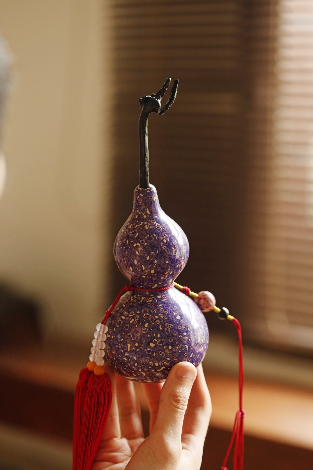 家有葫芦一个,一生福禄平安!选取天然葫芦,手工髹漆,以紫漆为底,配以宫廷风黄色流苏,复古绚丽,色泽灿烂。