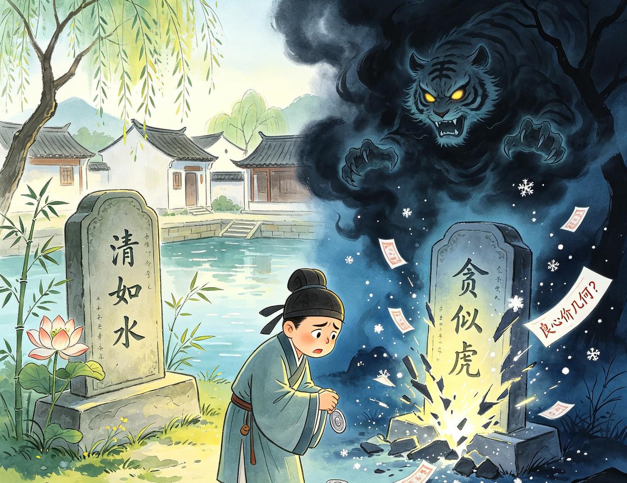 P图墓·贰:江南有“P图墓”,碑文皆美化。贪官墓刻“清如水”,实则搜刮民脂。夜有鬼哭,碑文渐隐,显“贪似虎”。其子欲重修,碑突裂,飞出纸钱,上书“良心价几何?”其子惭,散财济贫,碑文渐显“善”字。方知“良心”二字,才是最好的碑文。
