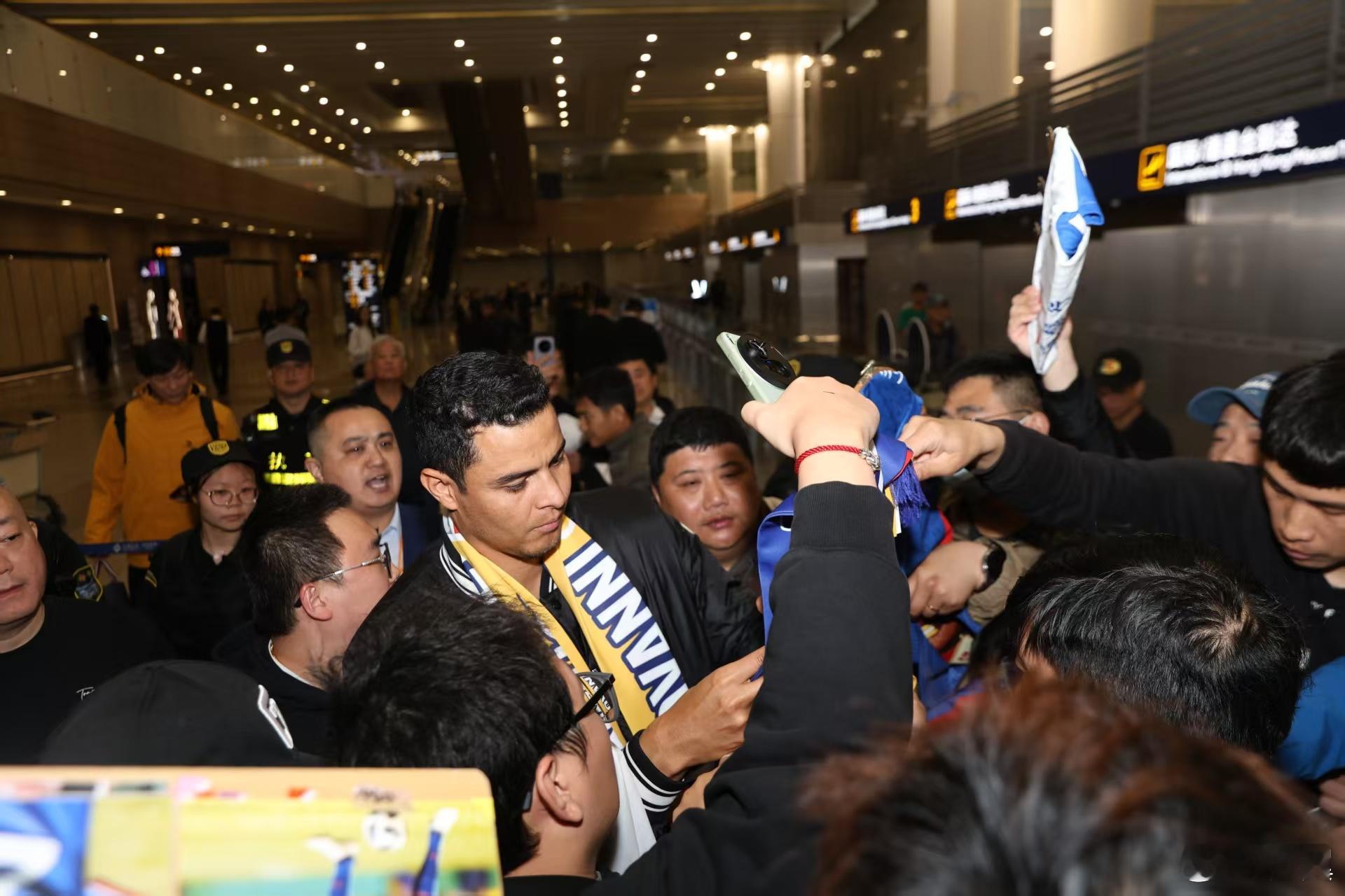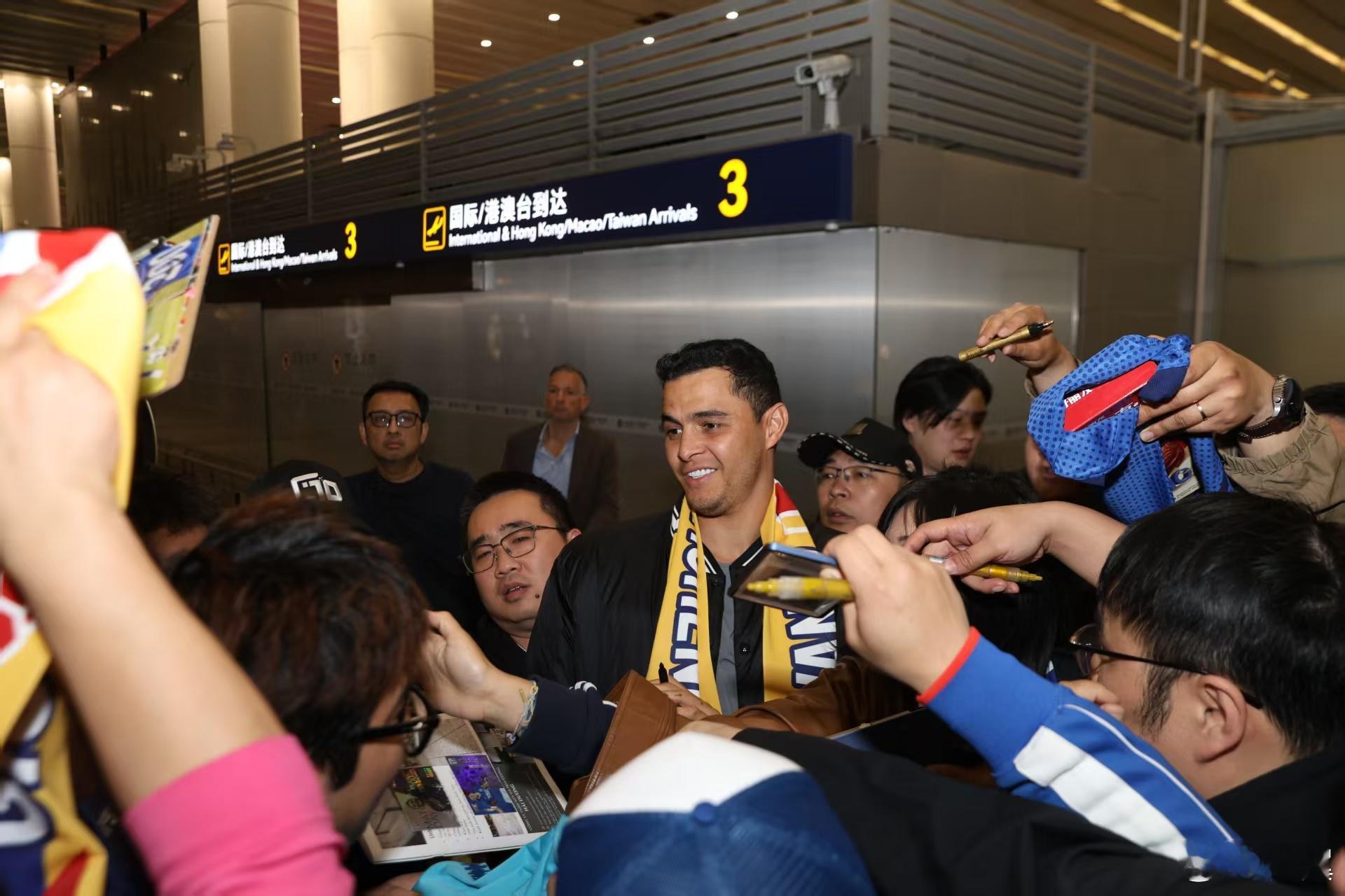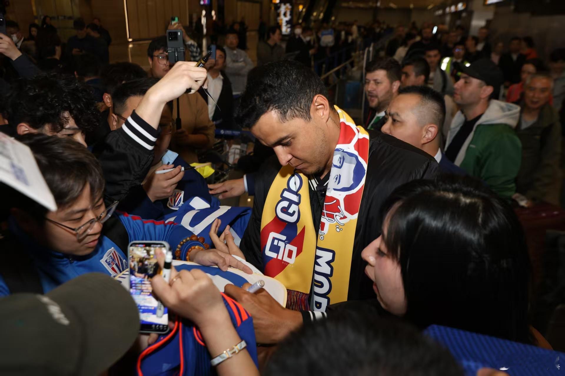 在昨晚申花队与青岛海牛的比赛开始前,前上海申花队队长吉奥·莫雷诺乘坐的东航MU710航班也从西班牙首都马德里起飞,飞往上海。经过了约12个小时的长途飞行后,飞机在今天早上5点52分降落在上海浦东机场。经过了约1个多小时的等待后,莫雷诺和他的太太,终于出现在了浦东机场1号航站楼等候他的球迷们视线中。看到数百名熬夜守候在机场等待他的申花球迷,莫雷诺也是非常感动,他一一满足了所有球迷的签名合影需求。莫雷诺表示:“非常感谢所有球迷到机场来等我,他们非常辛苦,等了我很久,我非常感动非常开心。我非常激动,明天就要和大家见面了。希望明天大家都能来看我的比赛,能够到现场,我非常的感动。接下来我要好好休息一下,准备明晚的比赛。”上海申花