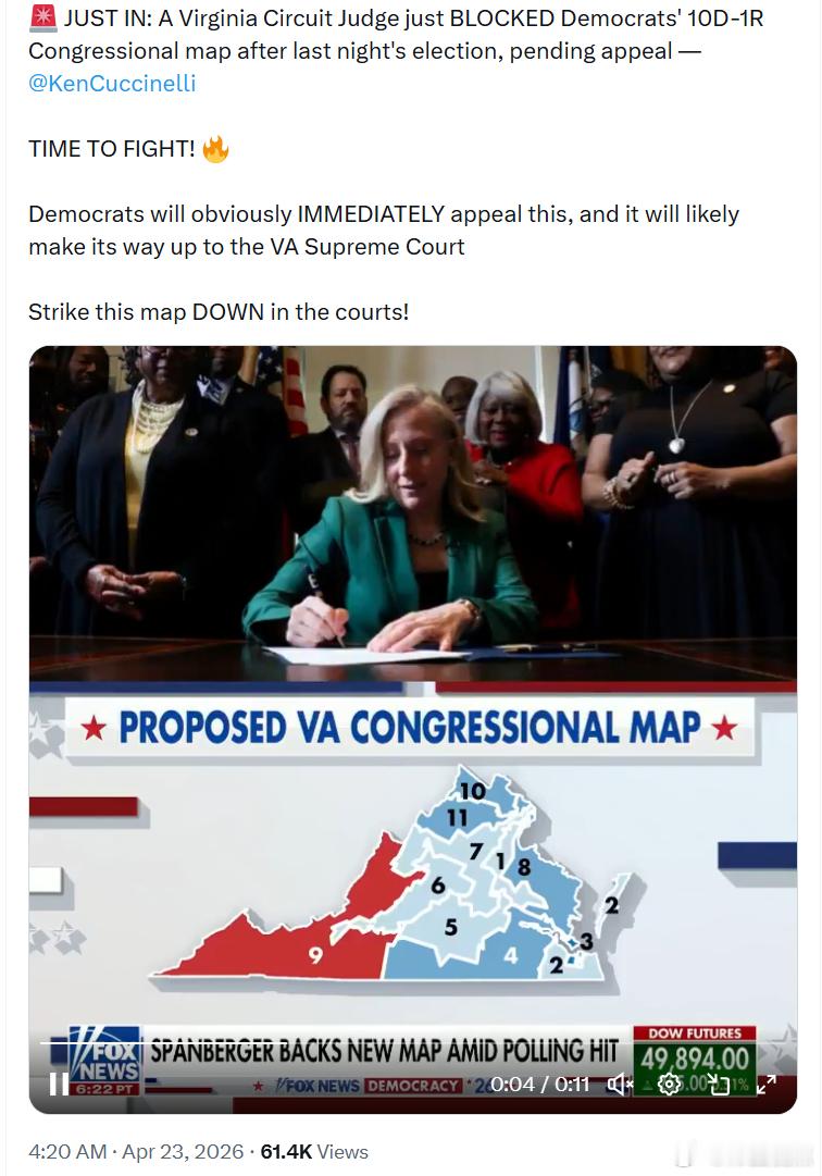 弗吉尼亚州一名巡回法院法官刚刚阻止了民左党提出的10-1国会选区地图,该裁决是在昨晚选举后做出的,目前等待上诉 ——