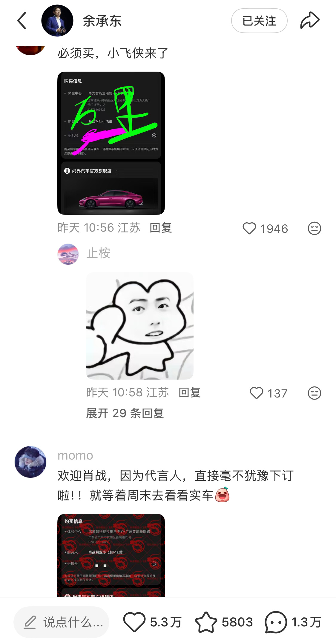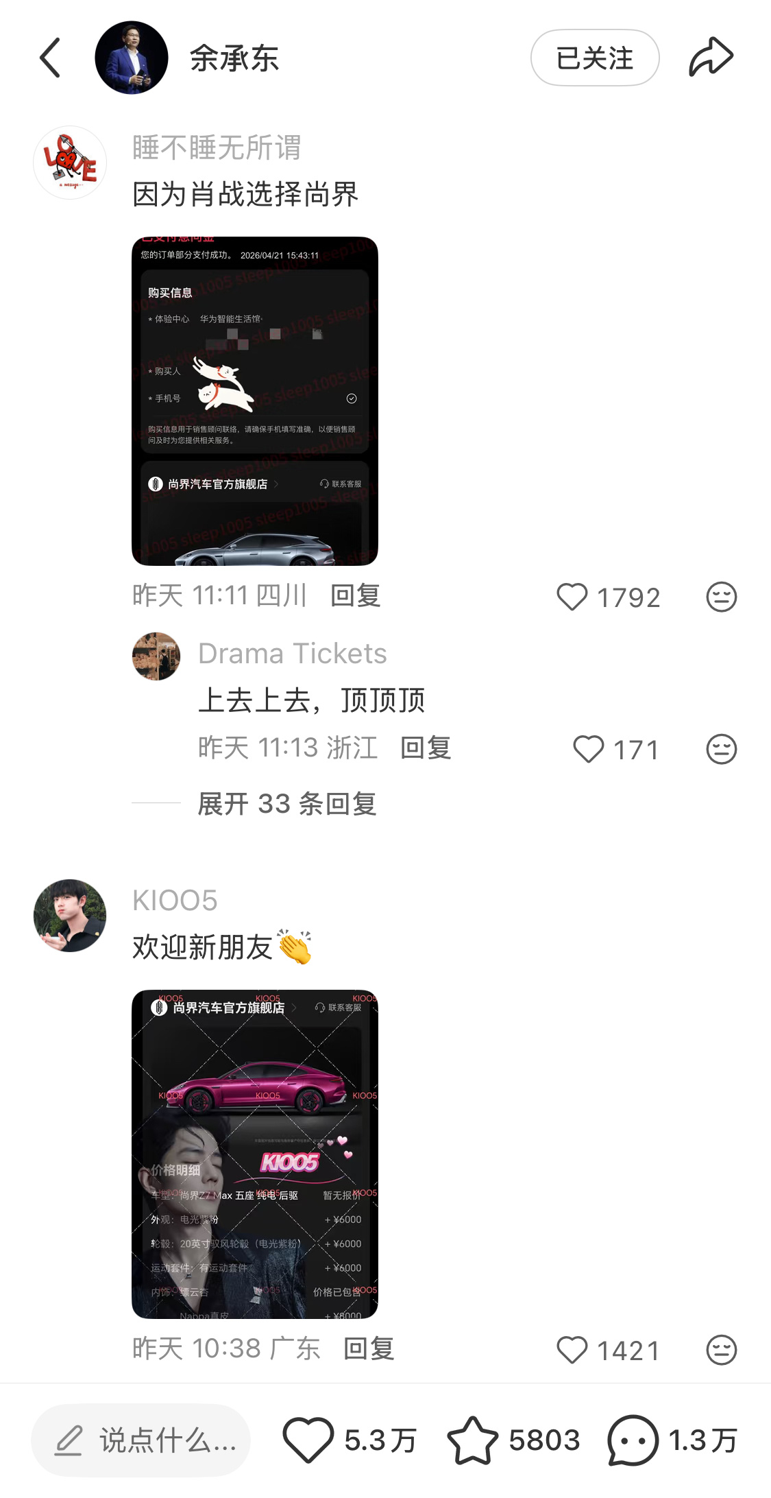 尚界找肖战代言,简直天作之合,不仅品牌定位契合,肖战代言的含金量也非常的高,他是真能带动产品销量。昨天,不少粉丝在余承东的社交账号下,疯狂晒下单截图。这可是一辆20多万的车,购买力太强了吧!建议以后车企都按尚界这个标准请代言人,都是实实在在的转化,谁看了不流哈喇子。