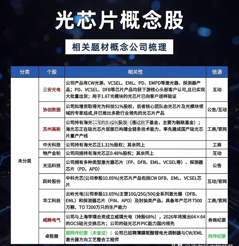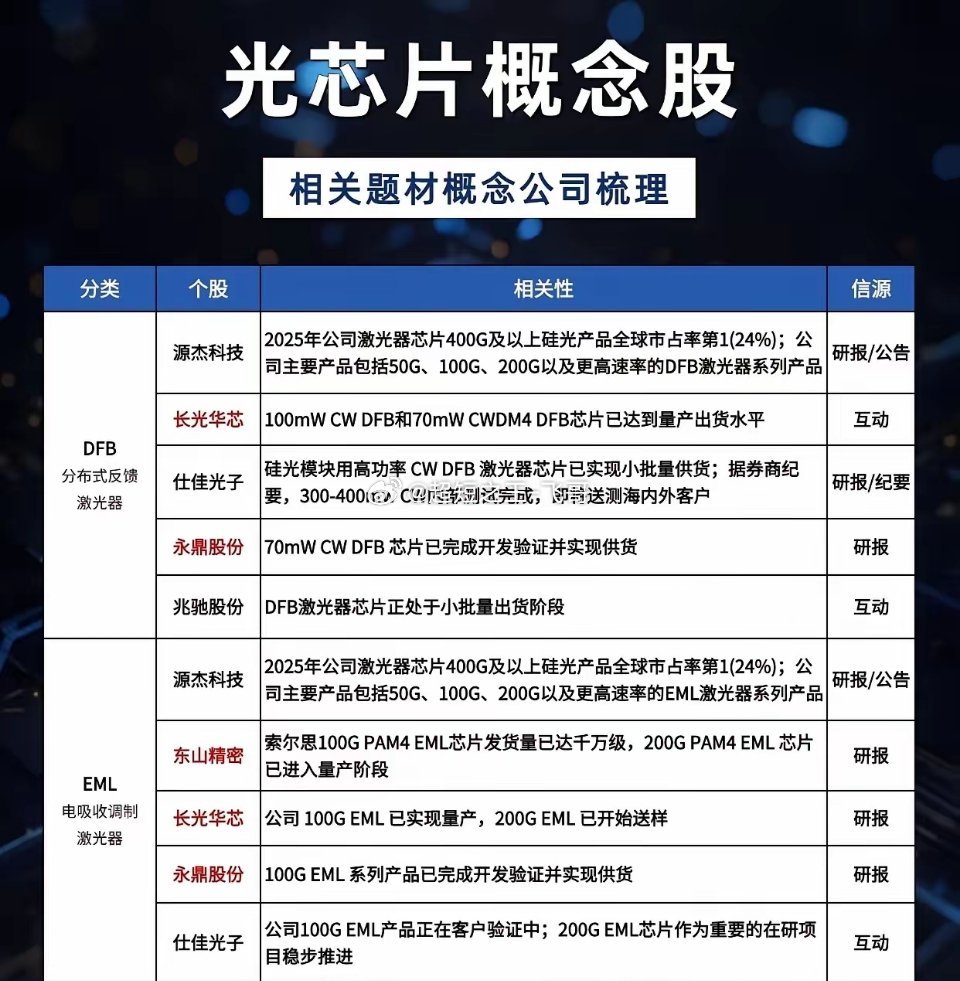 光芯片,AI算力的“心脏”,谁能跑出中国芯?当AI算力竞赛进入白热化,光模块的高速迭代背后,藏着一个决定性能上限的“隐形王者”——光芯片。你可能不知道,一枚400G光模块中,光芯片成本占比超40%,而高端光芯片长期被海外巨头垄断。如今,国产替代的浪潮正加速袭来,谁能拿下这颗“心脏”,谁就能抢占算力时代的话语权?一、核心逻辑:算力爆发,倒逼国产突破AI大模型训练对带宽的需求呈指数级增长,推动光模块从400G向800G、1.6T升级,而光芯片正是实现高速传输的核心。此前,高端EML、DFB芯片依赖进口,国内厂商长期受制于人。但随着国内厂商在材料、工艺上的突破,从源杰科技400G以上硅光产品全球市占率24%,到长光华芯实现100G/200G EML量产送样,国产光芯片正加速从0到1、从1到N的跨越。二、产业链全景:从DFB到EML,国产梯队初成型当前光芯片赛道,正按技术路线形成清晰的国产梯队:DFB激光器:源杰科技以400G+硅光产品领跑,仕佳光子、永鼎股份实现中功率芯片供货,兆驰股份进入小批量出货阶段; EML激光器:源杰科技、长光华芯、东山精密实现100G量产,200G产品送样或进入产线,仕佳光子、永鼎股份稳步推进; VCSEL/APD等细分:长光华芯100G VCSEL实现量产,铭普光磁布局APD芯片,光库科技、安孚科技在薄膜铌酸锂调制器领域卡位关键技术。三、案例佐证:龙头卡位,产能与订单共振源杰科技作为行业标杆,其400G+硅光产品全球市占率已达行业第一,50G-200G DFB/EML芯片批量供货头部客户;长光华芯在DFB、EML、VCSEL三大路线全面突破,100G芯片实现大规模出货;永鼎股份70mW DFB、100G EML均完成开发验证并实现供货,成为国产替代的重要力量。光芯片赛道的本质,是一场“算力时代的国产突围战”。当前,行业正处于“从技术验证到规模化量产”的关键节点,叠加AI算力需求持续爆发,具备量产能力、客户验证进度领先的厂商,将迎来业绩与估值的双重戴维斯双击。