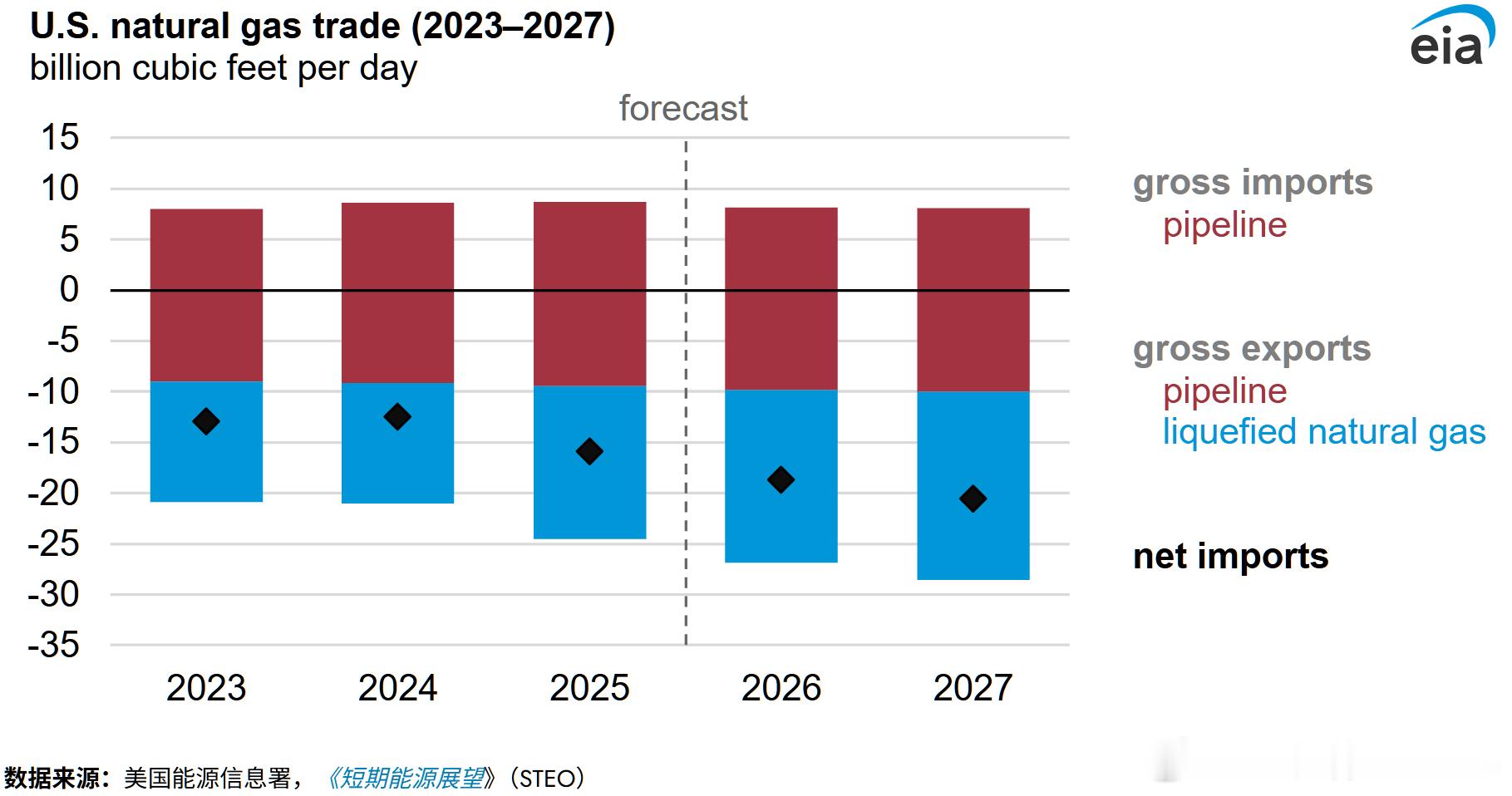 2026年美国天然气净出口量(出口量减去进口量)将增长18%,达到每日187亿立方英尺(Bcf/d)。2027年,净出口量将再增长10%,达到每日205亿立方英尺。