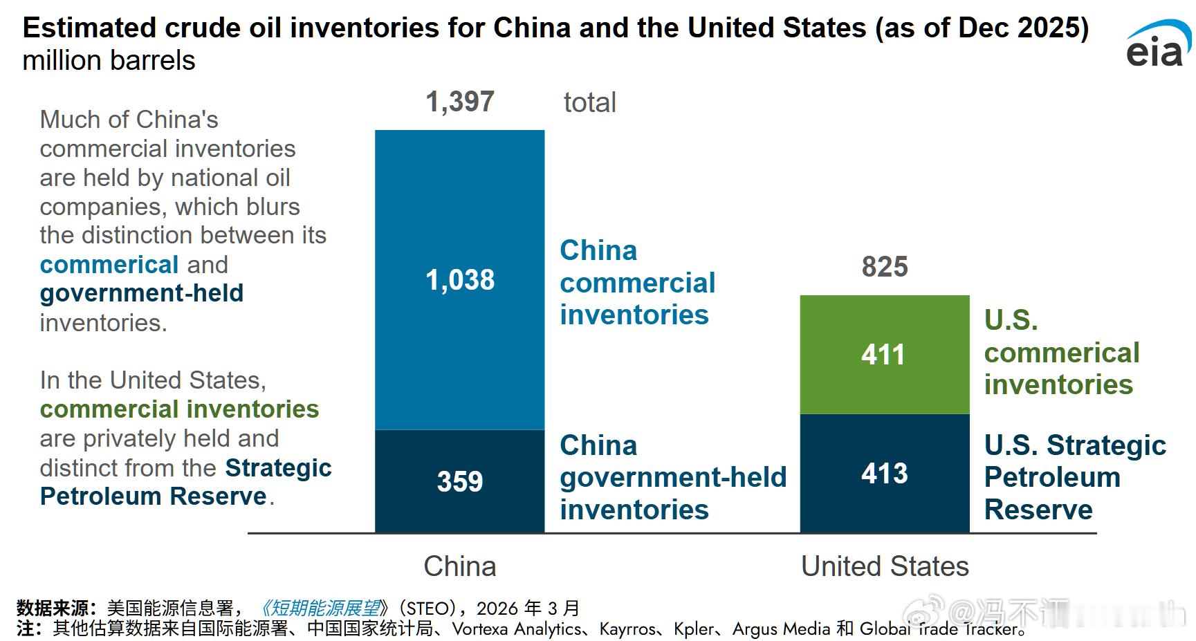 根据国际能源署的数据,2025年12月,中国政府持有的原油库存平均约为3.6亿桶,与同期美国战略石油储备(SPR)的近4.14亿桶水平相近。中国的商业原油库存(包括炼油厂库存)预计已增至10亿桶。
