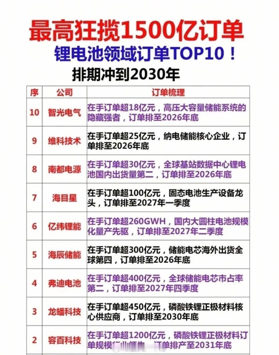 锂电池领域订单TOP10!最高狂揽1500亿,排期冲到2030年!从宁德时代的1500亿订单稳居行业第一,到容百科技、龙蟠科技的千亿级、百亿级订单,再到储能、钠电、设备等细分赛道的企业,排期直接排到2027、2030年!