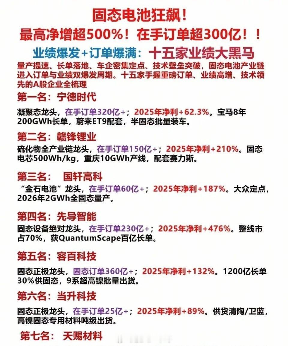 无论是传统锂电池赛道的千亿级长单,还是固态电池赛道的订单与业绩双爆发,都能看出整个电池产业链的景气度正在持续向上,头部企业的订单排期已经锁定未来3-5年的业绩,成长确定性拉满!以上内容仅为行业信息整理与科普分享,不构成任何投资建议!股市有风险,投资需谨慎,大家一定要结合自身情况理性决策!