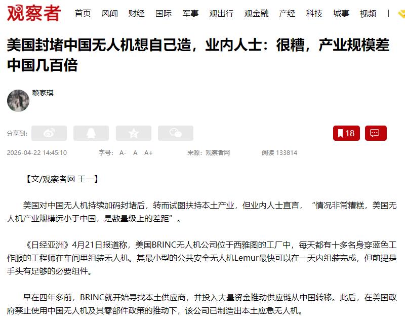 美国看着眼馋又着急,不想一直依赖中国,就想靠封堵把中国无人机挤走,给自家企业腾地方,结果弄巧成拙。