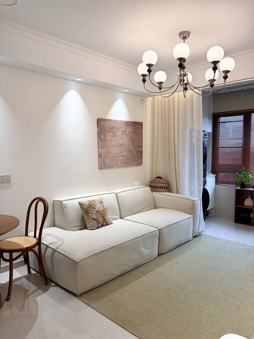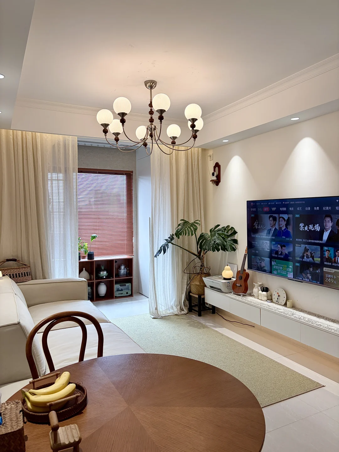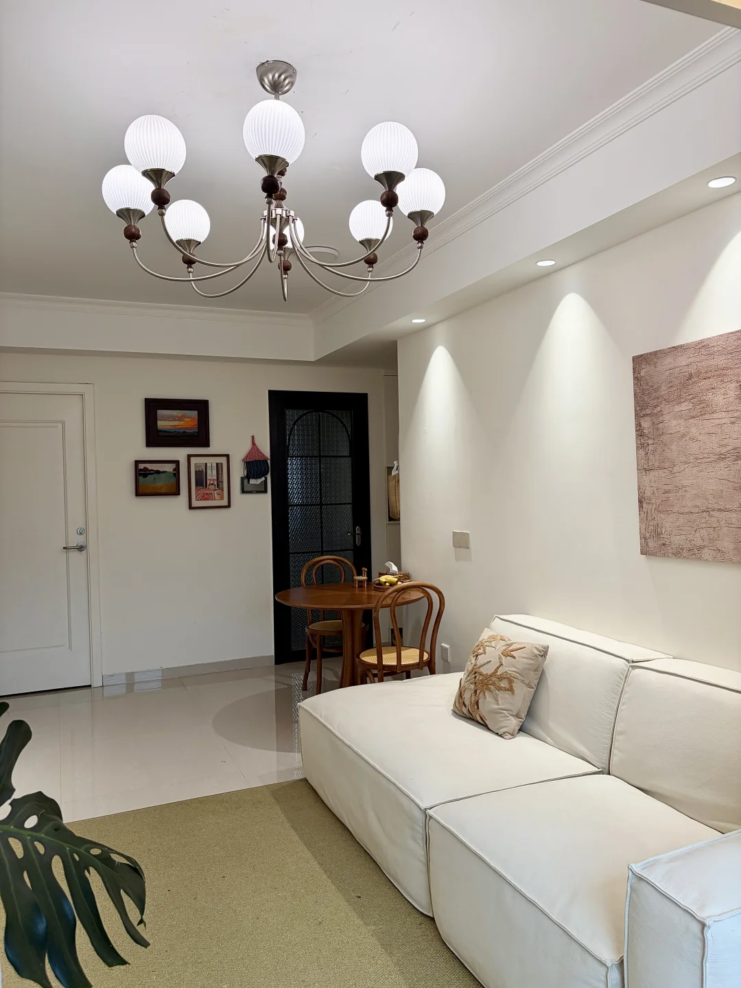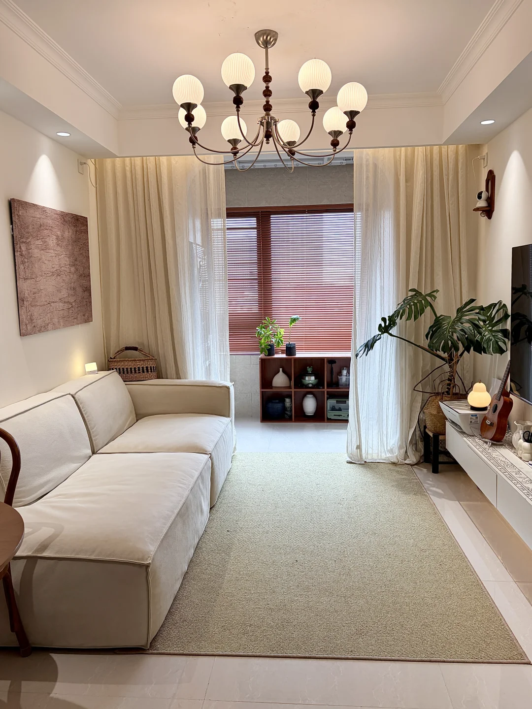 ✔️提升氛围感的关键,就是我家的中古吊灯!一开始还担心小户型压层高,结果装上完全不会,奶白玻璃罩+胡桃木的设计,和我家温柔的风格完美适配,暖光一开,整个客厅的质感直接上了一个台阶~