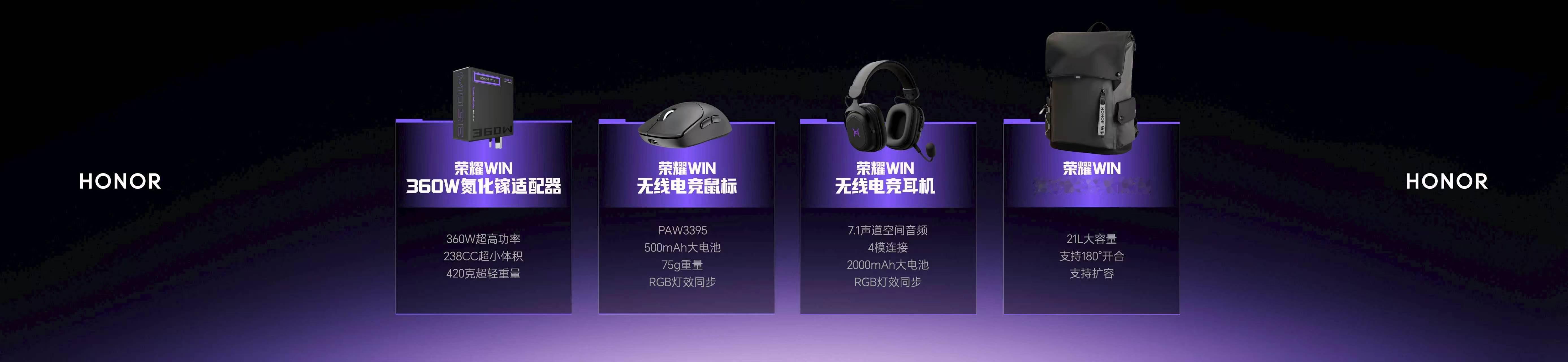 荣耀WIN系列自发布以来,始终致力于成长为一个完整的电竞生态品牌。本次荣耀发布会 除了旗舰机型H9,还推出H7机型,形成覆盖不同档位的产品矩阵外,还带来了荣耀WIN 360W氮化镓适配器、荣耀WIN无线电竞鼠标、荣耀WIN无线电竞耳机、荣耀WIN多功能双肩背包、荣耀WIN笔记本散热支架等产品。数码闲聊站