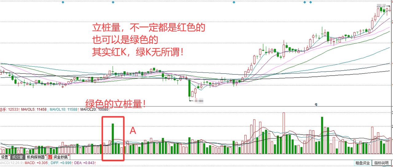 这里我告诉大家,其实是无所谓的!可能有些朋友觉得,突然的放大量,一定是主力资金在暴力拉涨,当日K线怎么可能是绿色的柱子呢?其实不然,股价也可以先拉涨后下砸,也可以高开之后下砸,这样都会形成有一定实体的绿色量柱,且不影响当天的成交量放大3倍!我再举个例子,如图4,这就是一个绿色的立桩量,依然不妨碍股价后续出现了大涨。只不过,我们平常见到的立桩量红柱居多。
