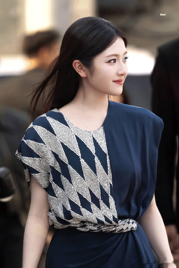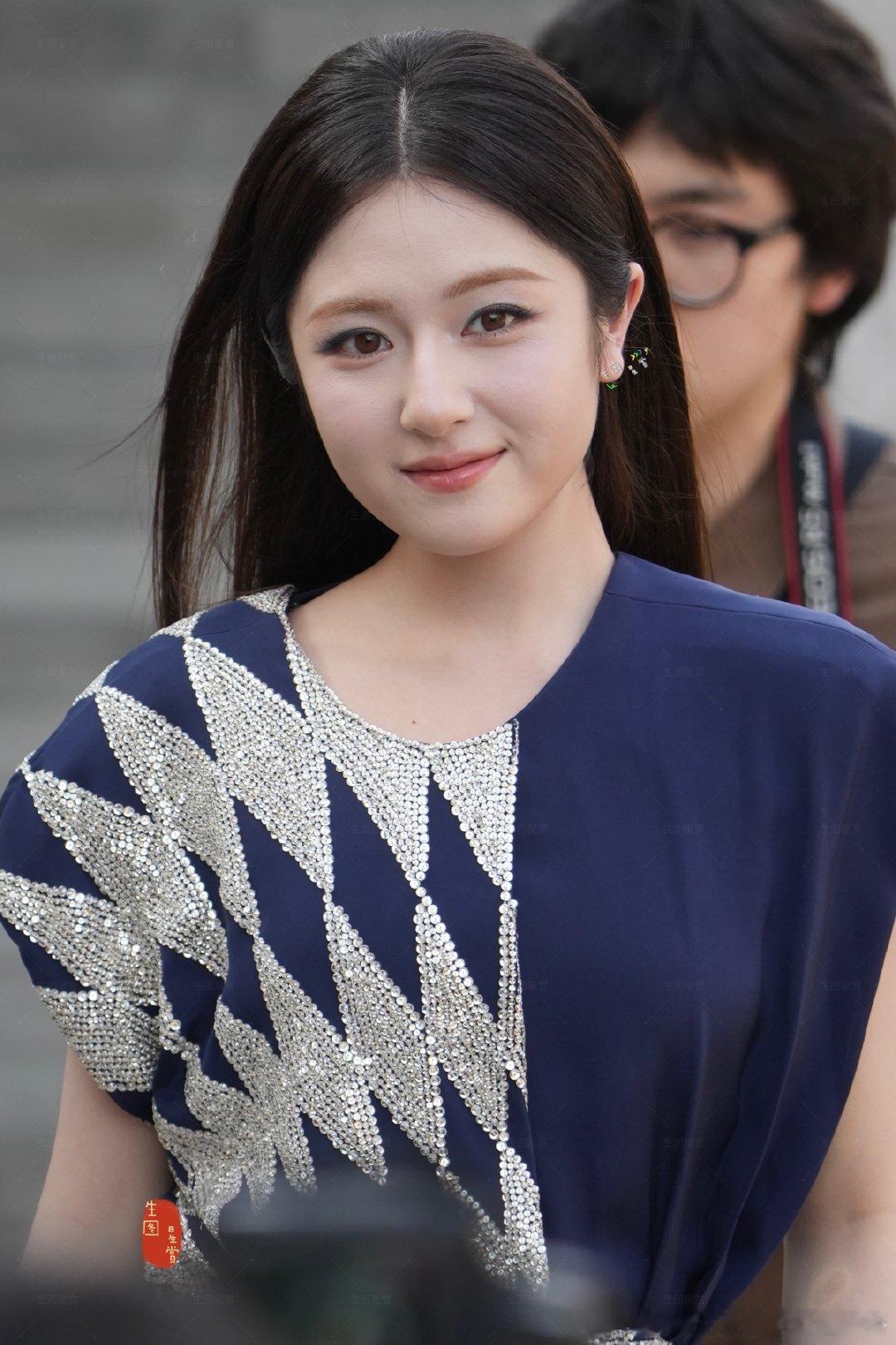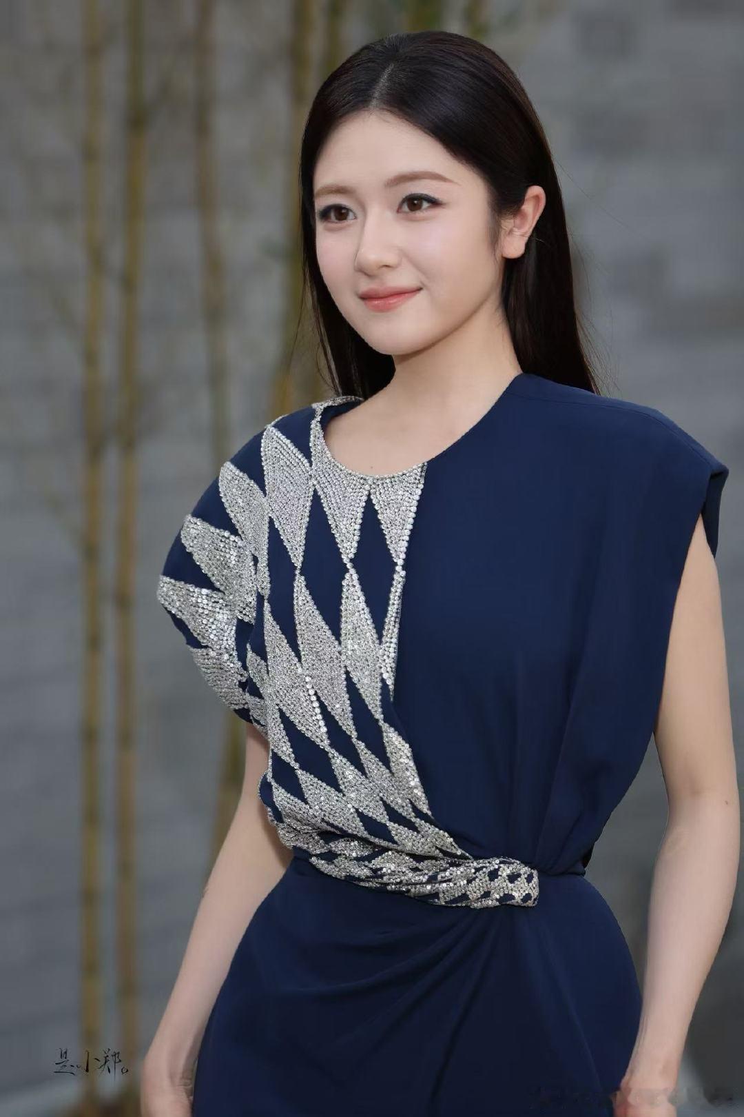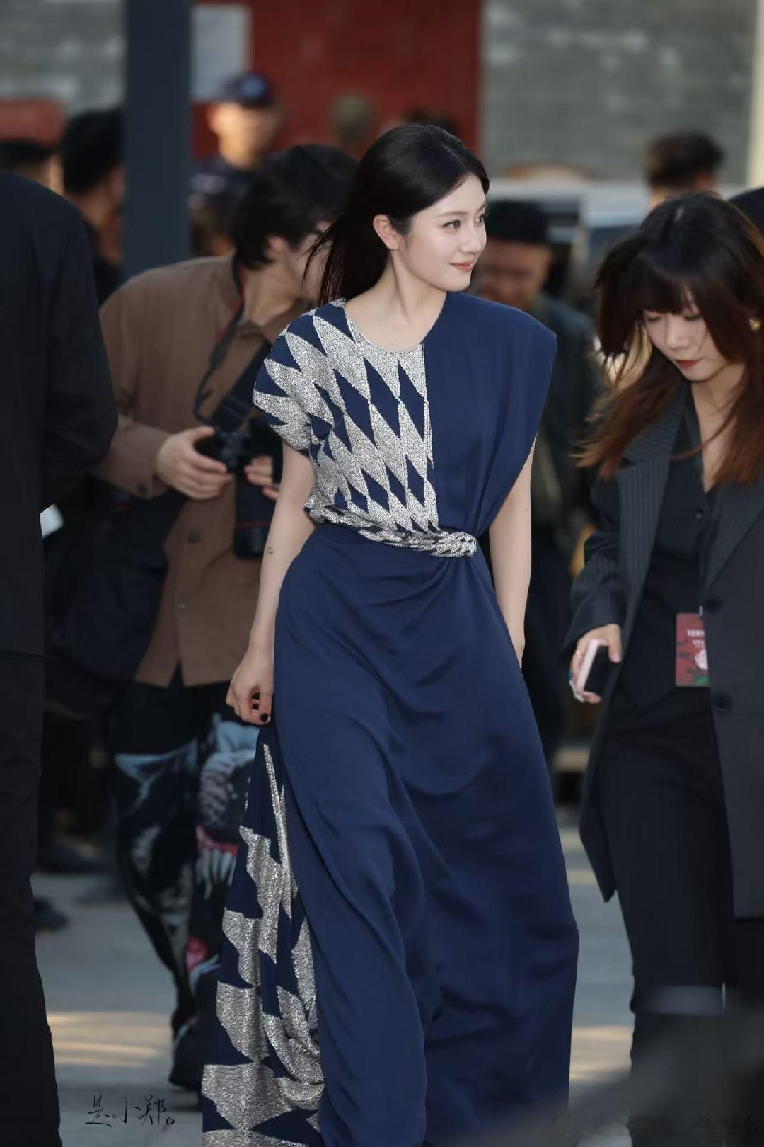 李兰迪今天参加品牌线下活动,蓝色长裙走沉稳大气路线