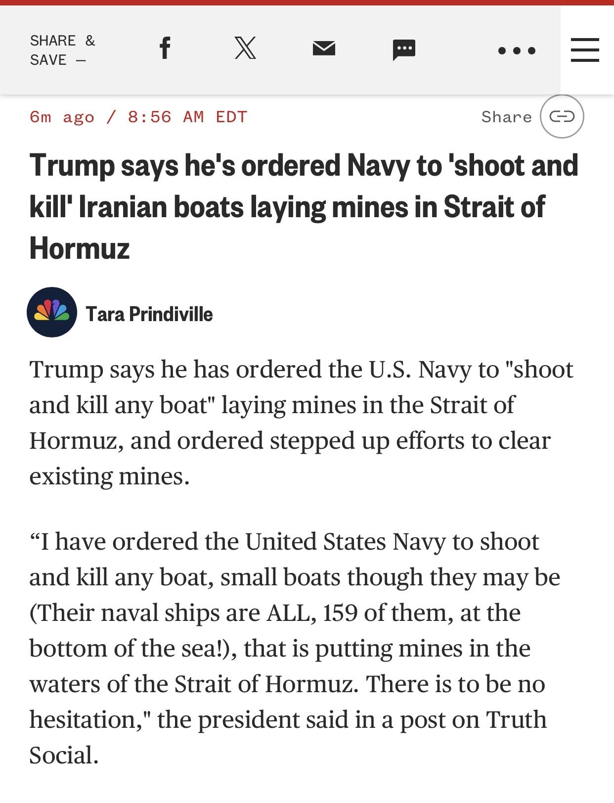 “我已下令美国海军击沈任何在霍尔木兹海峡水域布雷的船只,无论它们有多小(他们的海军舰艇,159艘全部沉入海底!),绝不能犹豫,”总统在Truth Social上发帖称(“I have ordered the United States Navy to shoot and kill any boat, small boats though they may be (Their naval ships are ALL, 159 of them, at the bottom of the sea!), that is putting mines in the waters of the Strait of Hormuz. There is to be no hesitation," the president said in a post on Truth Social)。