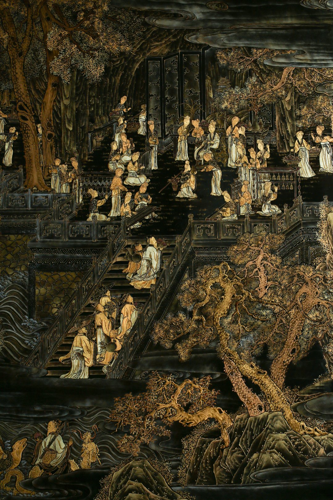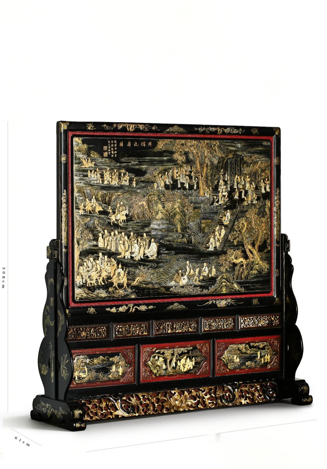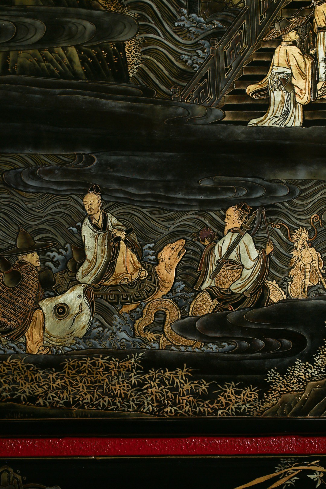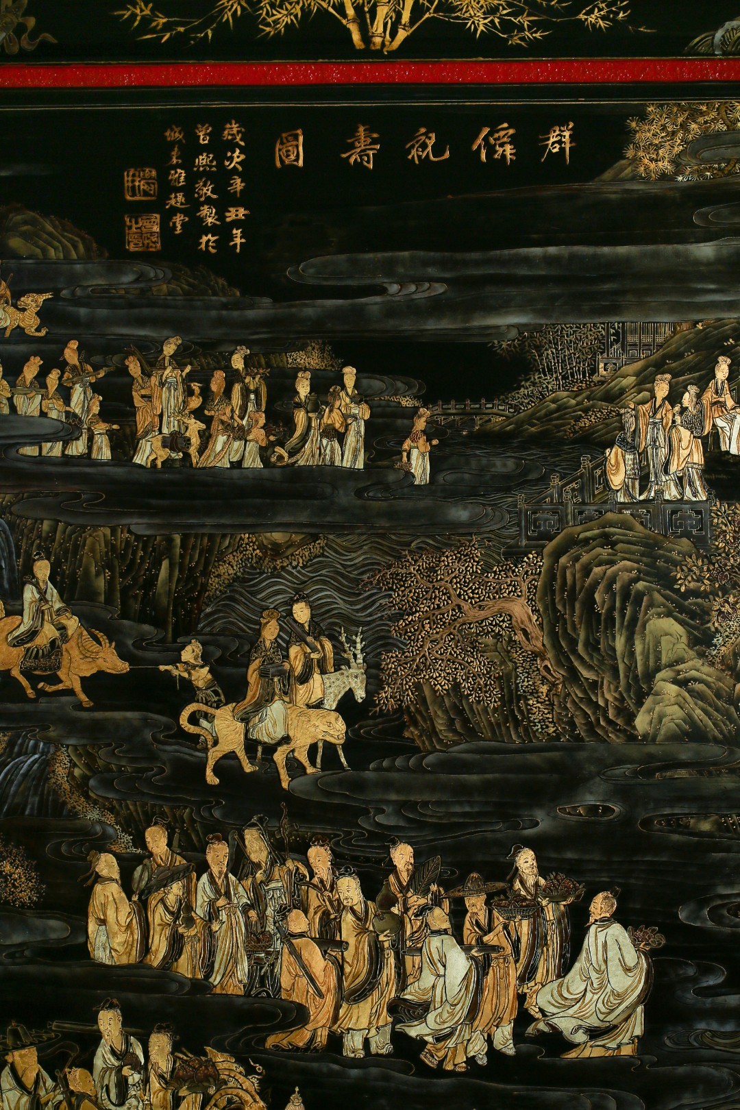 清代老楠木,历史实数月打造,通体描金工艺,金粉勾勒人物、山水、亭台楼阁,细节精致,描绘群仙祝寿图人物故事图,镶嵌老花板,古朴精雅,底胎老楠木裱布工艺,漆质殷厚坚实,华美富贵,整器寓意吉祥、长寿、喜庆。