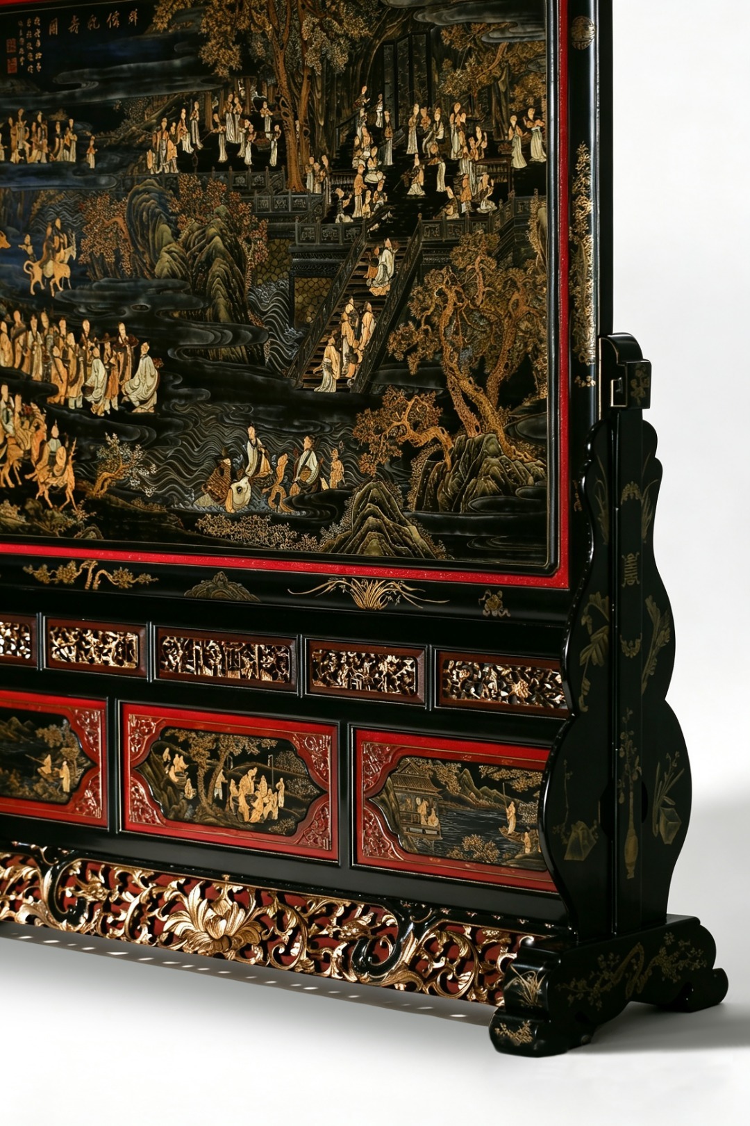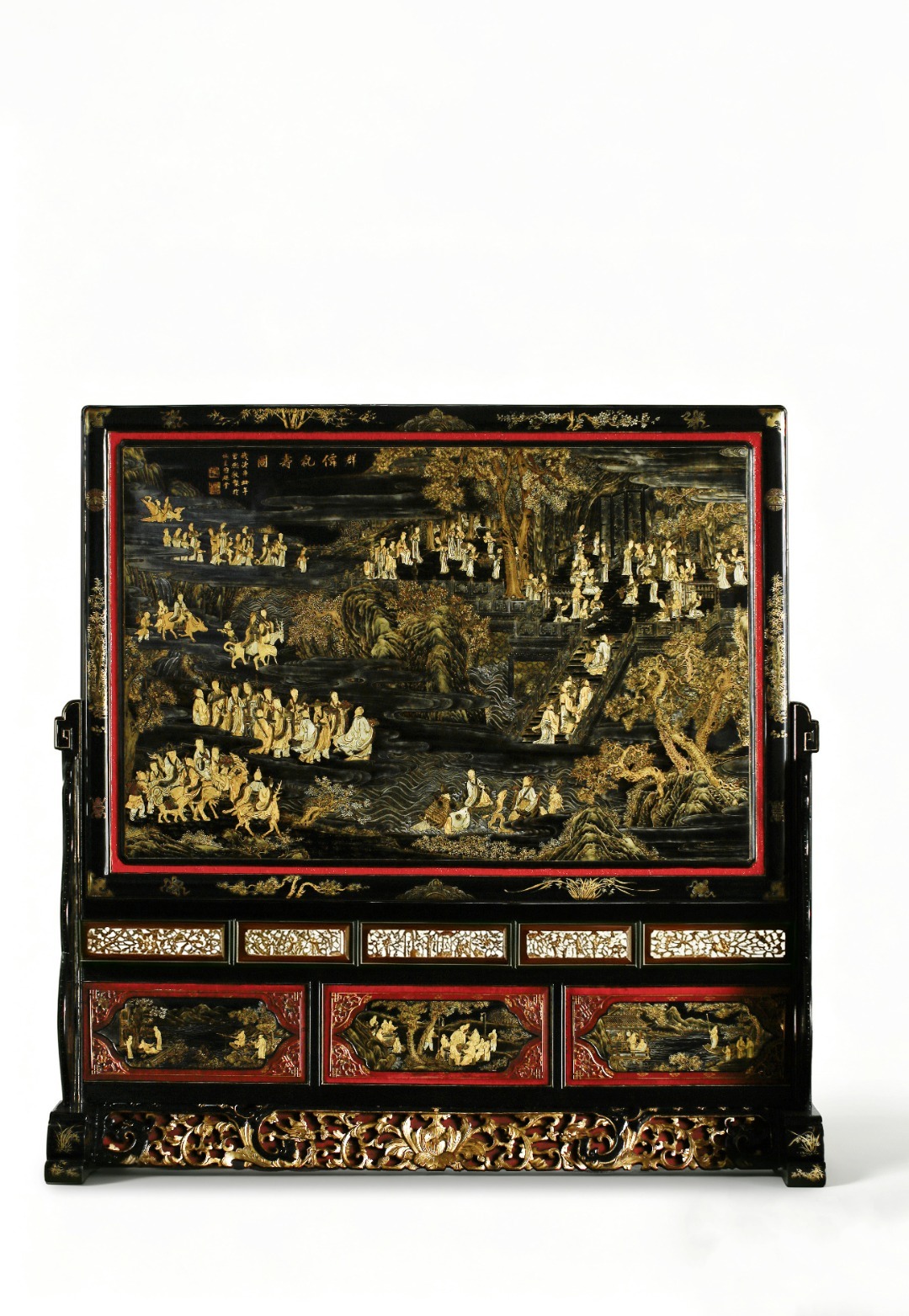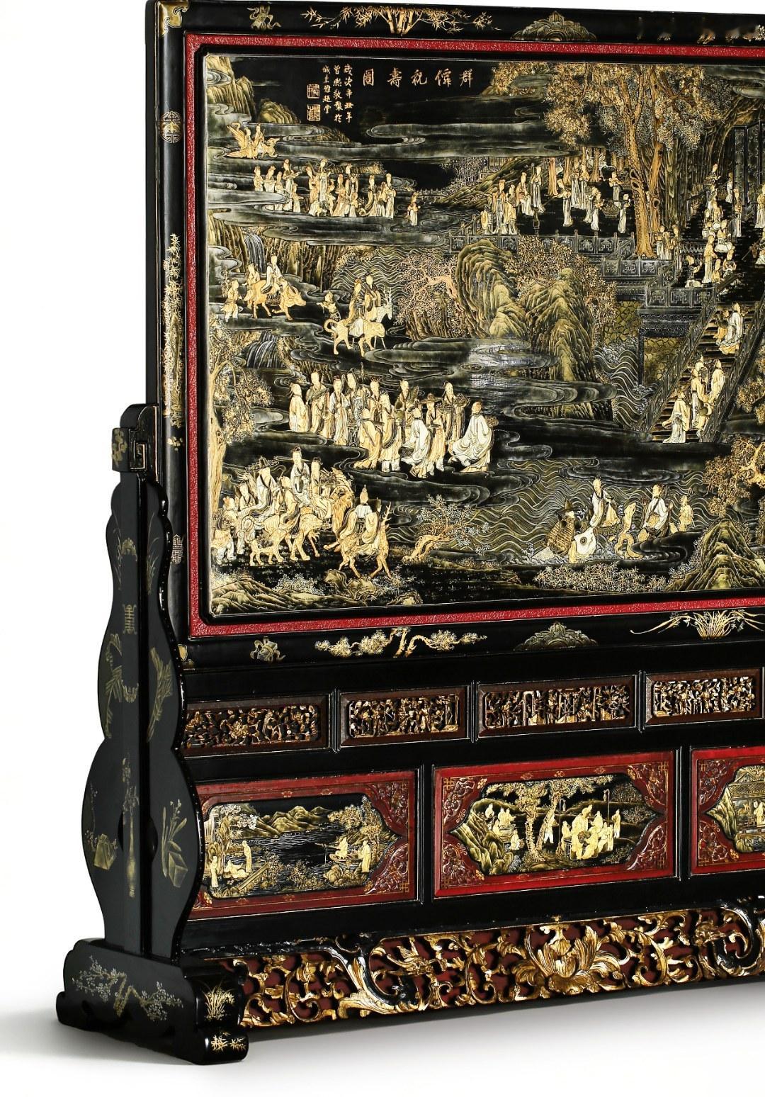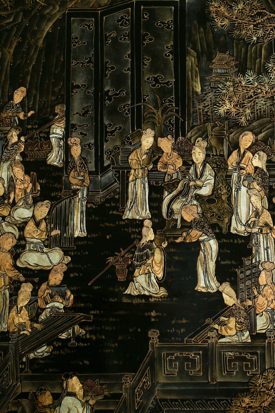 清代老楠木,历史实数月打造,通体描金工艺,金粉勾勒人物、山水、亭台楼阁,细节精致,描绘群仙祝寿图人物故事图,镶嵌老花板,古朴精雅,底胎老楠木裱布工艺,漆质殷厚坚实,华美富贵,整器寓意吉祥、长寿、喜庆。