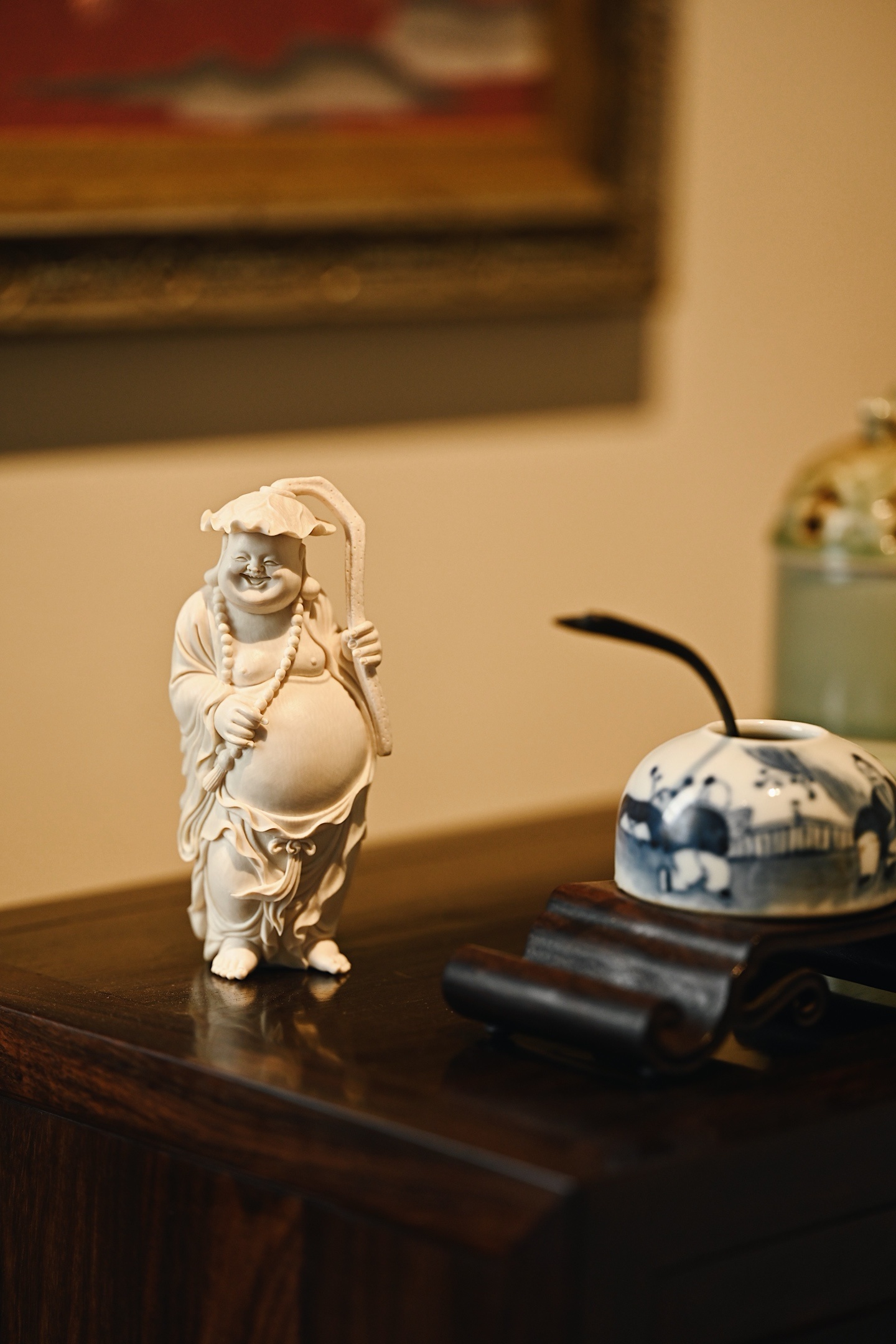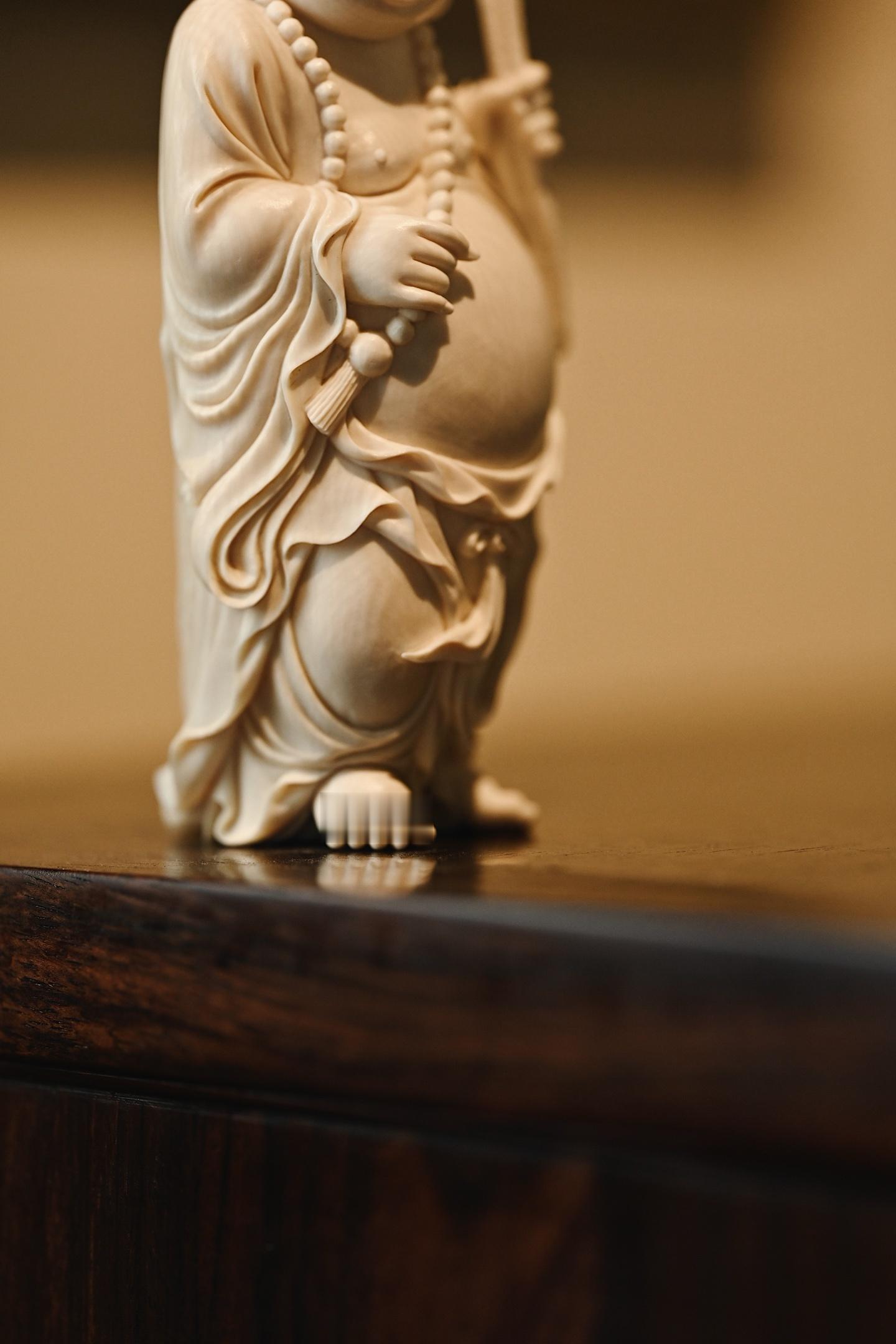 料质细腻,雕刻弥勒弥勒袒胸露腹,丰腴饱满,面容喜乐开怀,笑眼弯眉,神态憨态可掬,衣纹流畅婉转,双手执荷持珠,寓意和和美美,笑口常开。