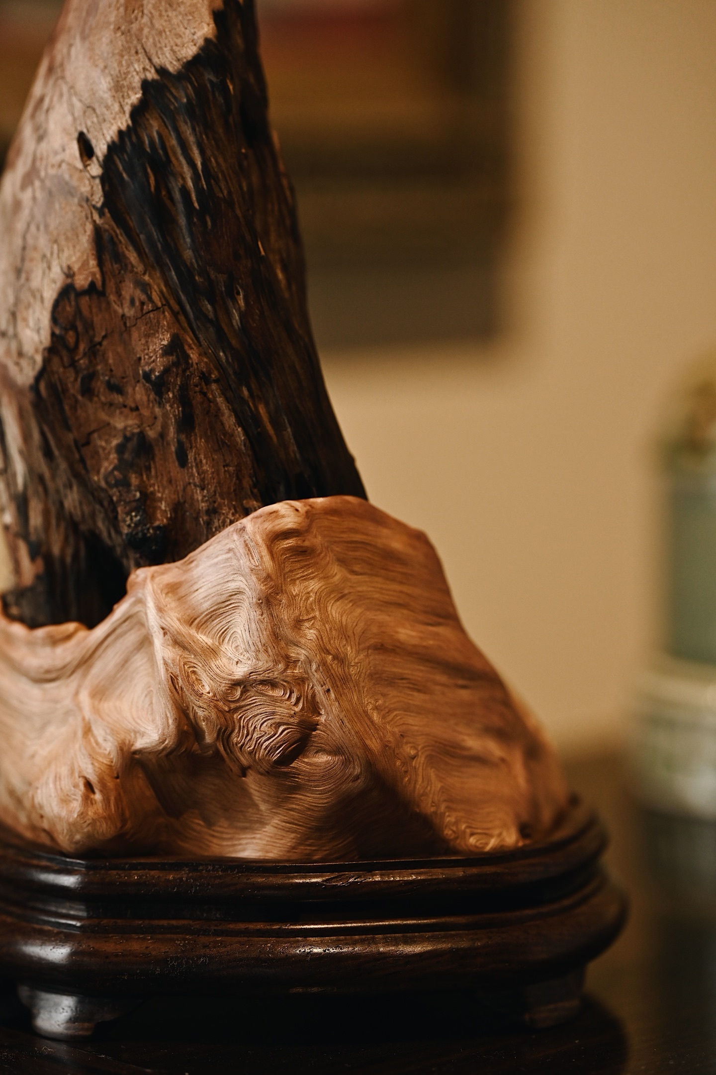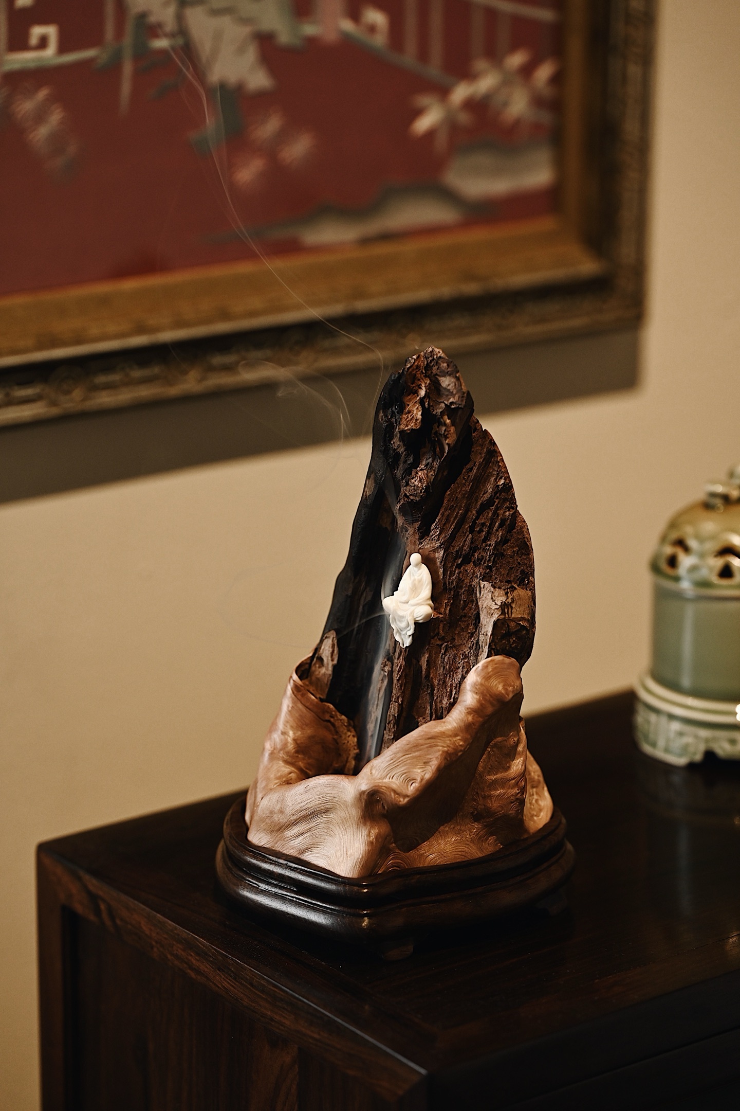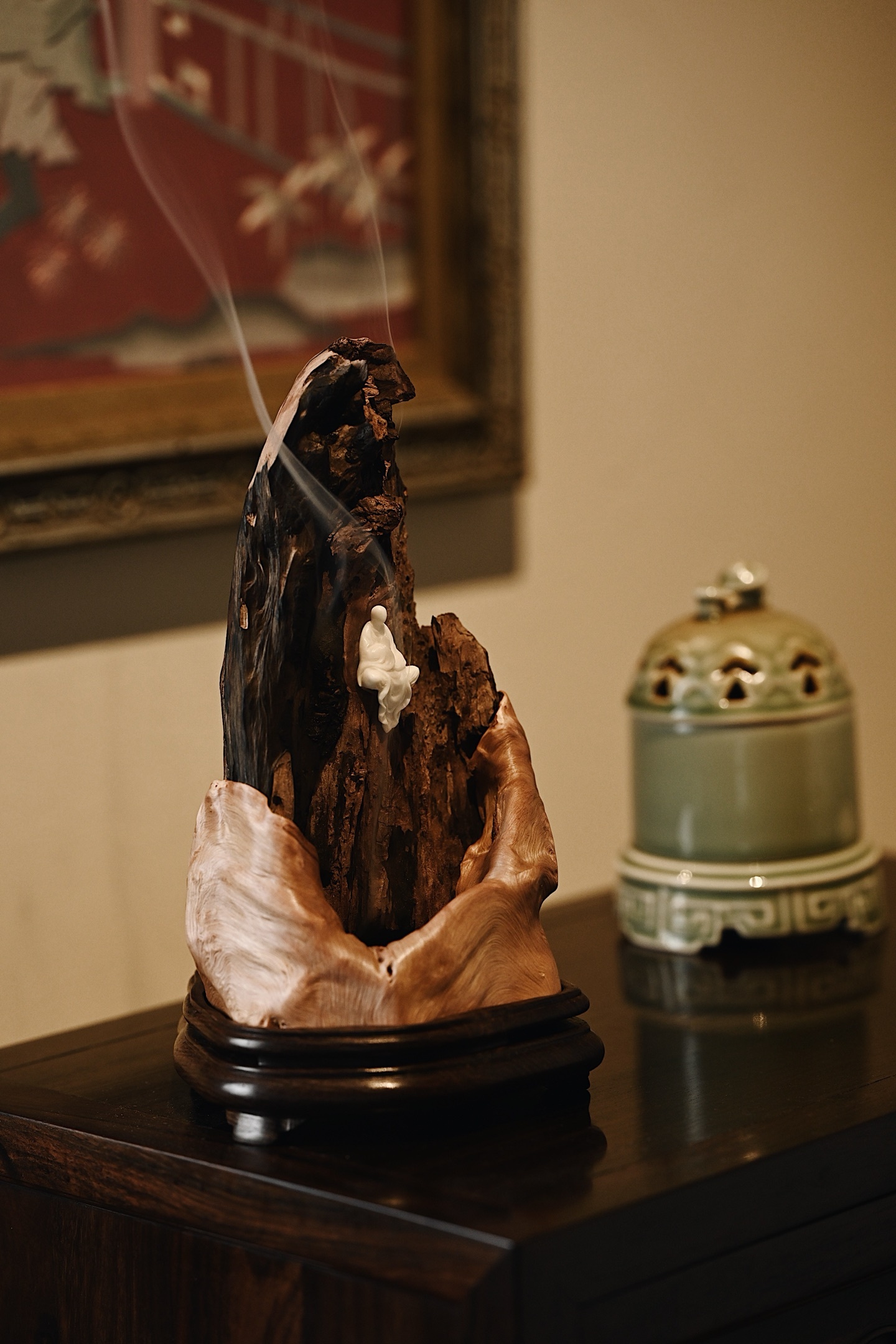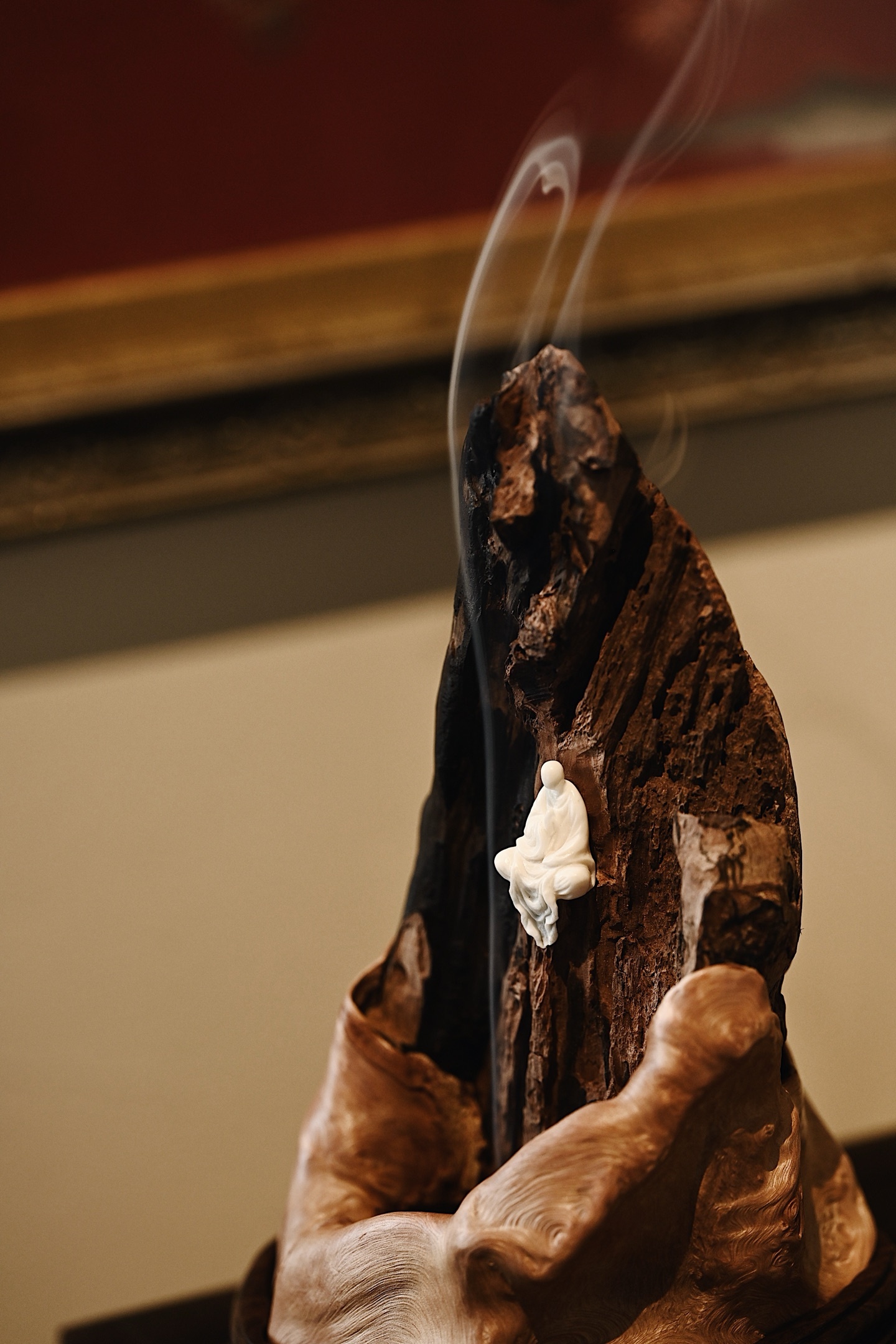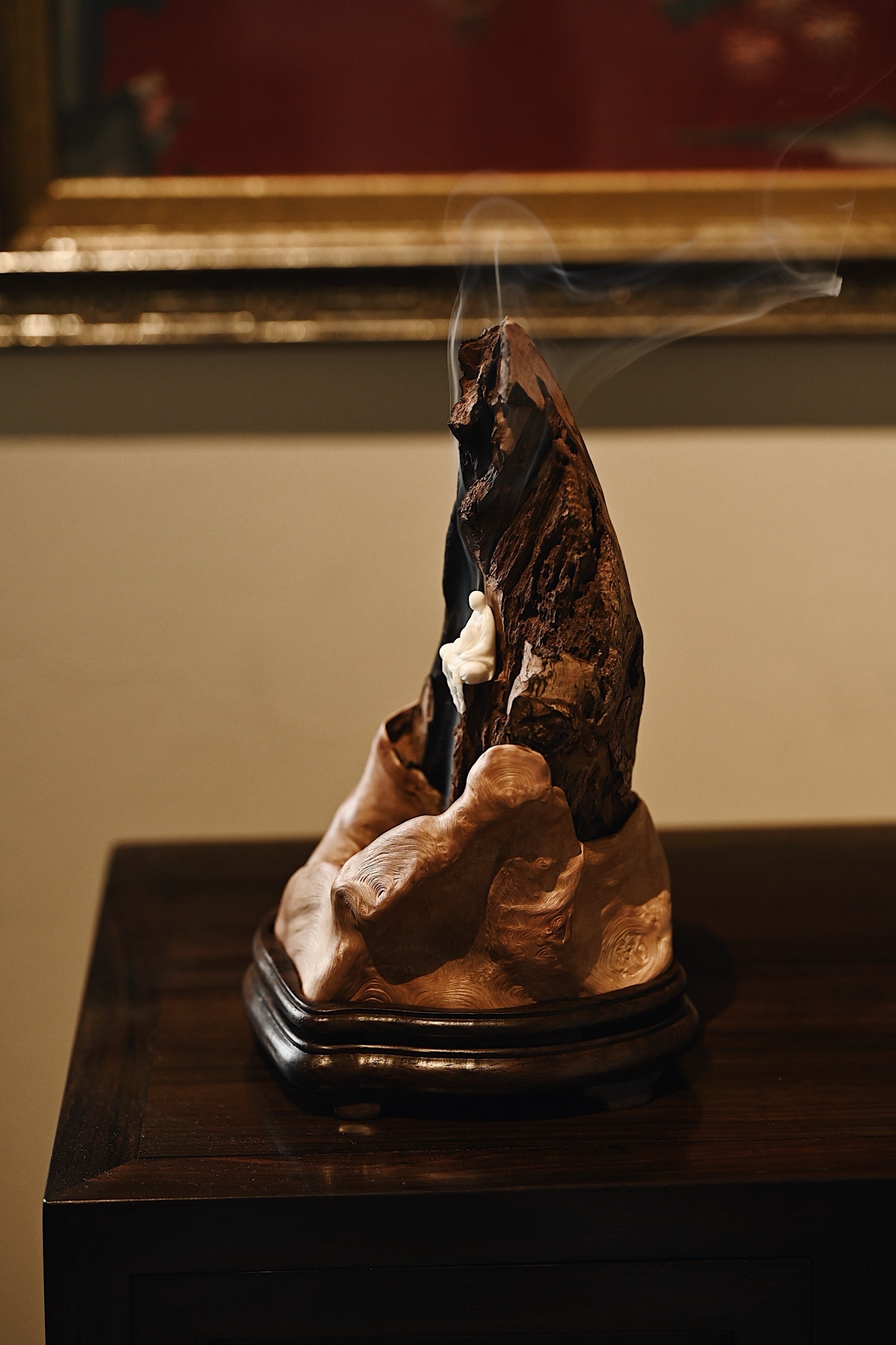 以天然枯木为主体,随形取势,纹理如崖壁嶙峋,无相佛禅定而坐,衣袂飘然,慈悲静穆,焚香其间,烟气萦绕,更添“空山禅寂、物我两忘”的意境。