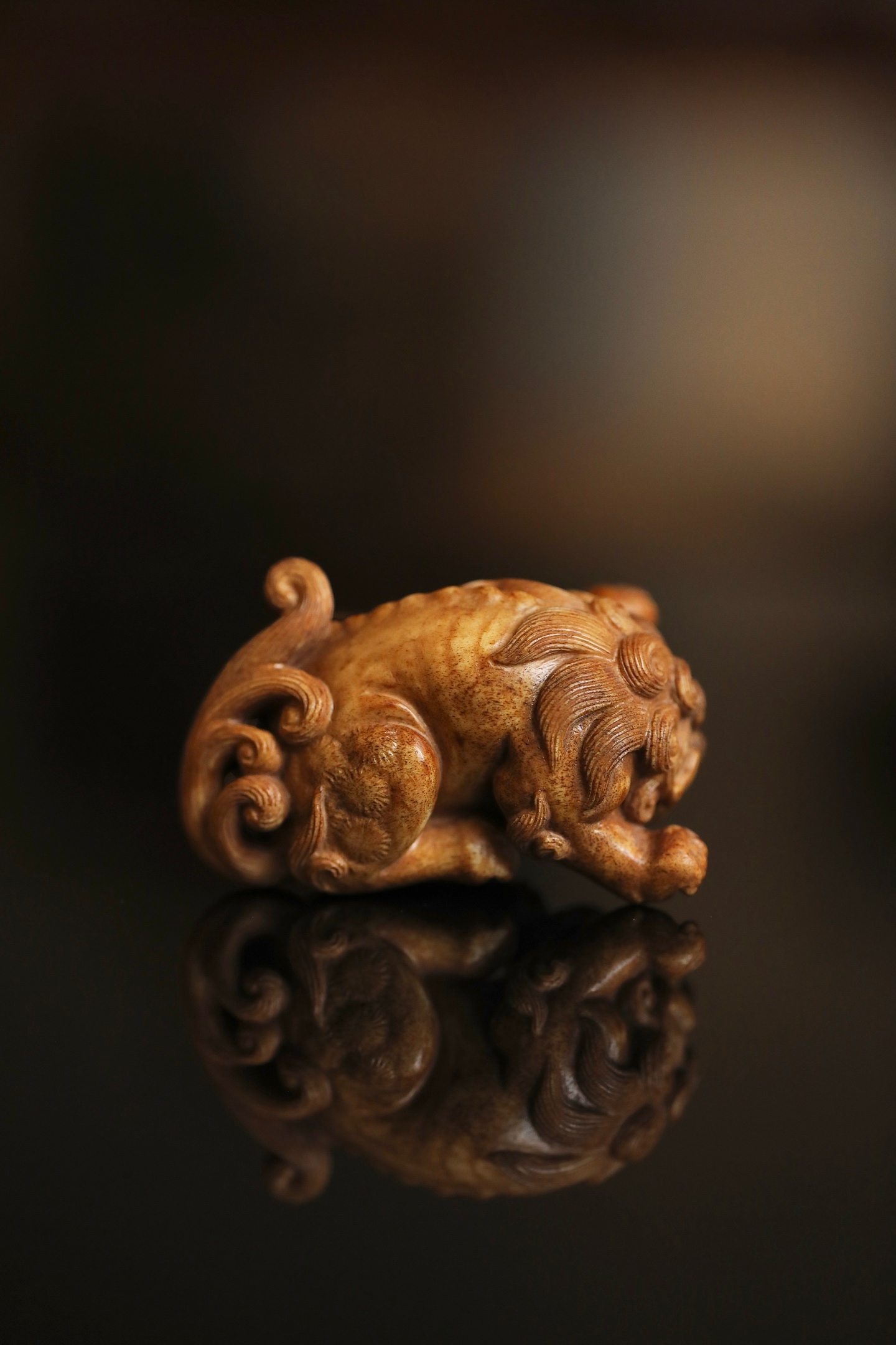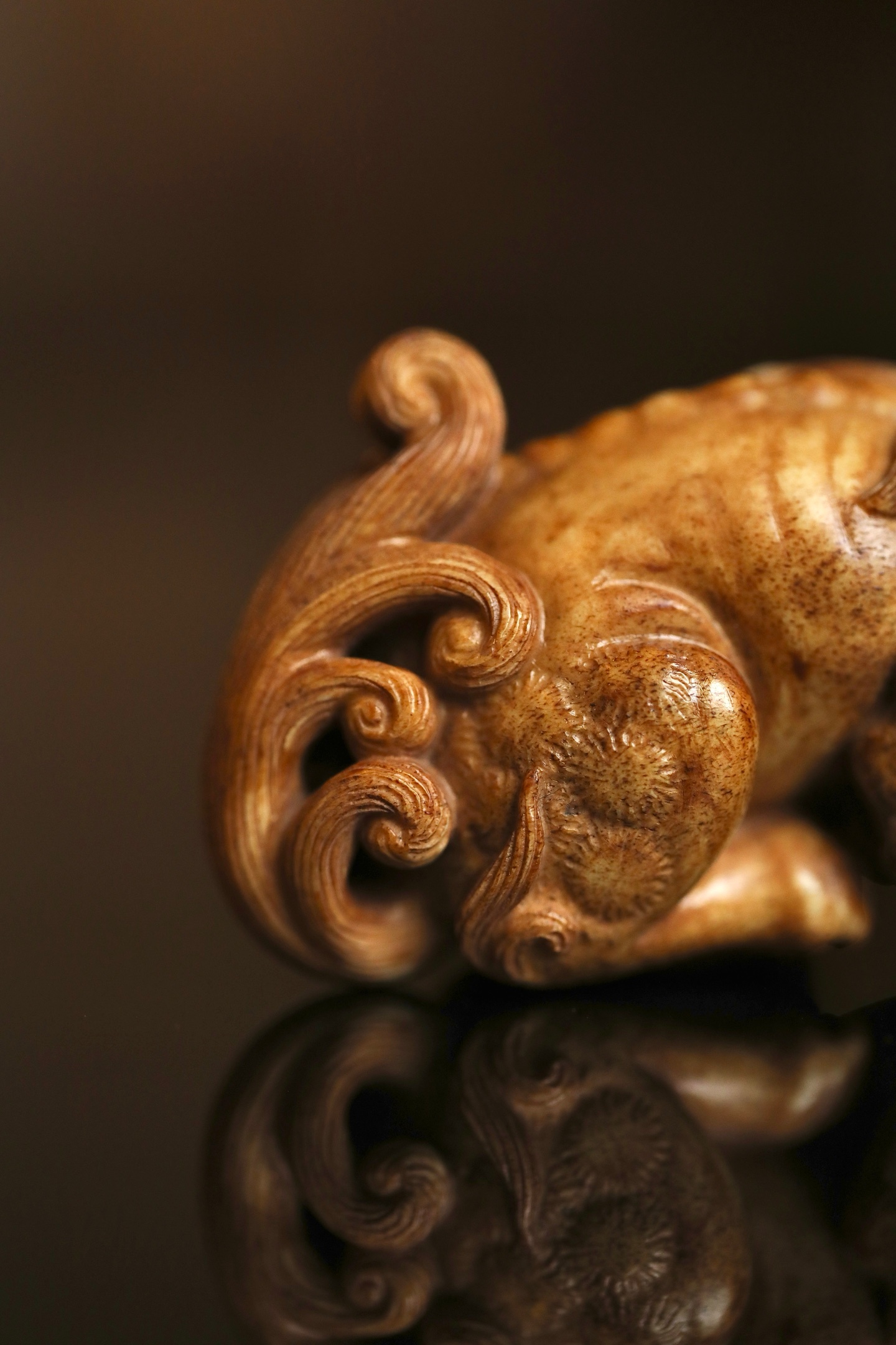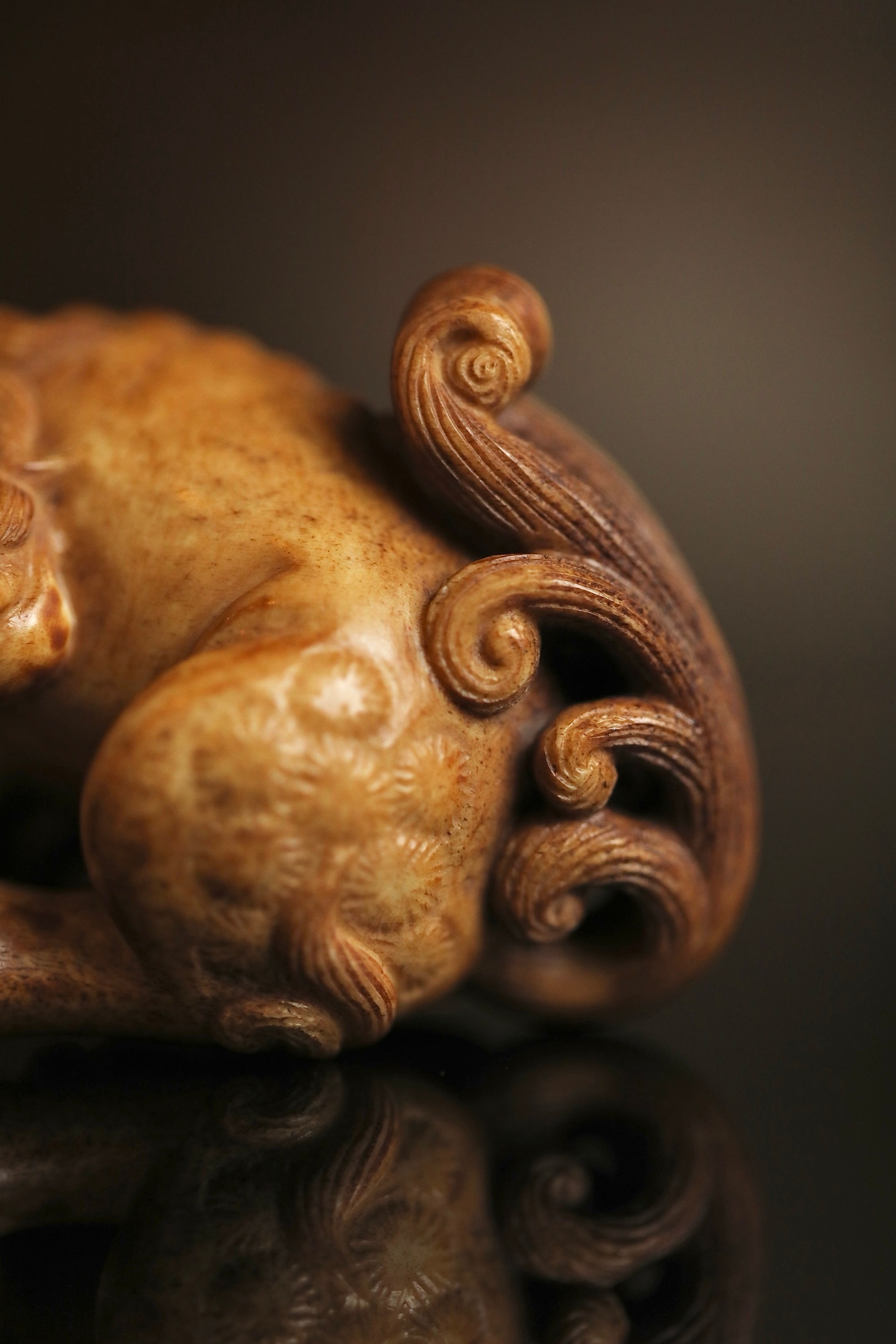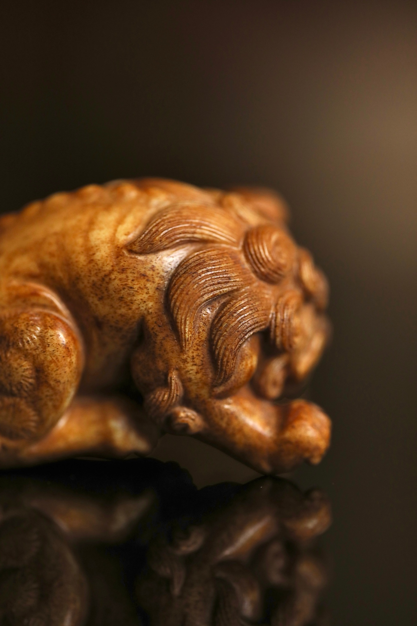 器体以圆雕技法,塑一回首卧兽。瑞兽眉目清秀,卷眉含笑,口微张露齿,憨态可掬。身躯蜷曲,肌肉饱满有力,毛发以细密刀法雕出卷云状纹理,丝丝缕缕,自然流畅。背部光素圆润,便于持握赏玩。