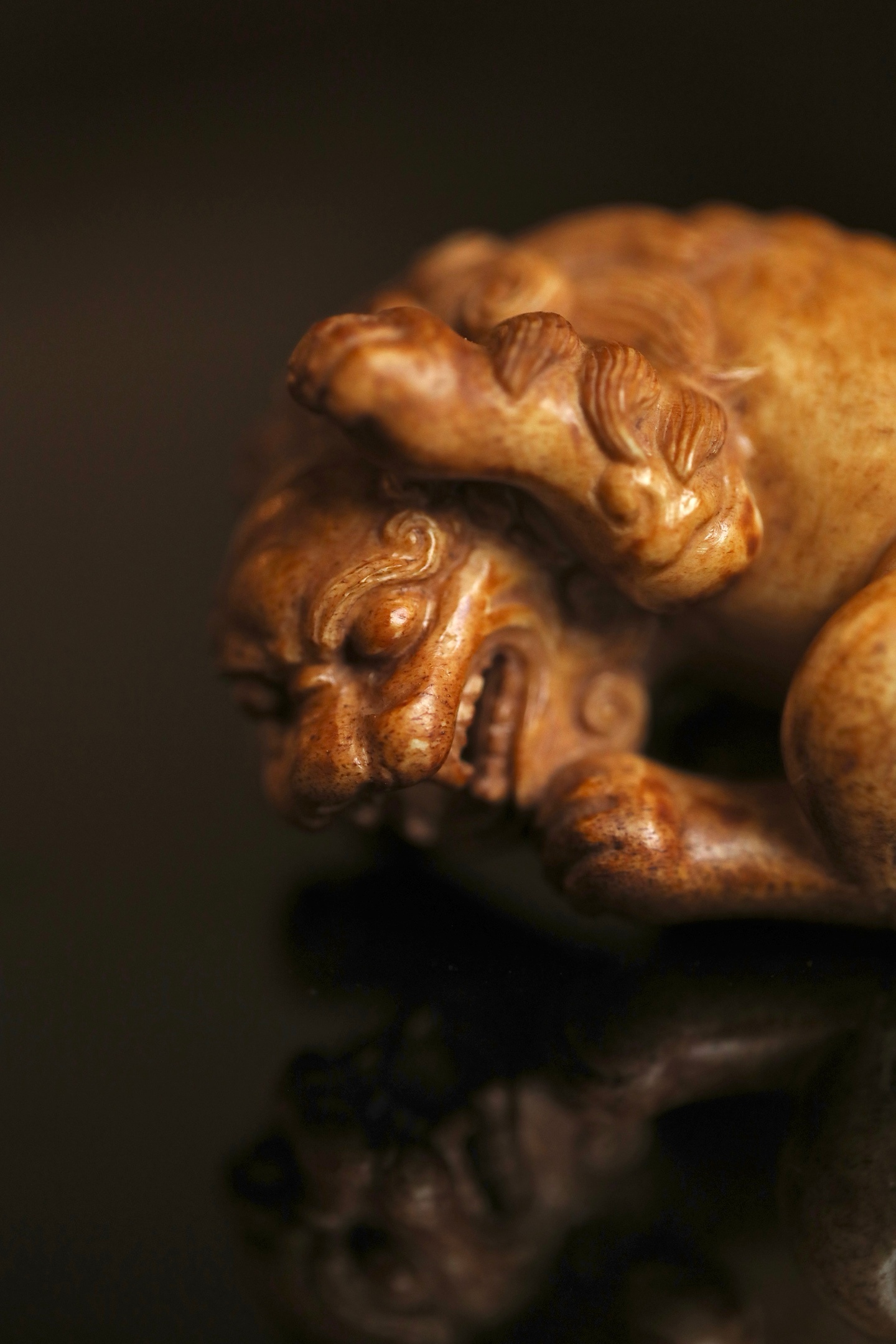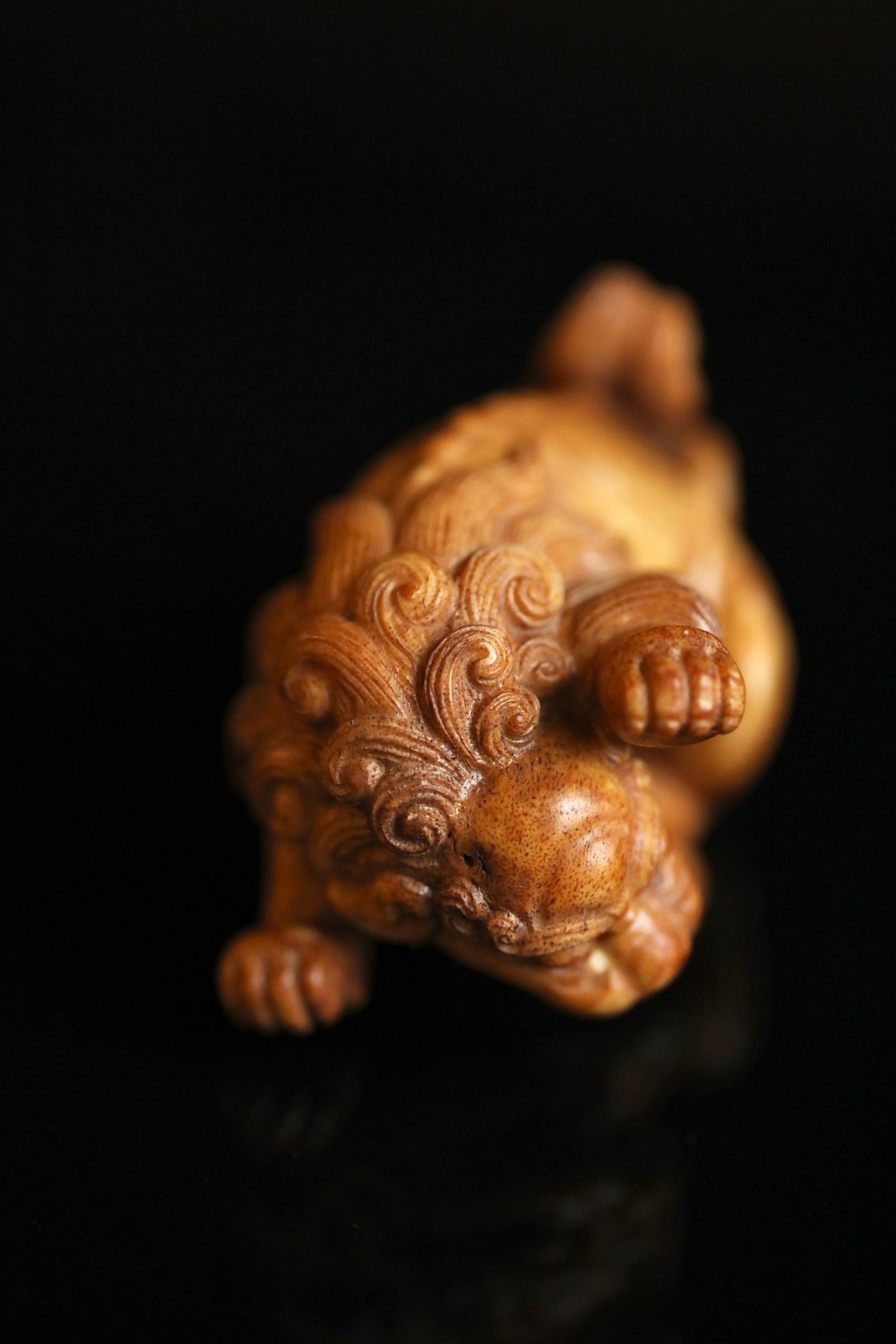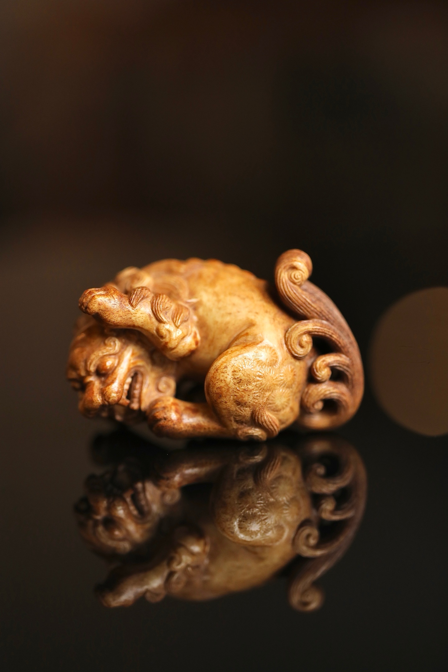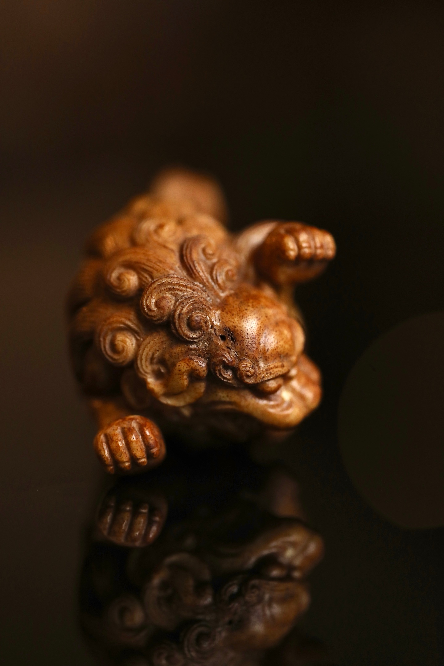 器体以圆雕技法,塑一回首卧兽。瑞兽眉目清秀,卷眉含笑,口微张露齿,憨态可掬。身躯蜷曲,肌肉饱满有力,毛发以细密刀法雕出卷云状纹理,丝丝缕缕,自然流畅。背部光素圆润,便于持握赏玩。