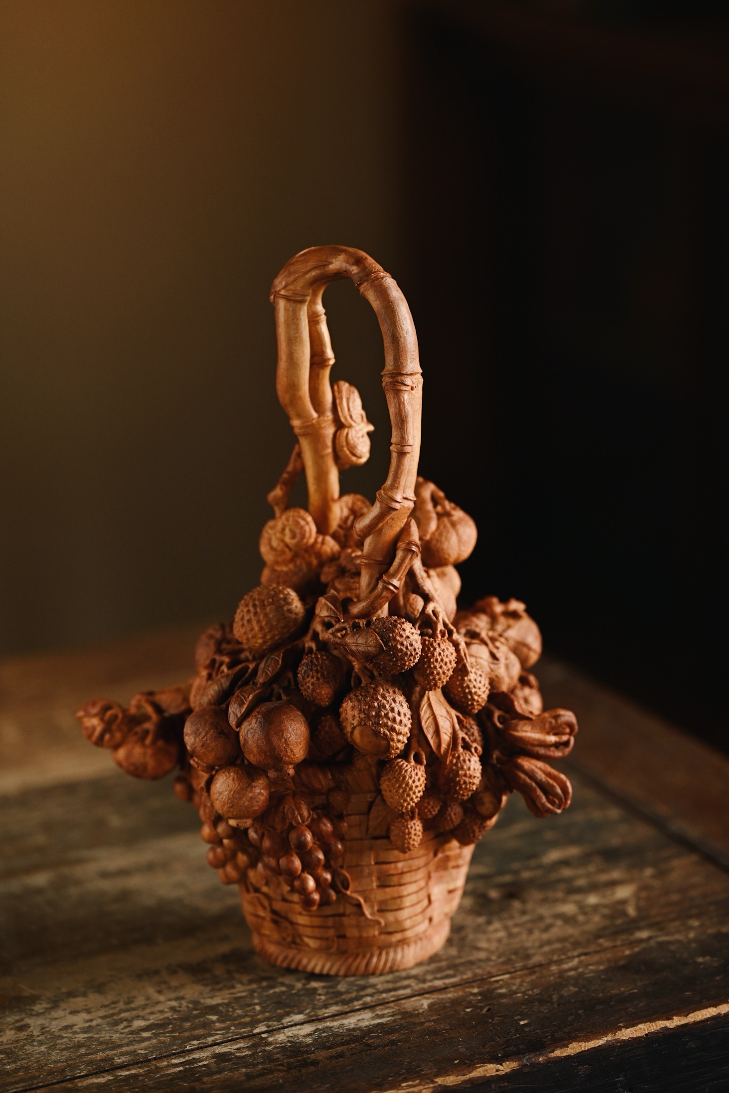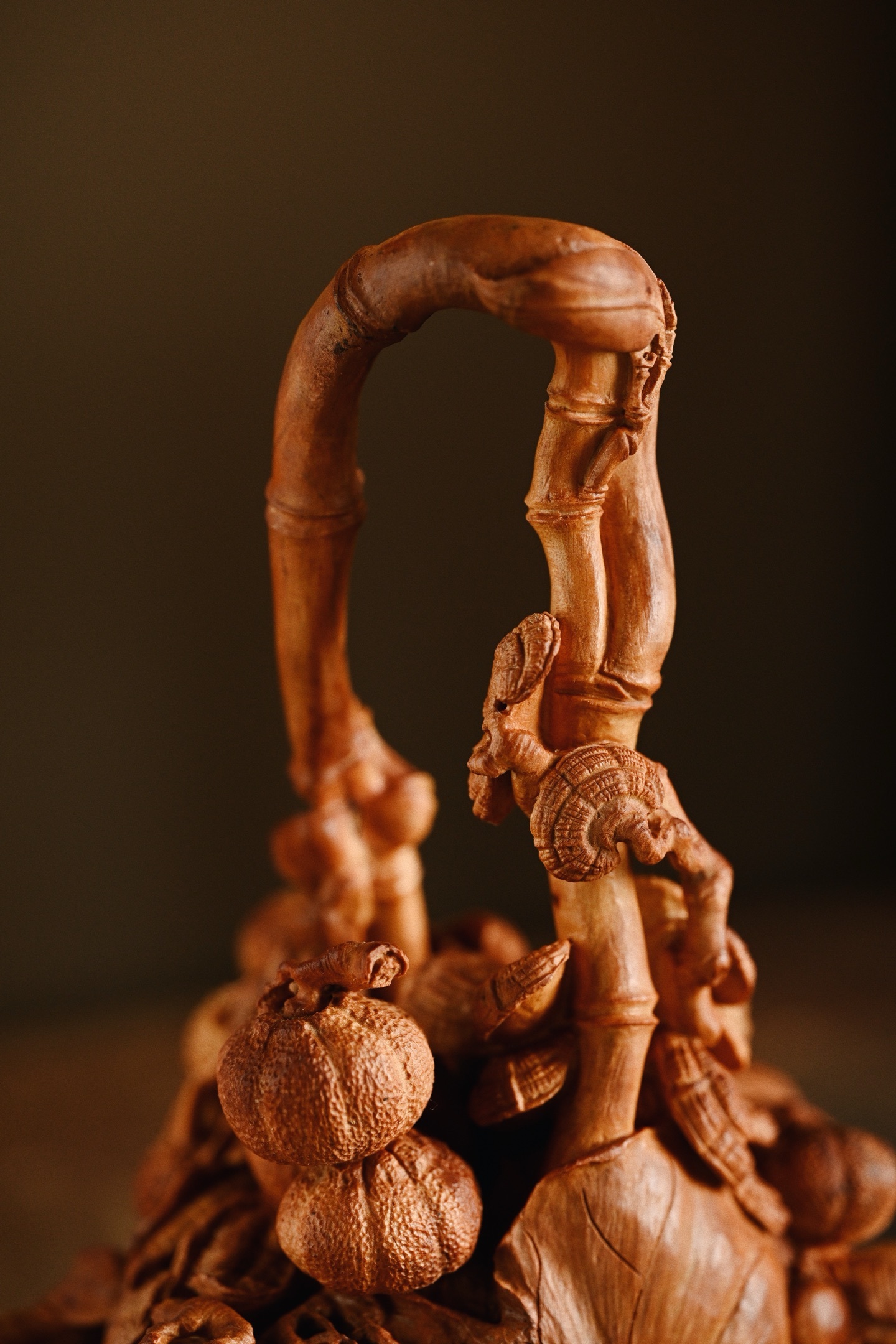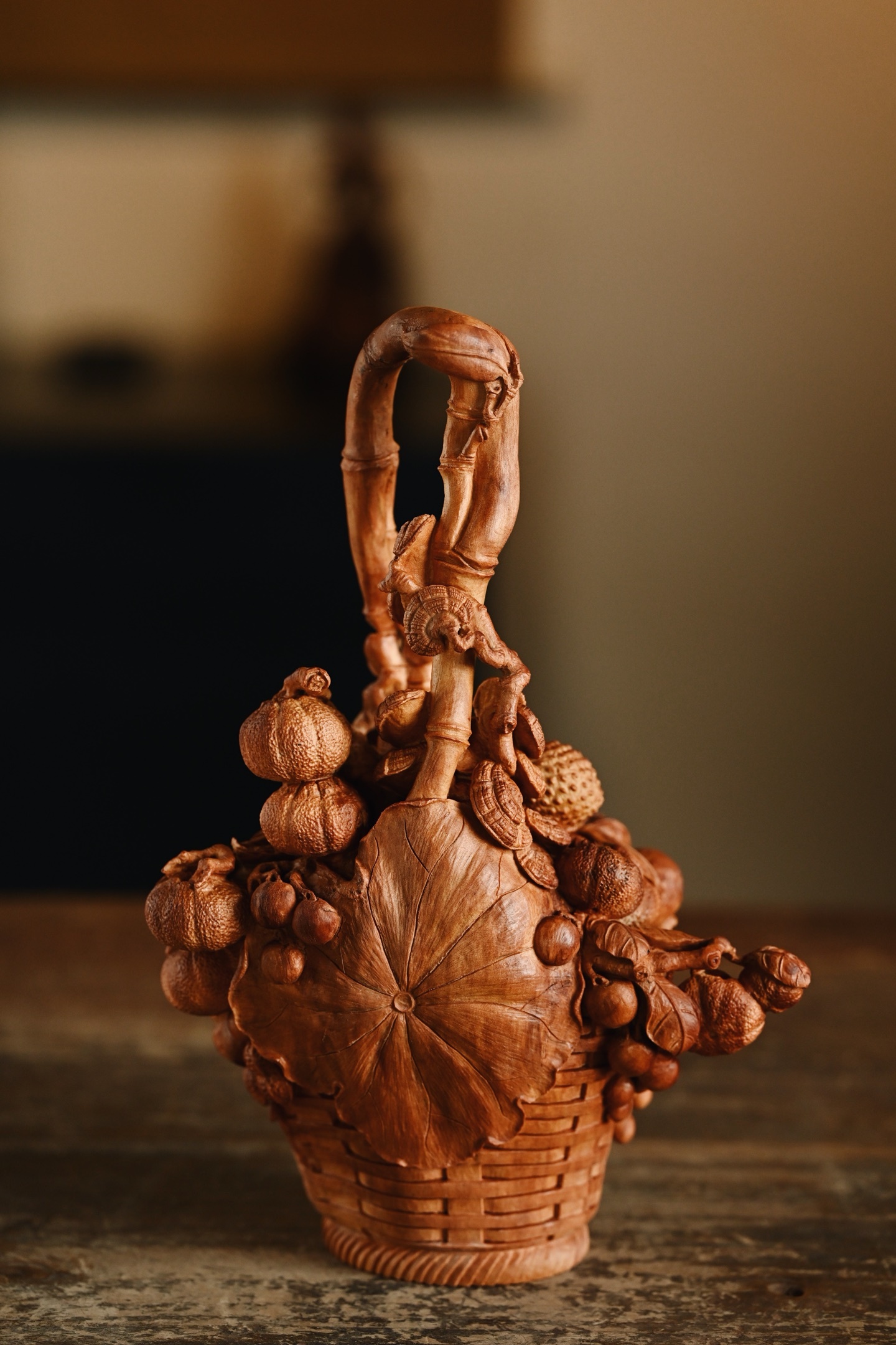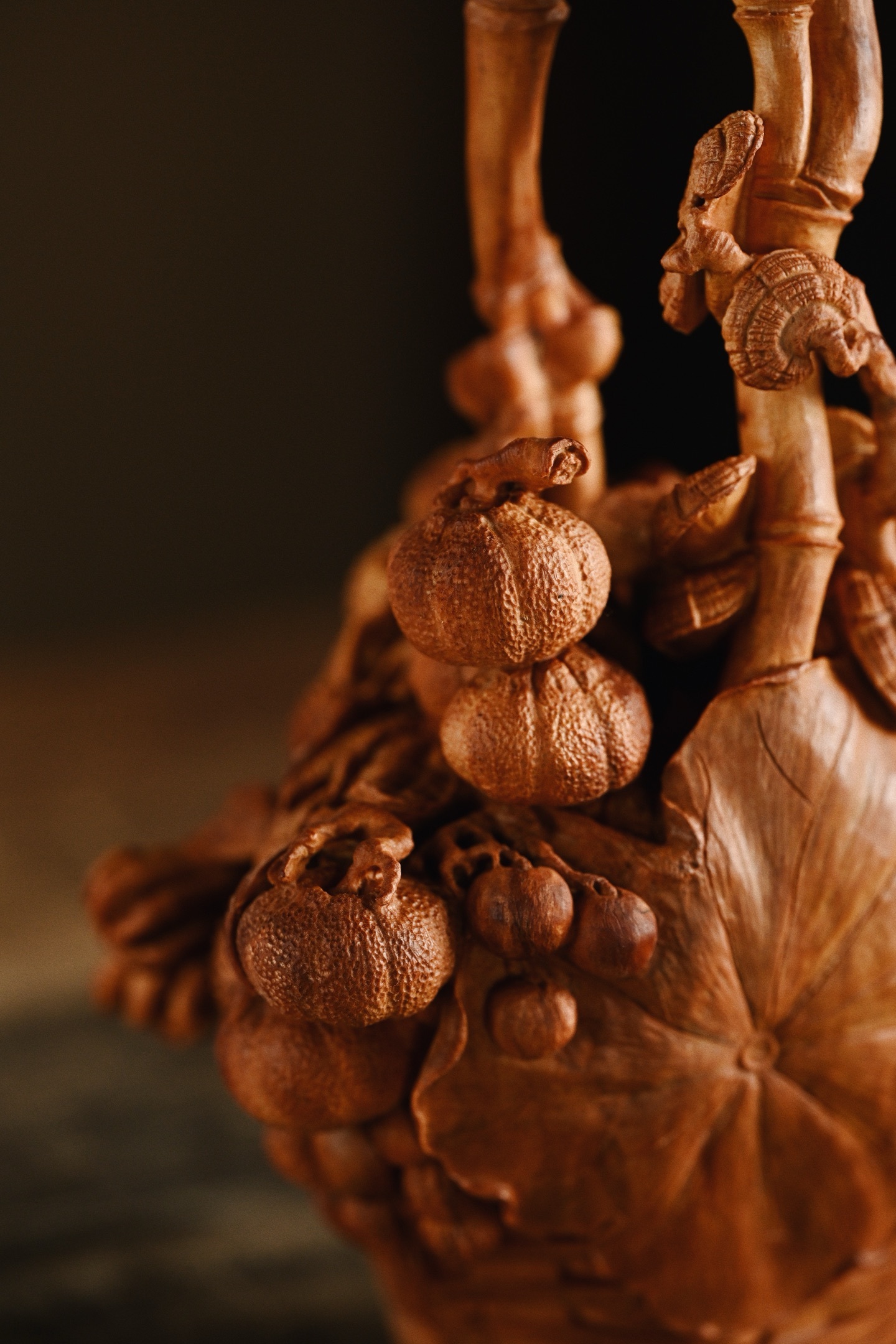 整料雕刻,立体圆雕技法,雕琢出一篮丰饶鲜果:荔枝饱满带刺,石榴裂壳露籽,佛手舒展如掌,葡萄成串垂坠,辅以竹节提梁与灵芝点缀,形态逼真,呼之欲出。篮身雕竹编纹理,经纬交织,层次分明,寓意“硕果累累、多子多福、富贵连绵”,是案头陈设、馈赠收藏的上佳之作。