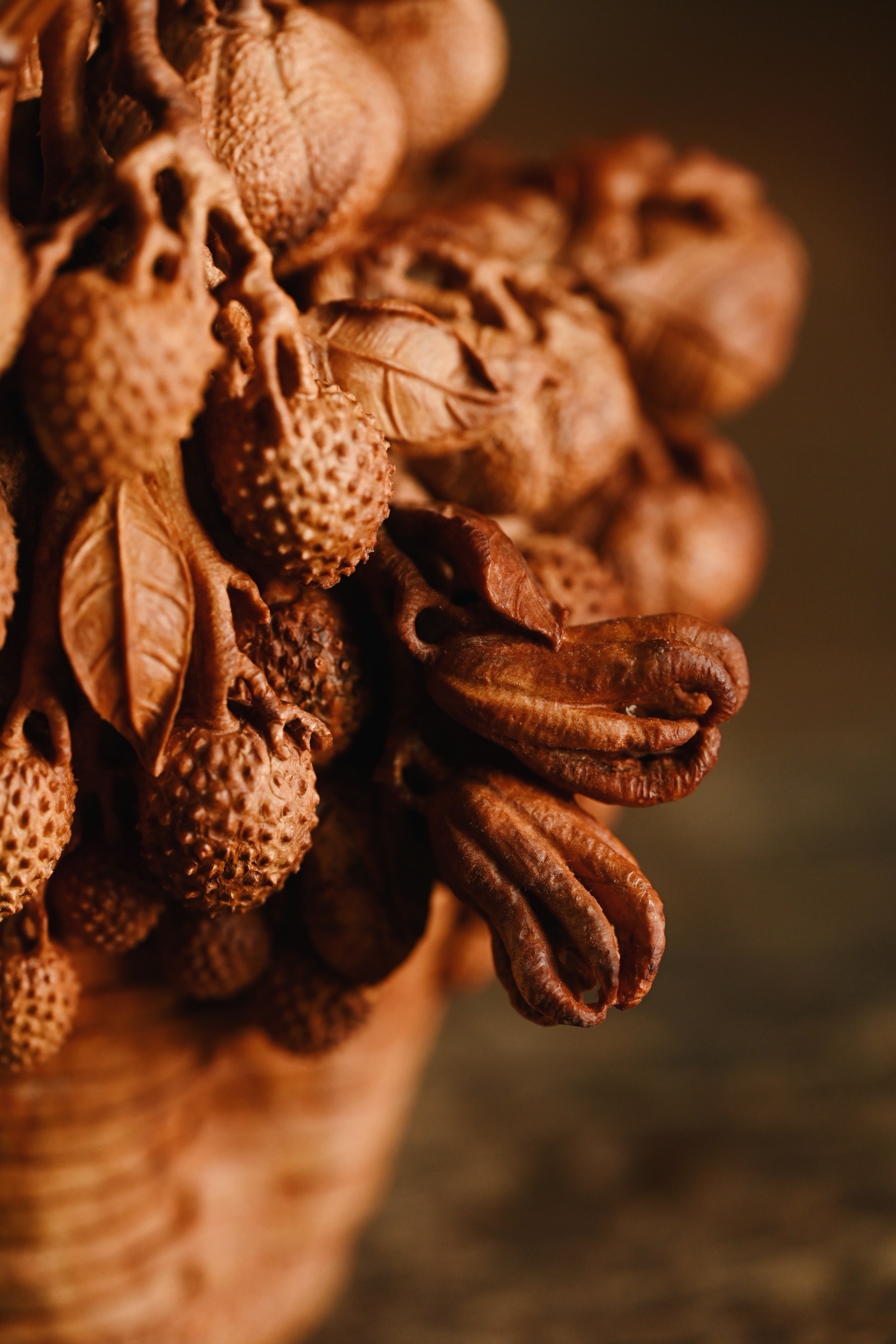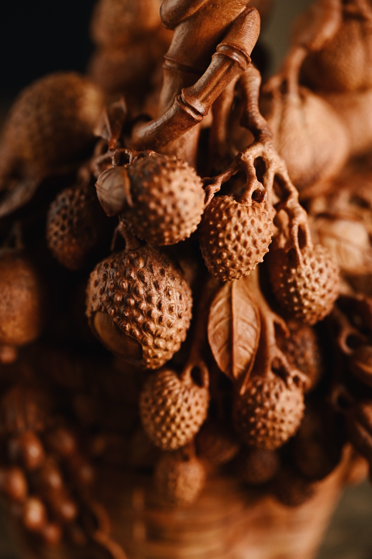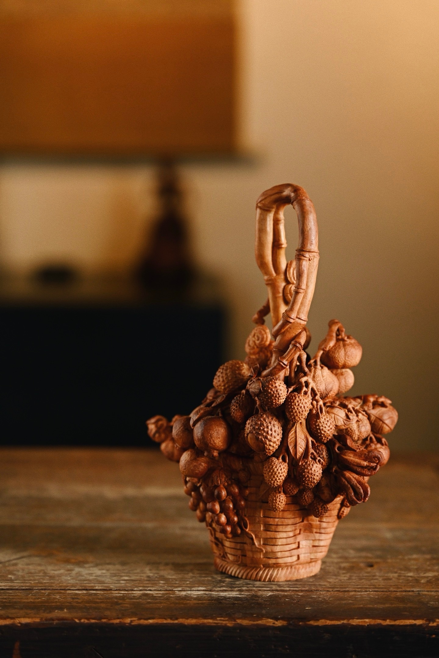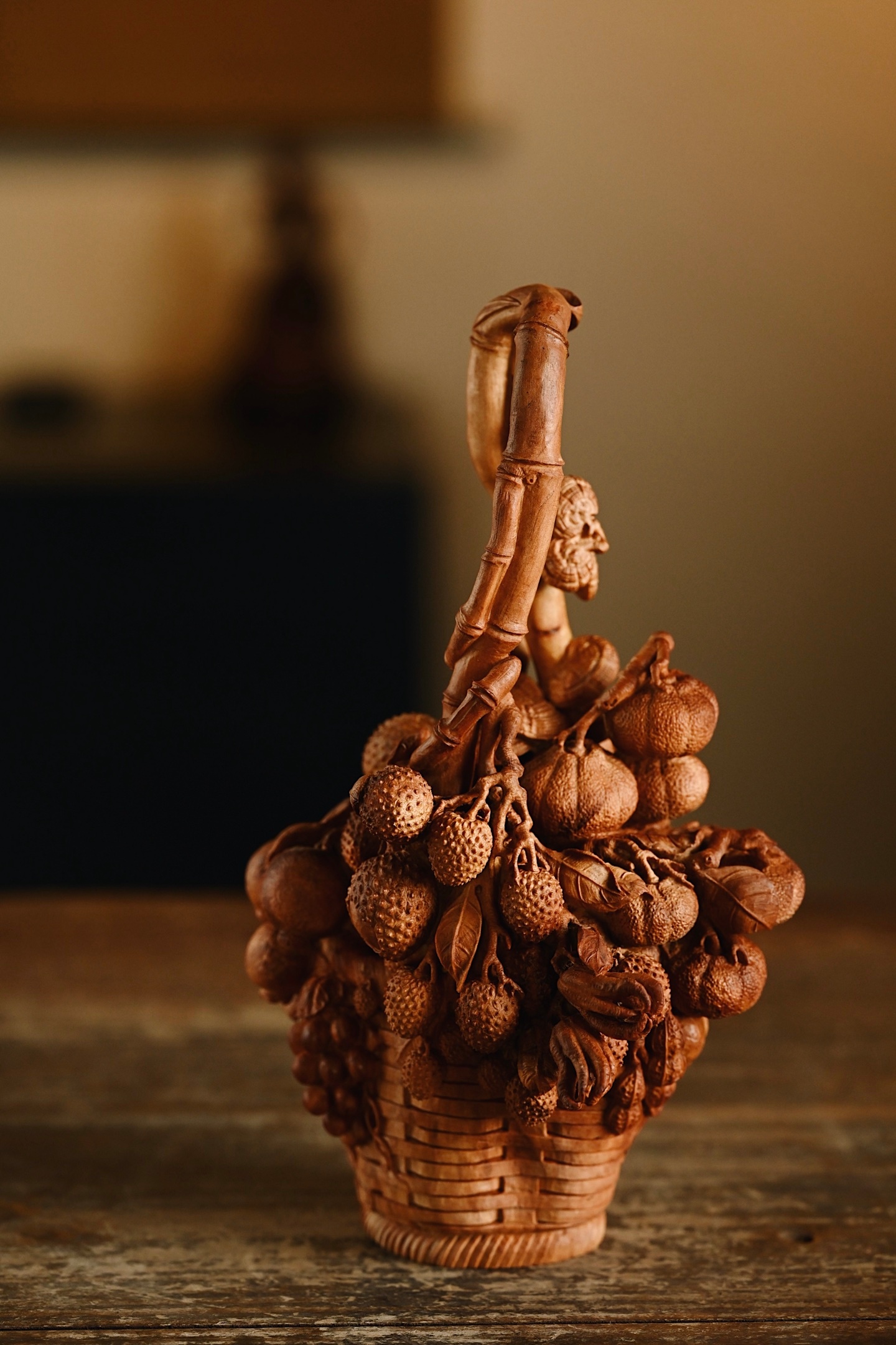 整料雕刻,立体圆雕技法,雕琢出一篮丰饶鲜果:荔枝饱满带刺,石榴裂壳露籽,佛手舒展如掌,葡萄成串垂坠,辅以竹节提梁与灵芝点缀,形态逼真,呼之欲出。篮身雕竹编纹理,经纬交织,层次分明,寓意“硕果累累、多子多福、富贵连绵”,是案头陈设、馈赠收藏的上佳之作。