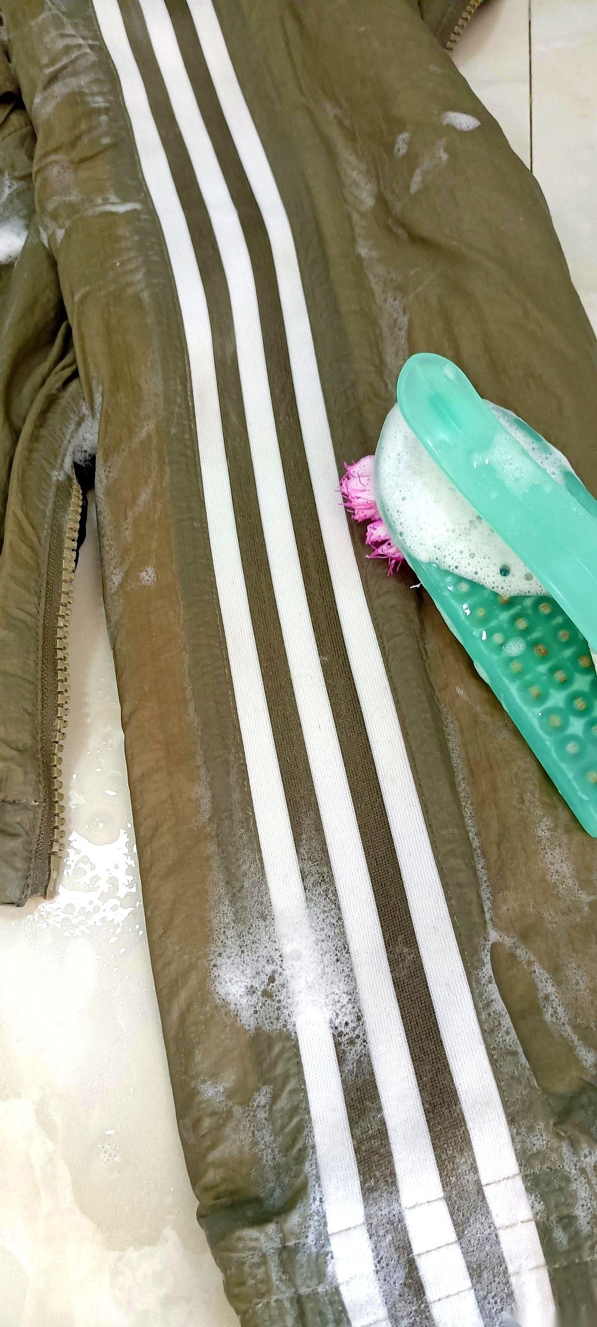 捞出来,不用拧,直接平铺在卫生间地上,拿刷子把重点部位刷一遍。扔进洗衣机,选羽绒服模式,或者最轻柔的那个模式,让它自己转。