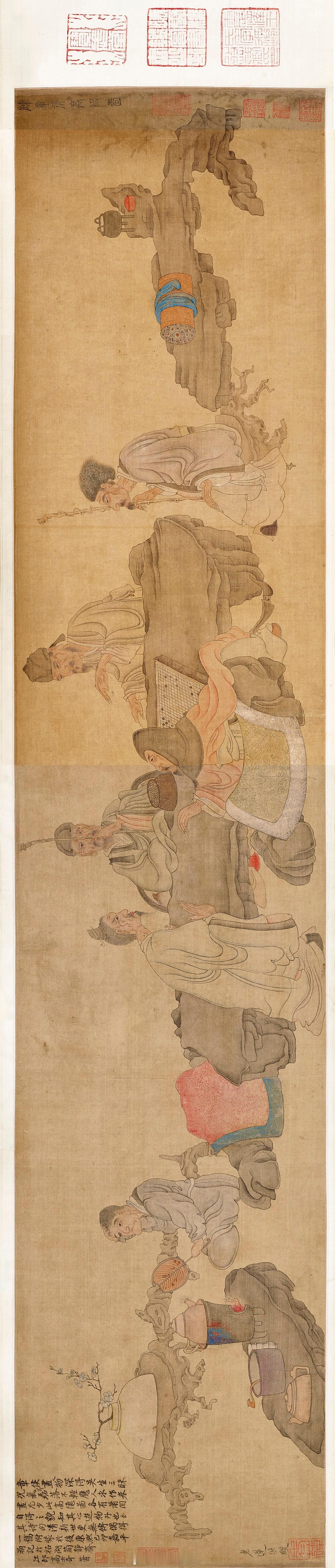 释文:雷峰墖下画船少,雷峰塔上虎啸多。所幸老莲已衰惫,若犹未也奈之何?外六桥头杨柳尽,里六桥头树亦稀。真实湖山今始见,老夫行过更依依。有书有酒看南山,更有芙蓉港一湾。同看红花三日去,不教看得白花还。乐山爱水来吴山,念水思山忆我乡。若得身吴而梦越,生前久矣在西方。久不过茂齐道弟,半阁半月,又不入南山看木樨,岂不有负秋香哉!已与坚约重阳前后,为断桥三日饮,不知当晴否耳?款识:老莲洪绶。钤印:洪绶、章侯高士奇(1645-1703)题跋:章侯画人物深得吴生三昧,况气节磊落不轻应人求作,卷画尤少。此《高隐图》各有萧閒自得之貌,知其心游物外也。至其诗句清新,世更无传。偶得一稿,附装于后。康熙己卯(1699)嘉平朔,记于柘湖简静斋。江邨高士奇竹窗。钤印:高士奇、澹人高士奇题跋:世间残编断简,弃置埋没者不知凡几。章侯诗文尤不传,余往往表而书者。去冬得其暨阳五洩图,笔墨沉酣,直过宋元,益信当日非浪博时名耳。康熙庚辰(1700),自正月十四日雷雨后,至二十一日始晴,梅花为雨所摧,尚有初开者,瑞香馥郁,初疑兰麝。料峭春寒,閒居无事,再书《高隐图》后。江邨高士奇。钤印:寻孔颜乐、澹人庚辰题此时,舆儿公车在北,轩儿侍余左右,岂料是年十月轩儿物外,今日触境慨然。壬午(1702)正月廿二日雨窗记儿舆入武林。钤印:杏花春雨江南藏印:高士奇:江村士奇之章王世杰(1891-1981):雪廷图书、王世杰印王季迁(1907-2003):宝武堂、怀云楼鑑赏书画之记、震泽王氏季迁收藏印、王季迁氏审定真迹、王季迁海外所见、季迁心赏名迹、王季迁印、怀云楼其他:百福庵书画记、萧兀斋、曾藏泰药爵家签条:陈老莲诗画合璧卷。高江村旧藏。
