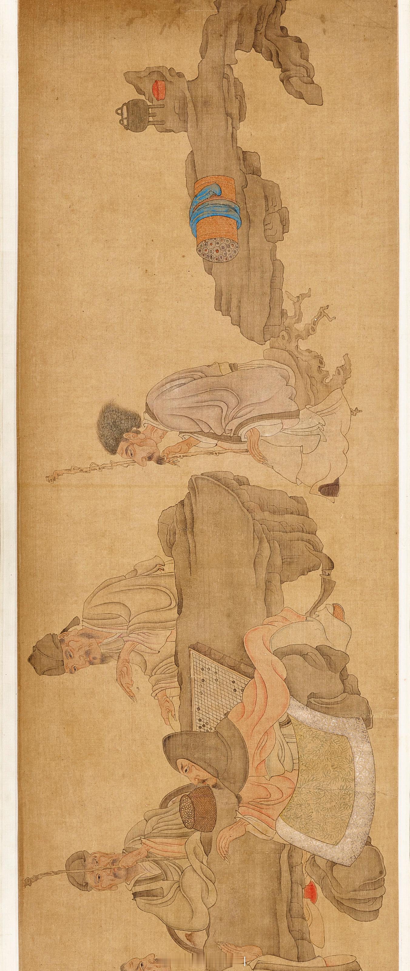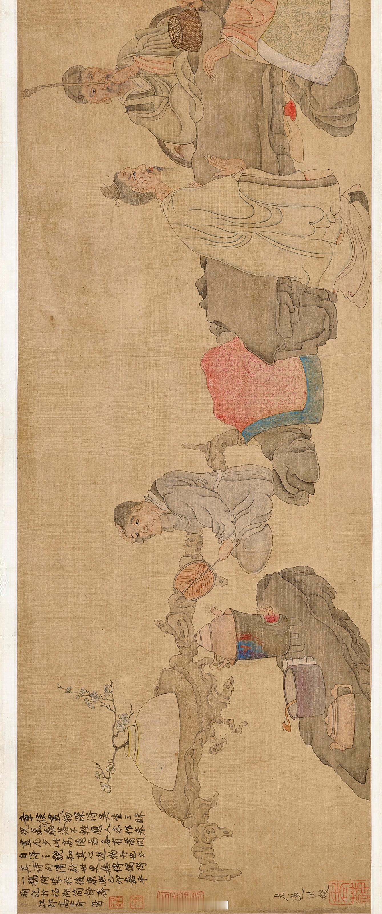 此卷《高隐图并诗稿卷》前画后诗,画中二人据石相坐对弈,旁有柱杖观者,数人或蓬髮或冠或帽,面容清癯肃穆,衣衫拙朴,手指造型奇古。后有一童子持扇煮茶,泥炉透红火,与身前冷梅遥相对应。老莲画中多写鼎彝奇器卷轴,实用之外,还有以物寓古,寄託精神的作用。诗作书法用笔举重若轻,写杭州西湖及雷峰塔景緻,见于陈洪绶诗集,其中「念水思山忆我乡」,情思溢于纸上。卷后高士奇三次题跋,可见珍重宝爱。前跋说「卷画尤少」,人物有「萧閒自得之貌」,而书法稿「诗句清新」,为他偶得,故此装合为一卷。高士奇距陈老莲不过数十年,所言可信,此卷之珍贵,自不待言。