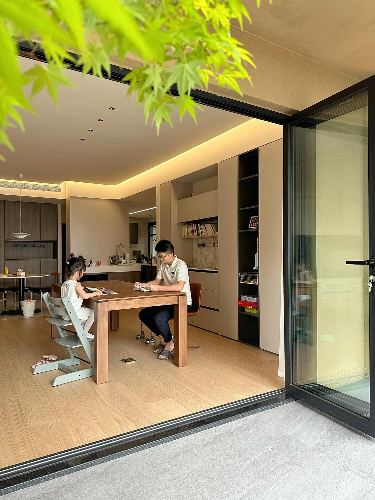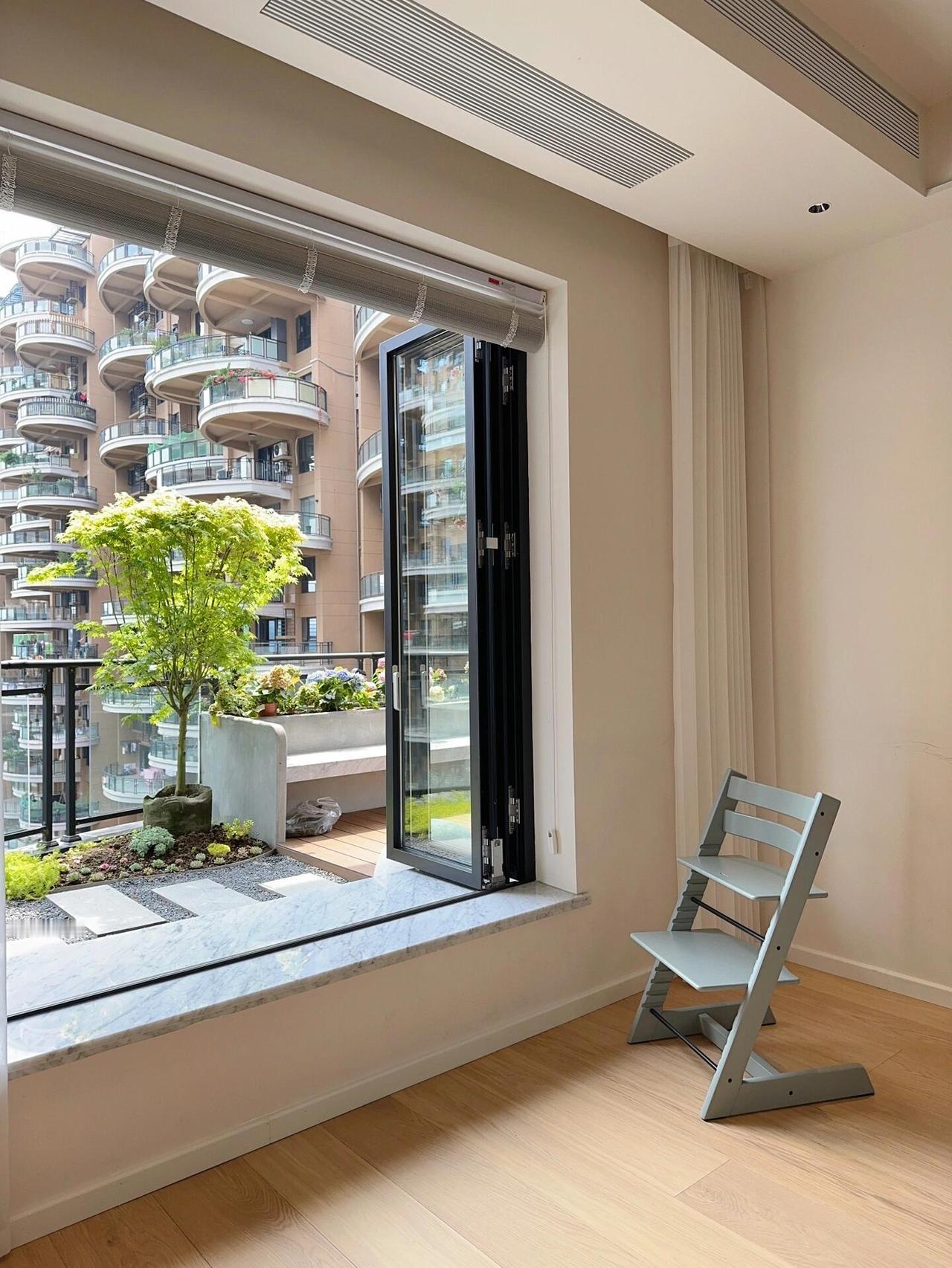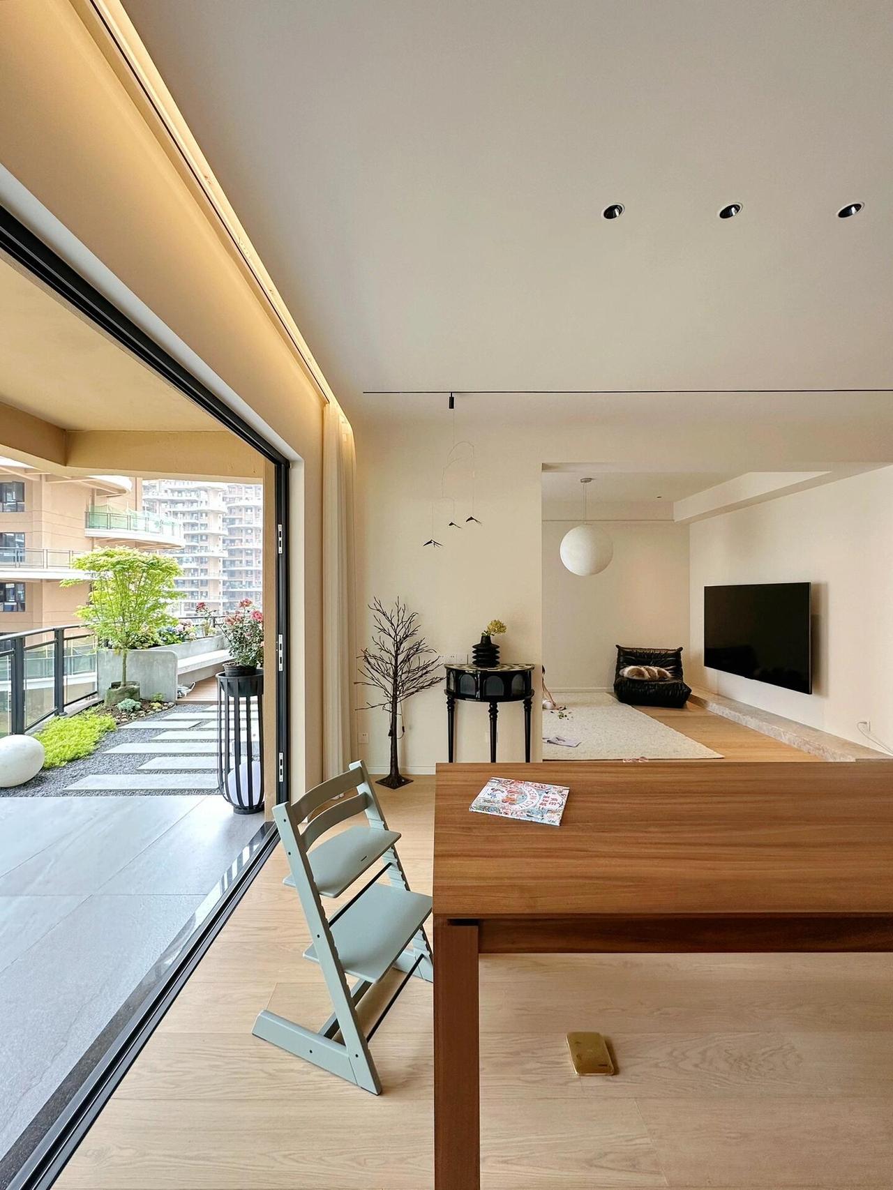 最拉满幸福感的是那个50平米的大露台,房主说没有过多折腾,只是铺了地砖和防腐木,种了些小植物,剩下就是一家人跑跑跳跳、夏天乘凉冬天看雪。