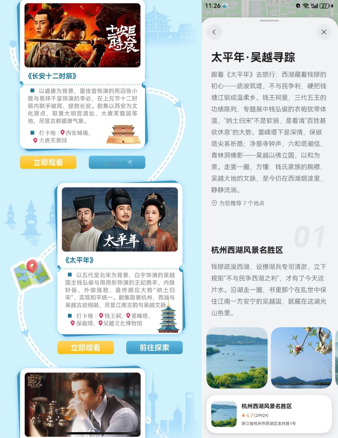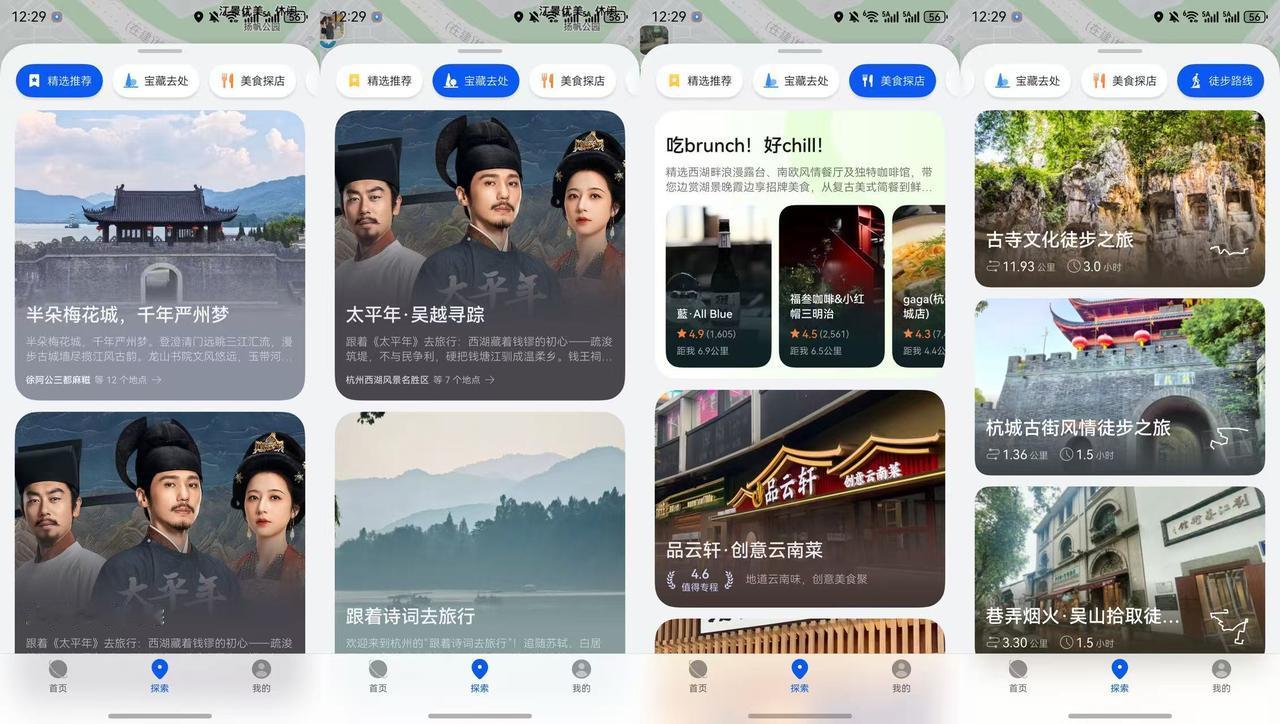 有华为手机的朋友其实可以关注下这个活动,里面直接帮你把影视内容里涉及到的旅行地点整理了出来,比如说《长安十二时辰》里面的西安大明宫遗址,《太平年》里江南古韵的杭州,《快乐再出发·山海季》的美丽青海之类的,点一下就能直接跳转到华为视频,汇聚芒优腾爱四大主流平台的新热内容,全网同步首播、实时更新;也可以顺着跳到花瓣地图查看地点信息、路线规划和目的地指南。