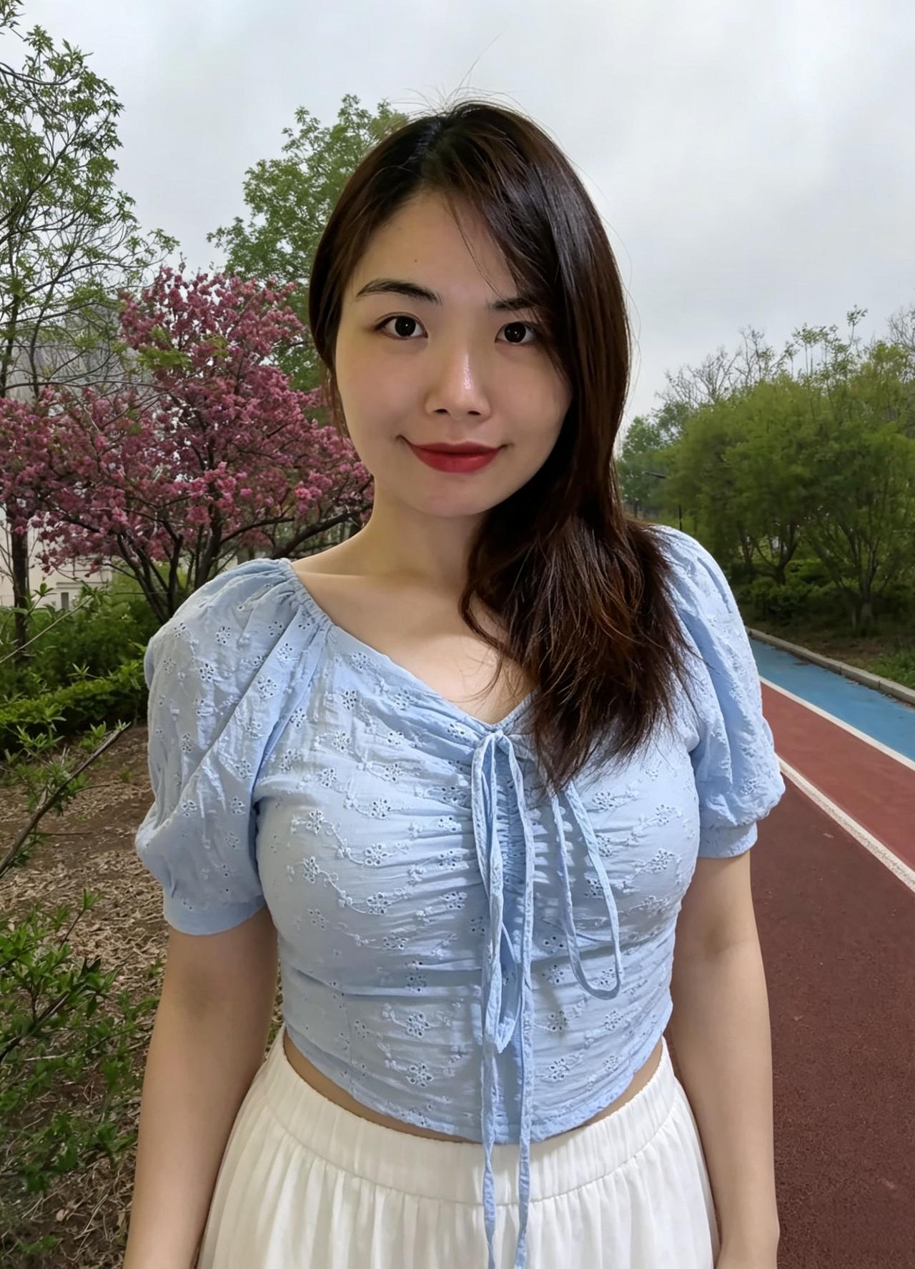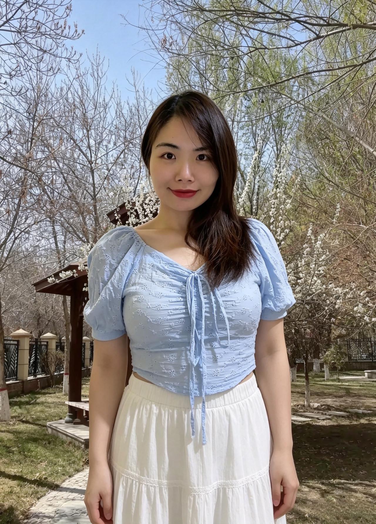 浅蓝罗袖衬春光, 花海层层绕身旁。 一笑嫣然添秀色, 风华温婉满庭芳。