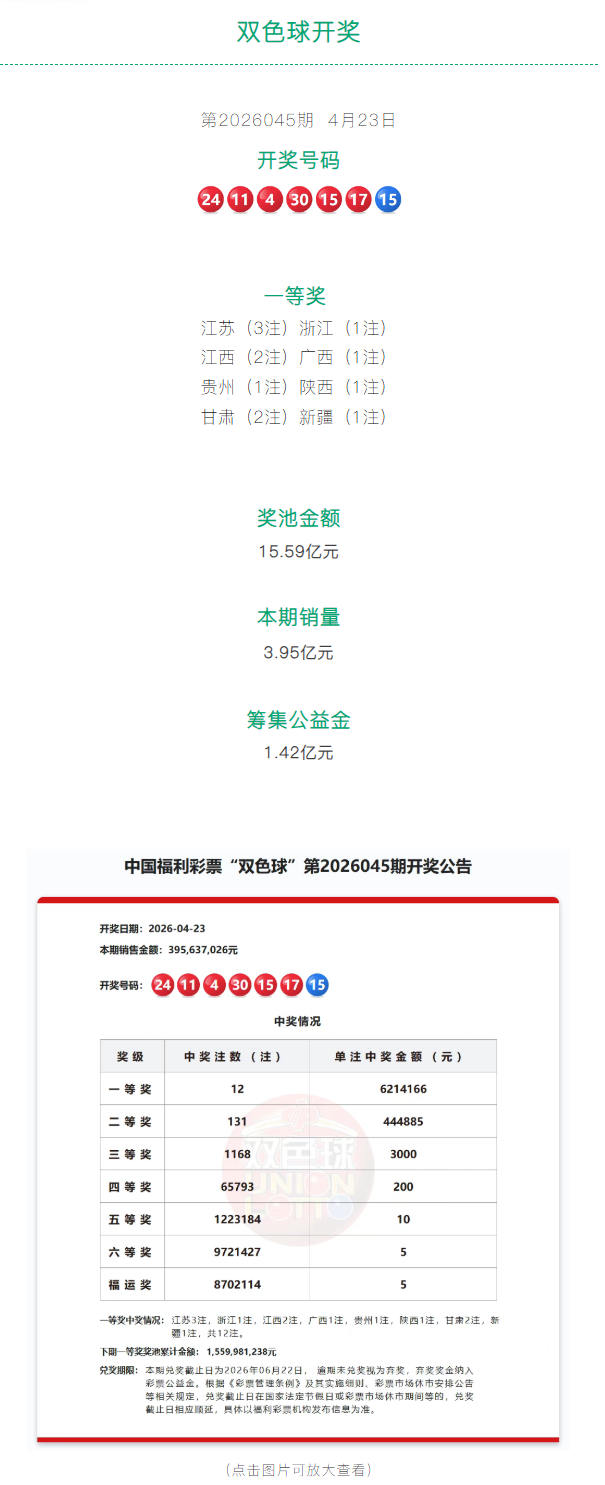 开奖号码为:24、11、04、30、15、17、15。本期共中出一等奖12注,分别落在江苏3注、江西2注、甘肃2注,浙江、广西、贵州、陕西、新疆各1注。