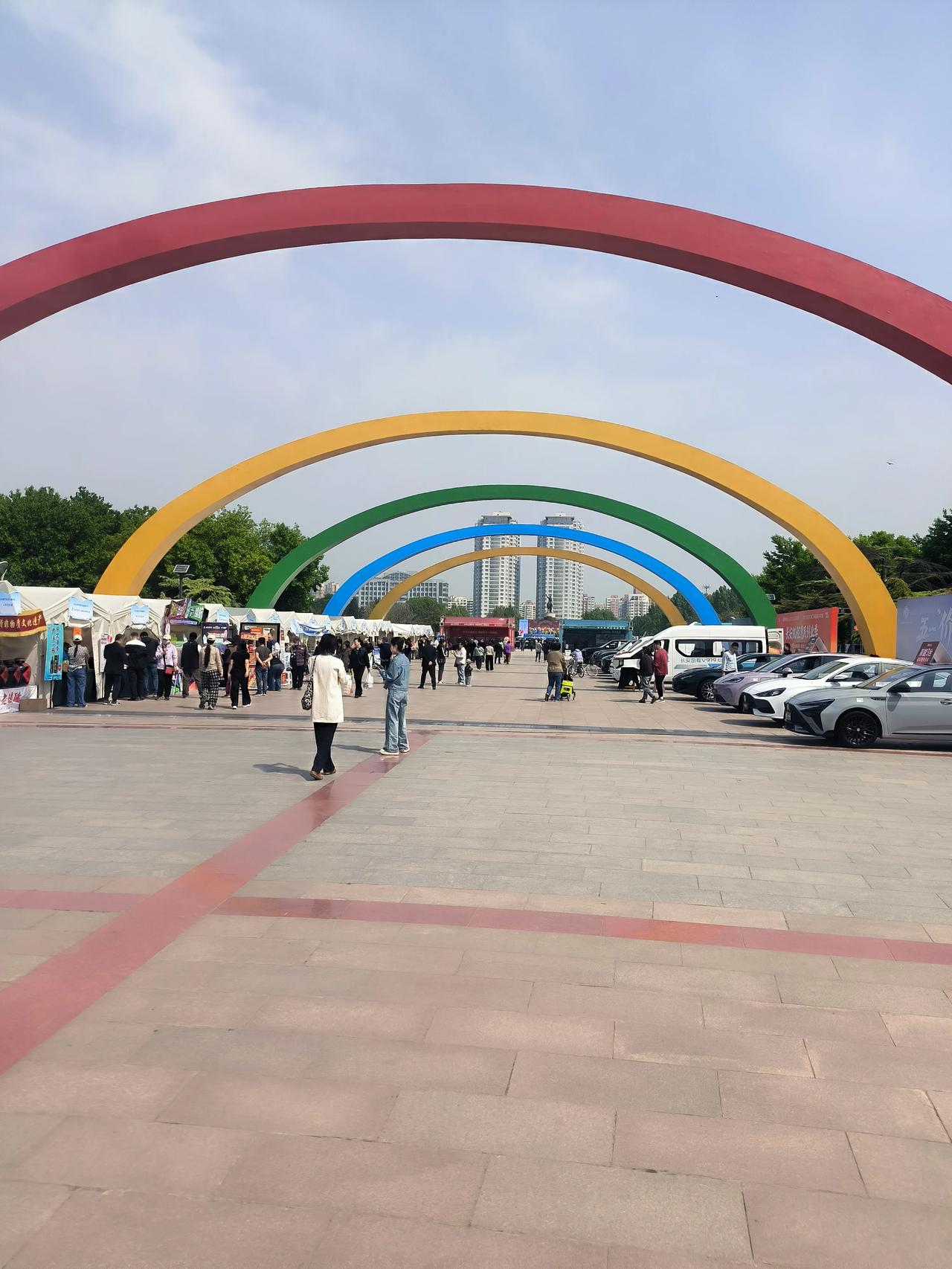 顺着彩虹桥往里走,两侧展位琳琅满目:电动车、特色美食、房产、汽车展销一应俱全,整体氛围就像一场综合性城市博览会。