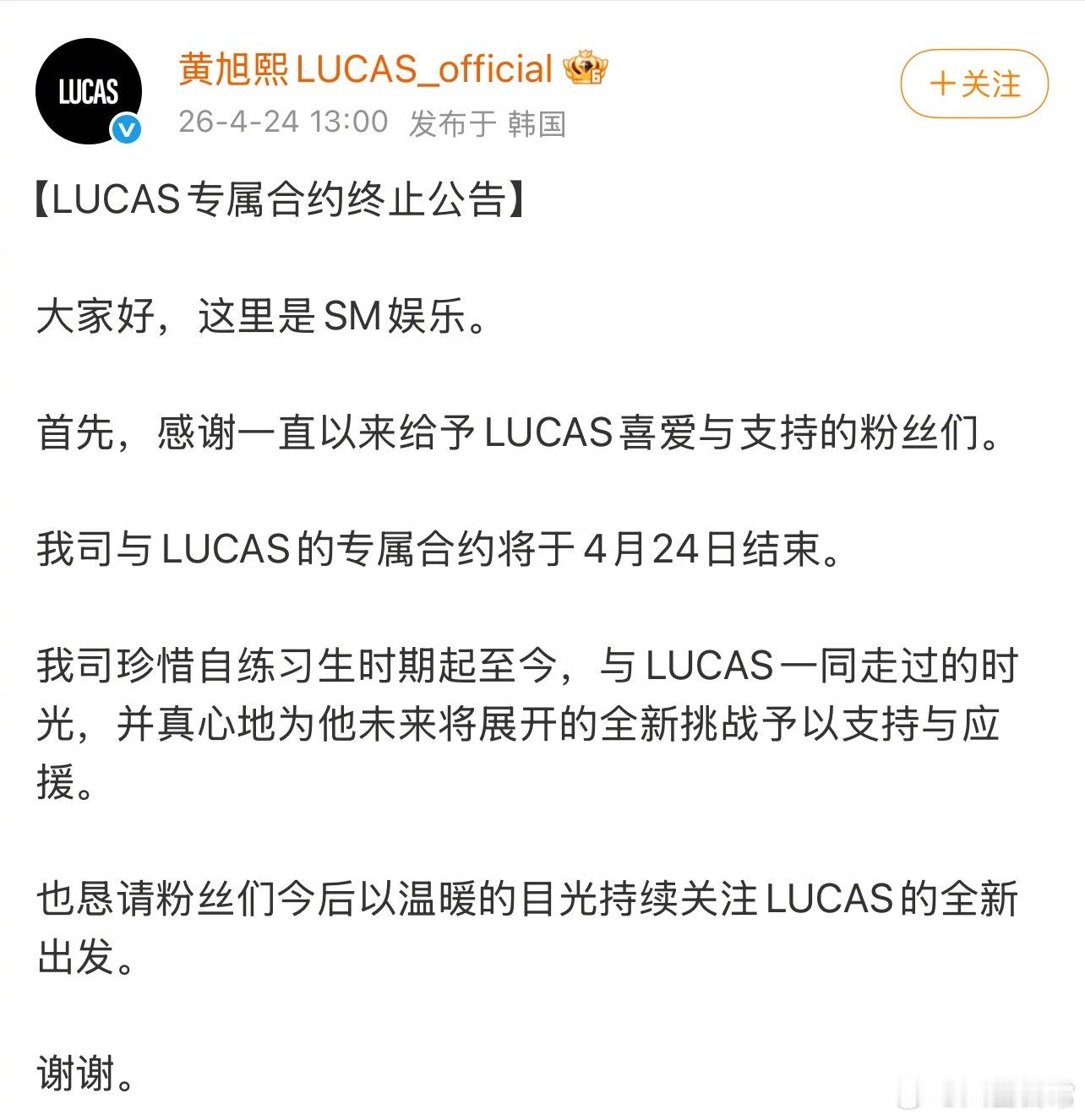 黄旭熙和SM娱乐的合约结束了