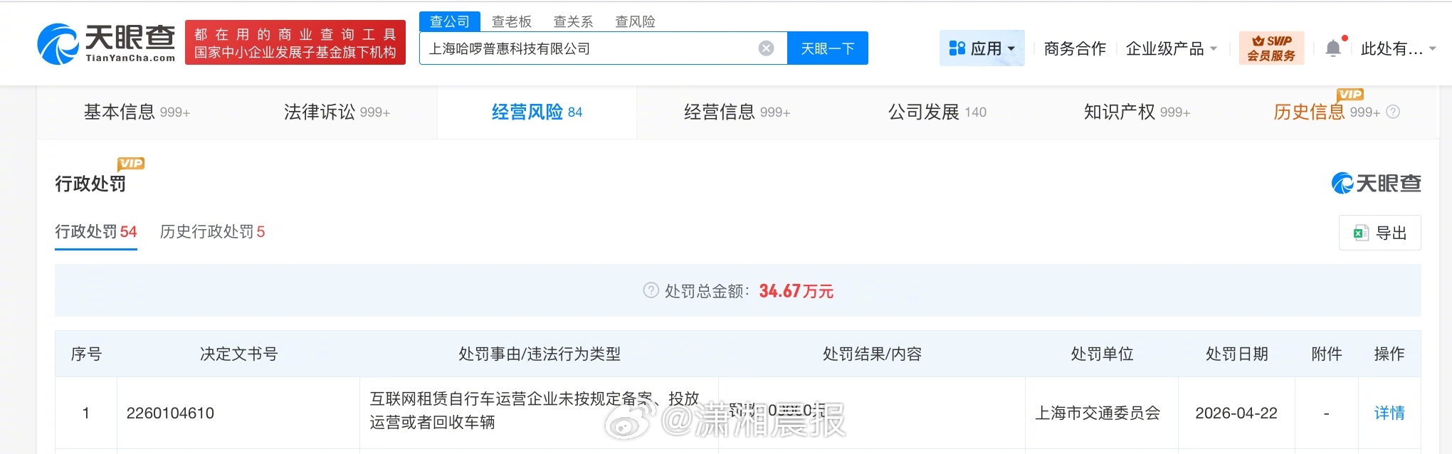 【#哈啰出行因未按规定投放车辆被罚#】#哈啰出行违规投放车辆被罚10万#天眼查App显示,近日,上海哈啰普惠科技有限公司因互联网租赁自行车运营企业未按规定备案、投放运营或者回收车辆,被上海市交通委员会罚款10万元。