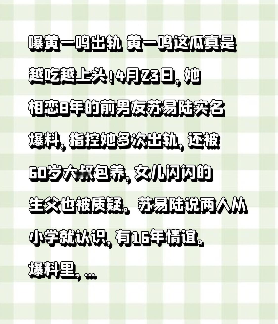 曝黄一鸣出轨 黄一鸣这瓜真是越吃越上头!4月23日,她相恋8年的前男友苏易陆实名