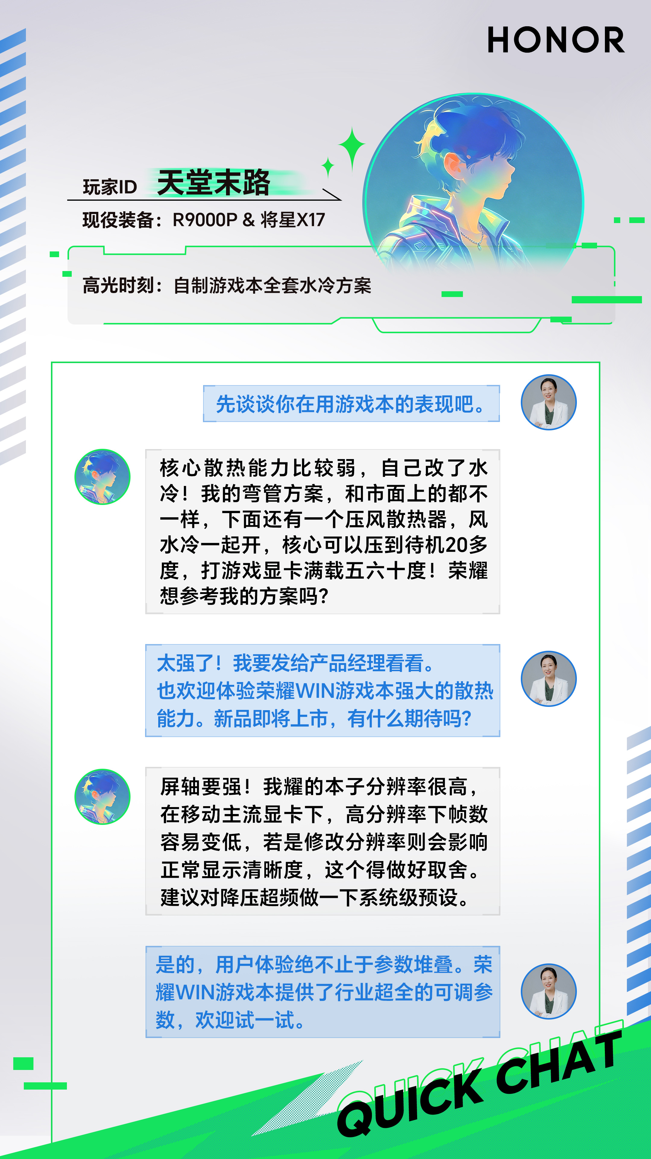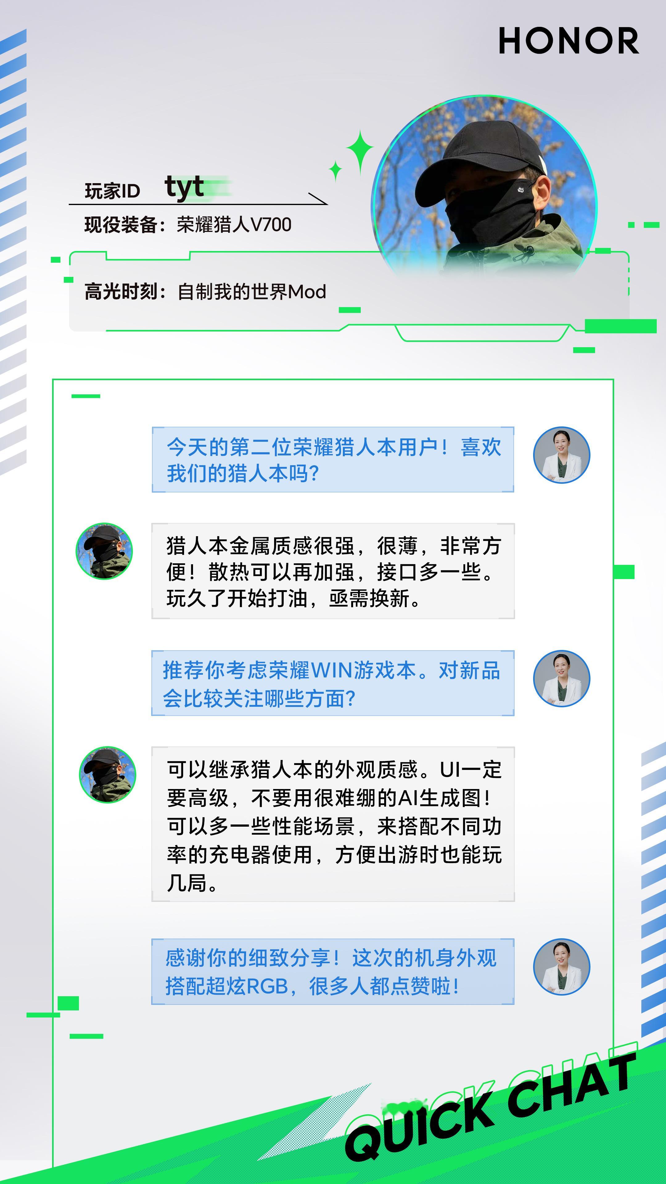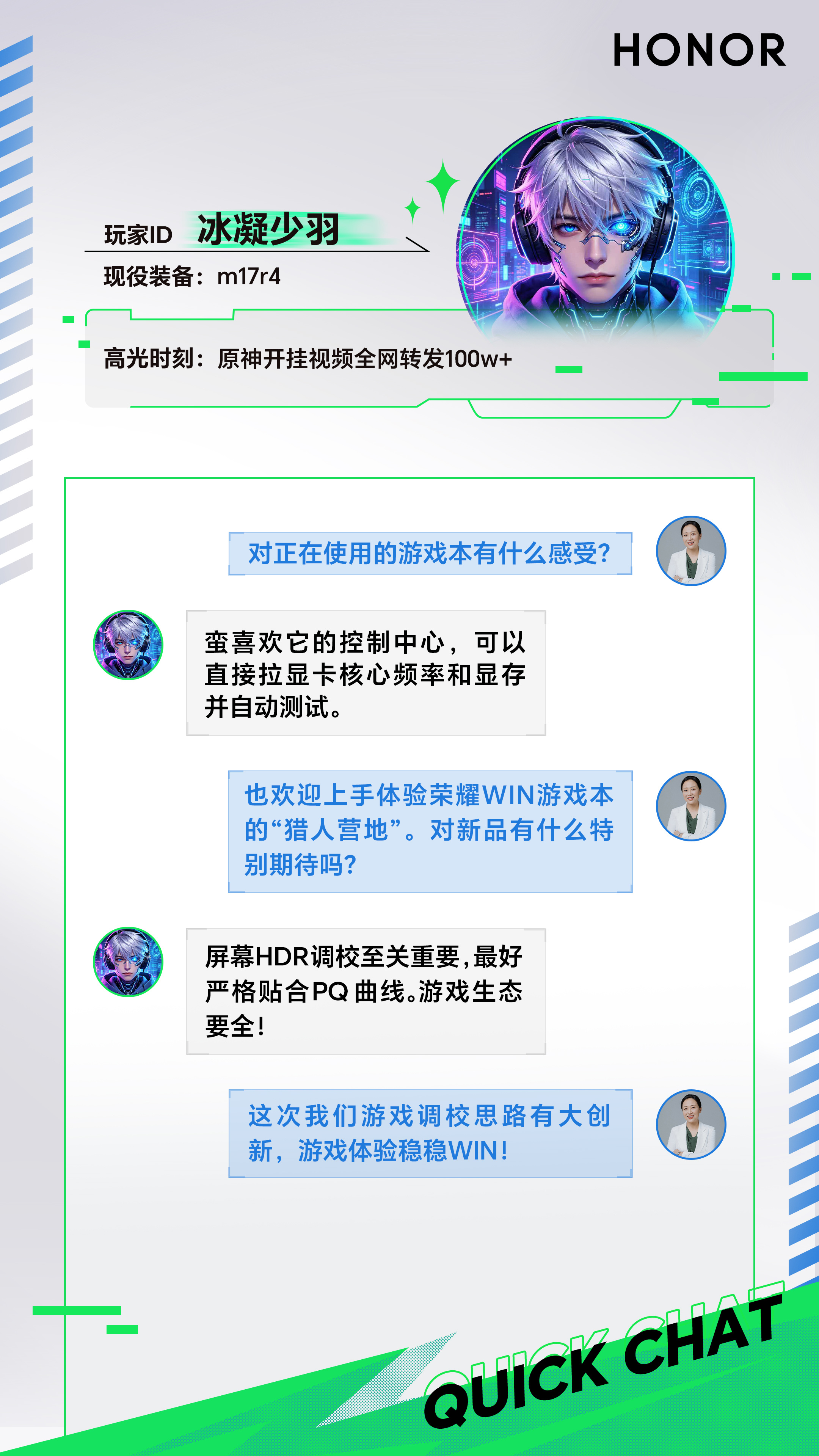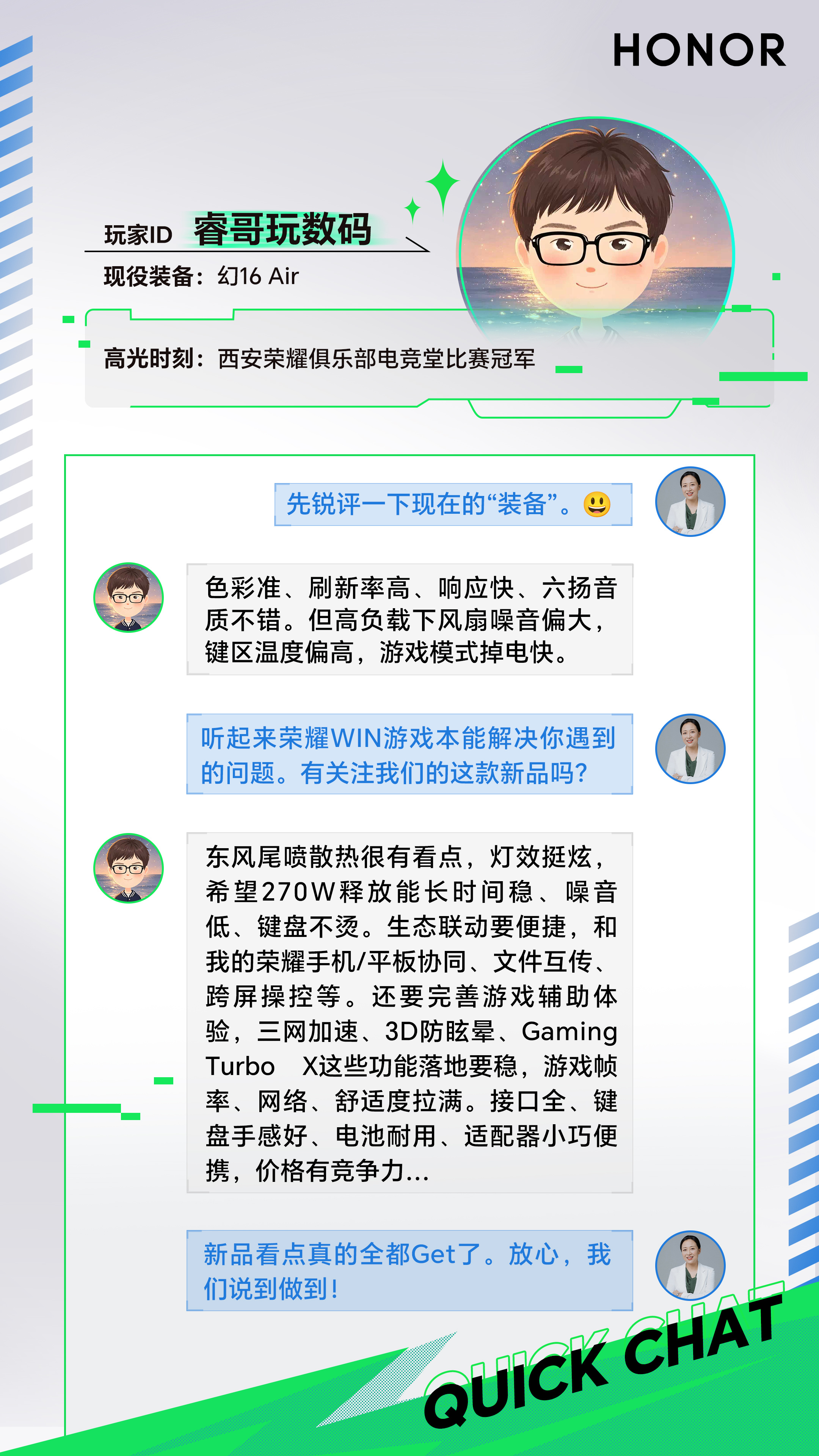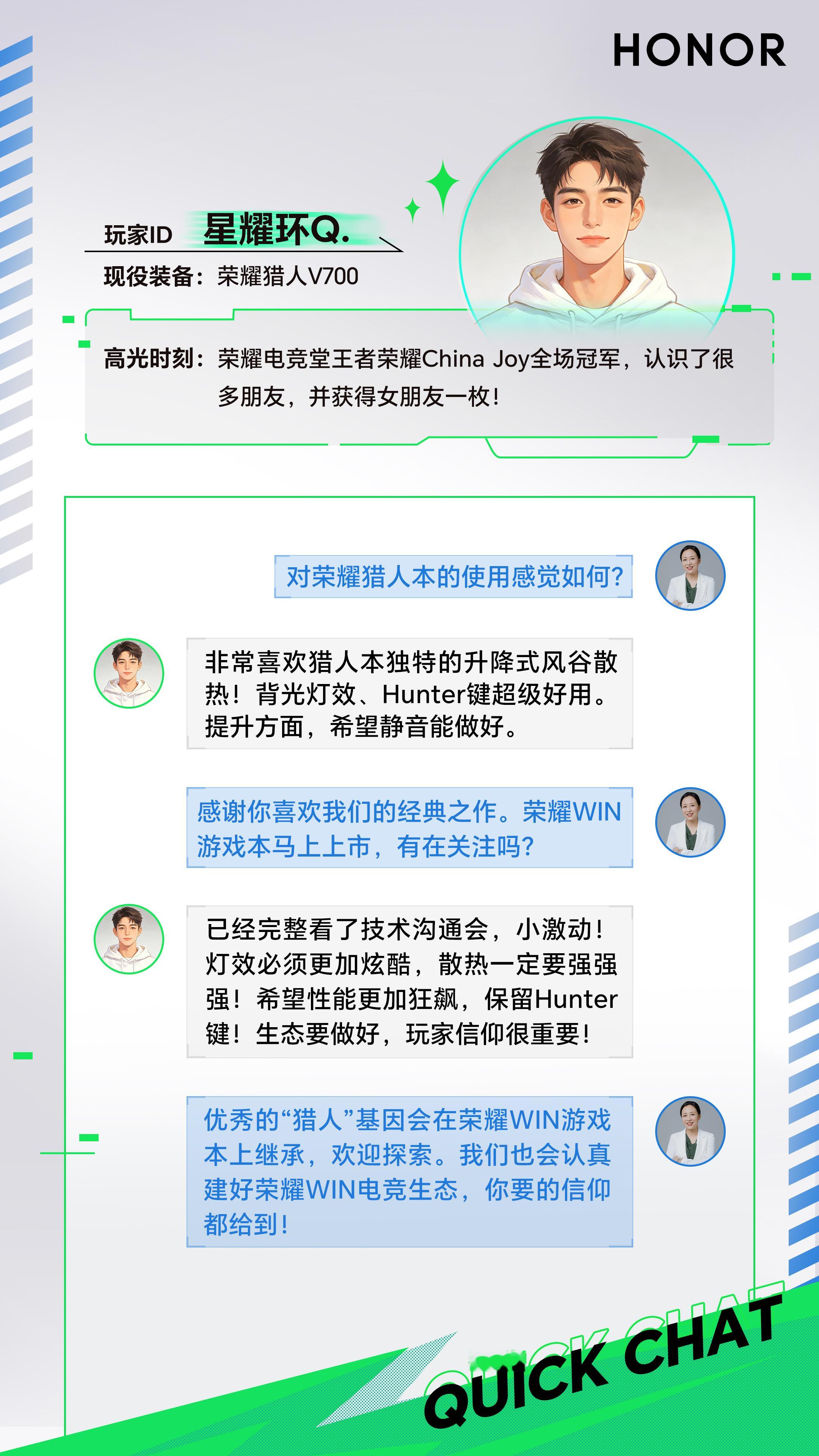 荣耀WIN系列游戏本发布在即,看到很多朋友都非常关注。为了回应这份期待,我们特别连麦了几位玩家朋友,来了一场有趣的“隔空开箱”式对话。听听他们在意什么、想要什么,或许你想要的答案都在这里。期待和各位玩家一起,用全新荣耀WIN游戏本,赢下新的精彩!欢迎大家说说你对荣耀WIN游戏本的期待。
