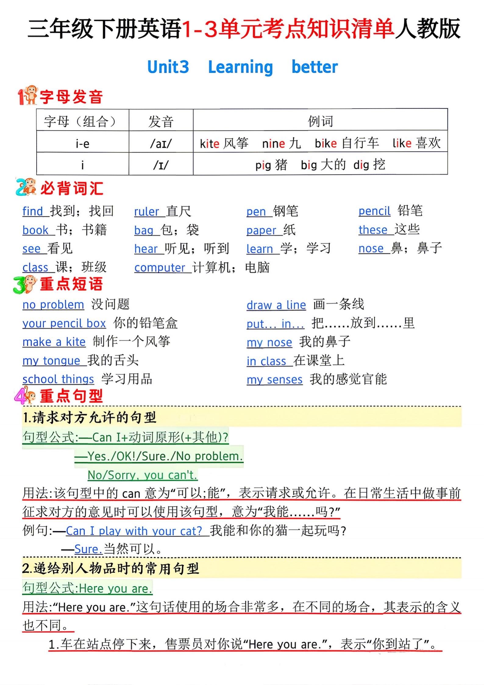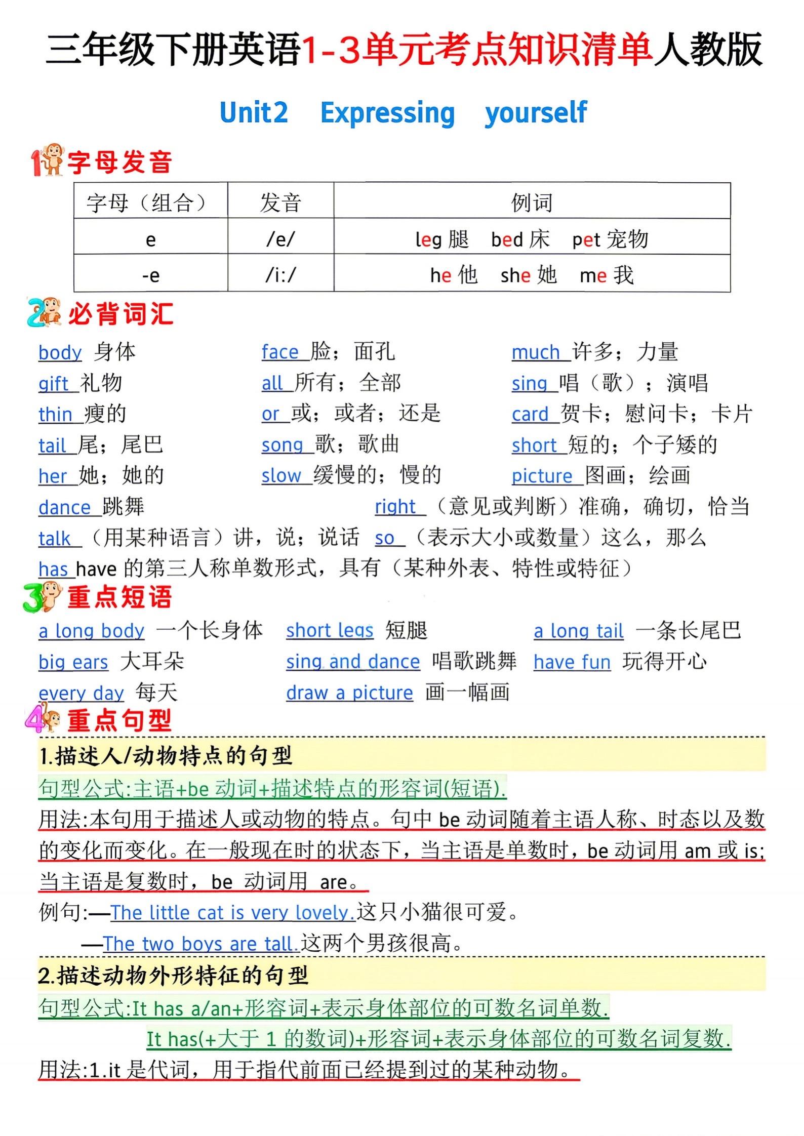三年级下册英语1-3单元考点,直接抄!教了6年小学英语,期中复习我只抓这些高频考点!