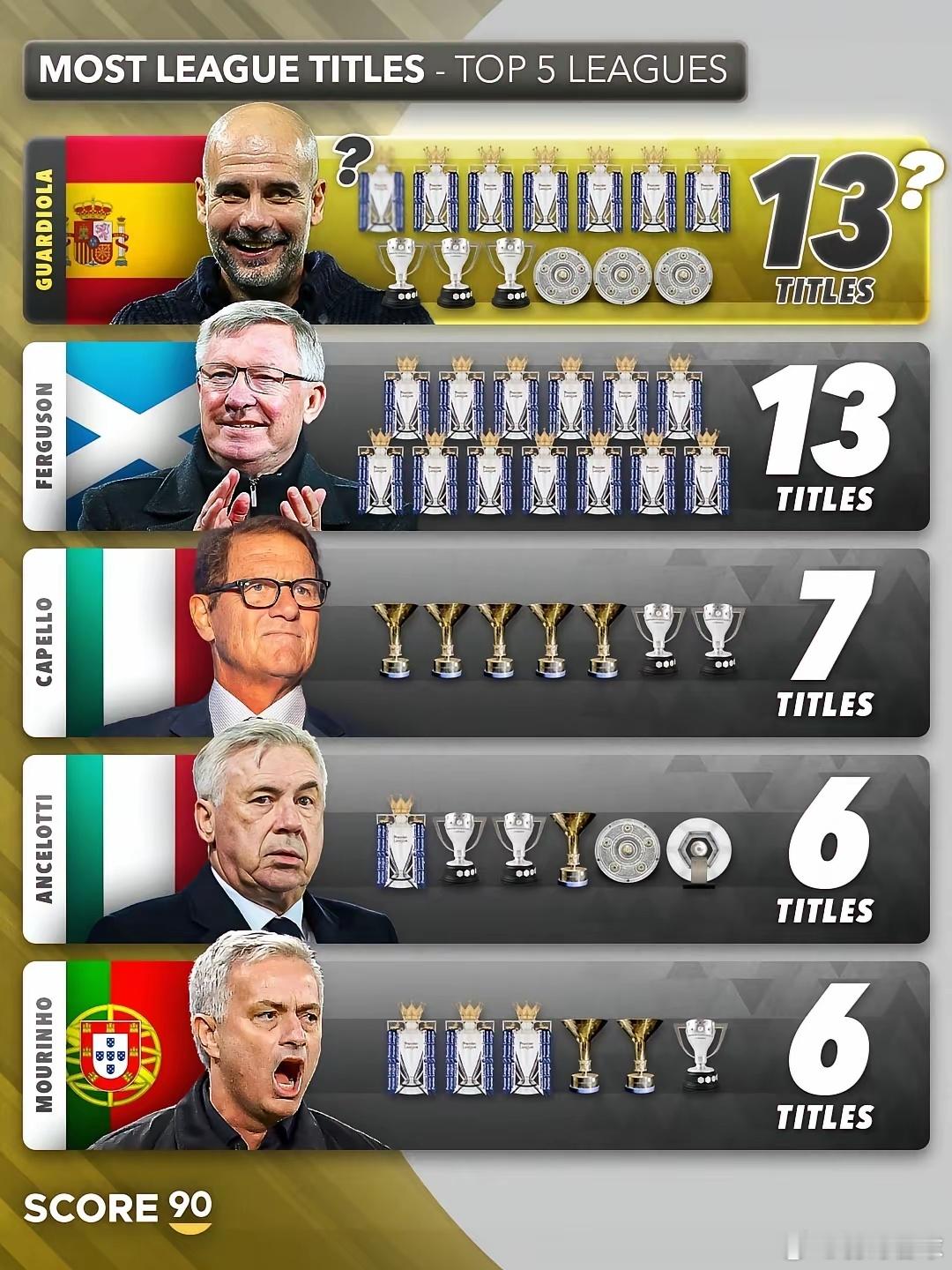 少赛一场仅落后阿森纳3分!假如本赛季曼城最终夺冠!瓜迪奥拉有希望追平历史记录!据相关数据统计,瓜迪奥拉目前在五大联赛已夺得12次联赛冠军,只差一个冠军就可以追平曼联传奇主教练弗格森爵士的13座联赛的记录!并列足坛史上五大联赛夺冠最多的主教练!只要下一轮曼城拿下伯恩利,联赛积分就跟阿森纳同分,双方回到同一起跑线上,瓜迪奥拉非常有希望追平此记录!英超