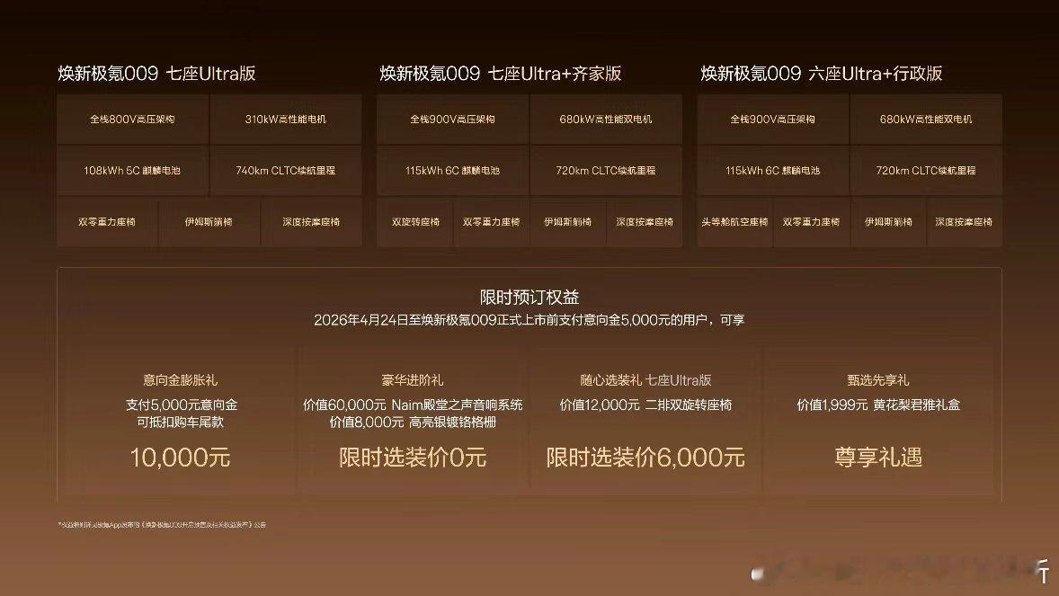 焕新极氪009在北京车展开启预售,推出了七座 Ultra+齐家版等三款车型。